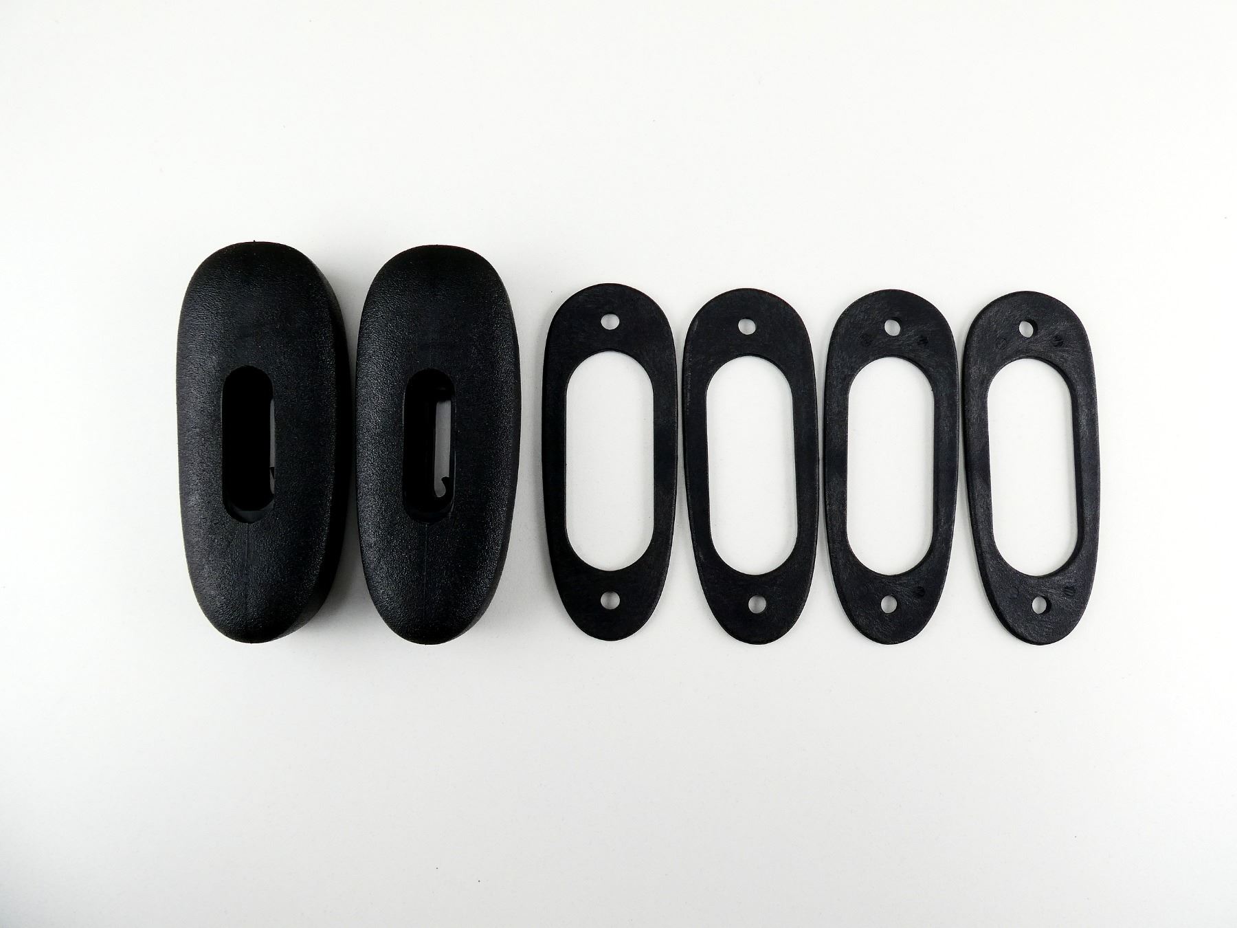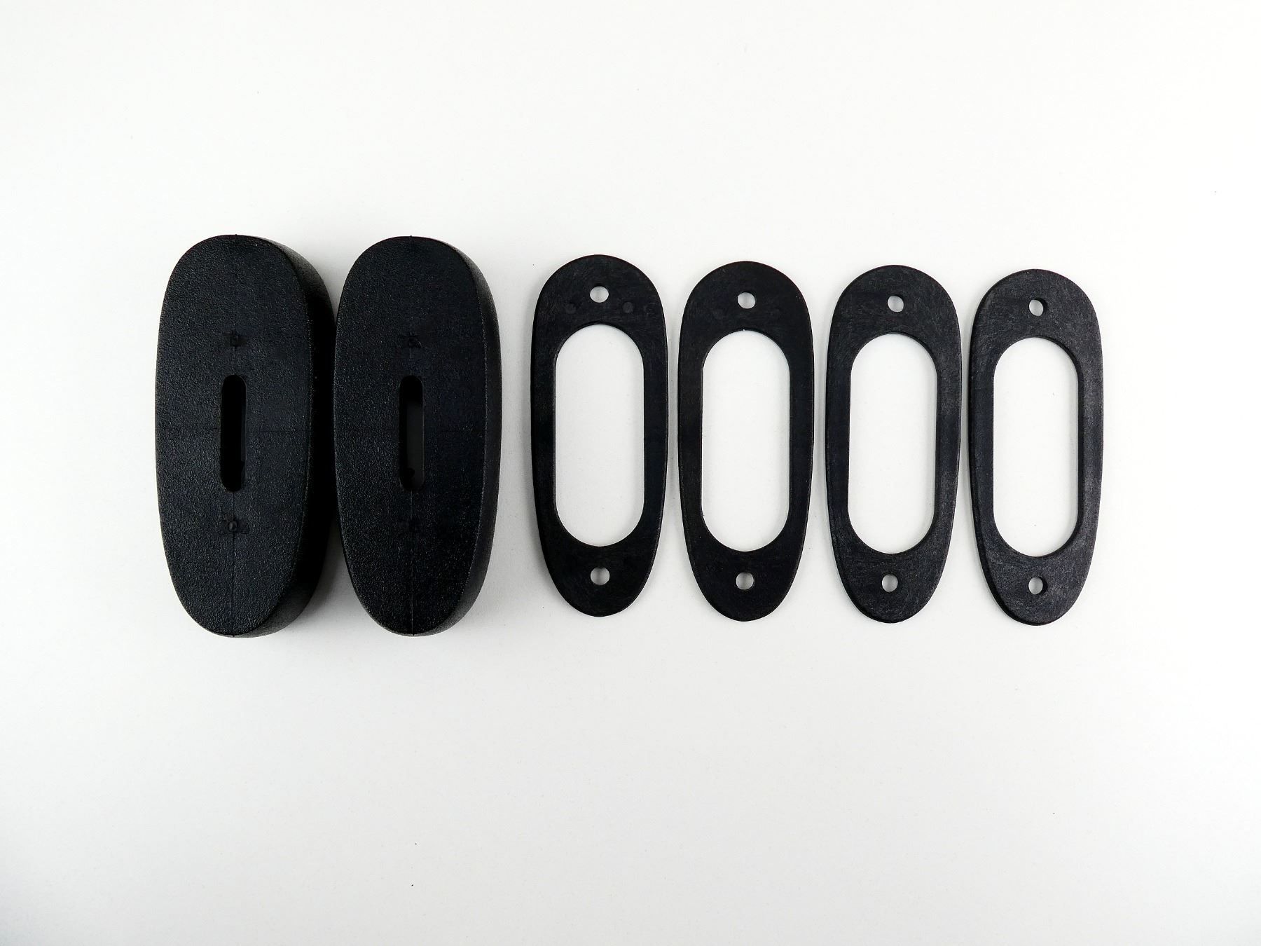 LOT INCLUDES; (2) UNKNOWN BLACK POLYMER BUTT PLATES, UNMARKED & (4) BLACK POLYMER SPACERS. MAY REQUIRE FITTING. SEE PHOTOS.