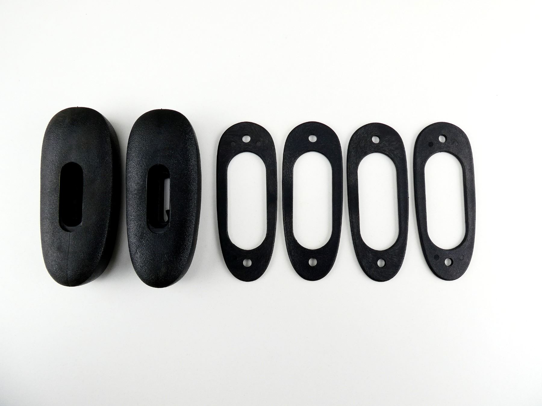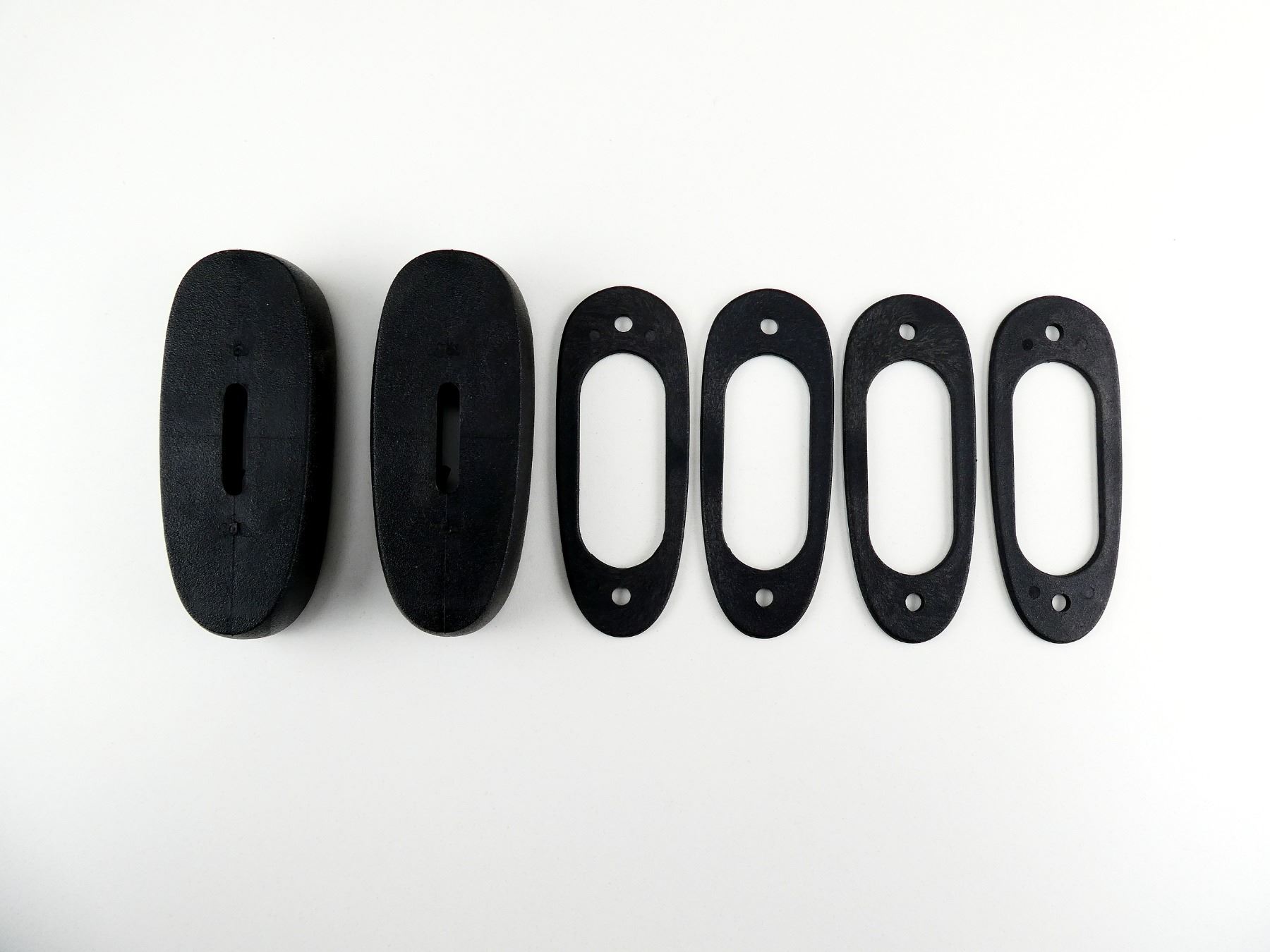 LOT INCLUDES; (2) UNKNOWN BLACK POLYMER BUTT PLATES, UNMARKED & (4) BLACK POLYMER SPACERS. MAY REQUIRE FITTING. SEE PHOTOS.