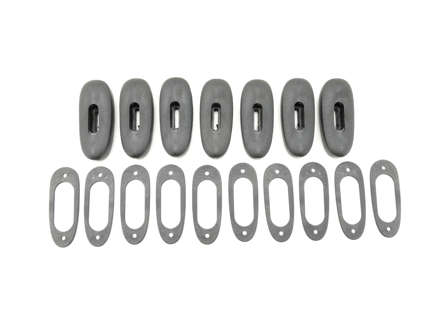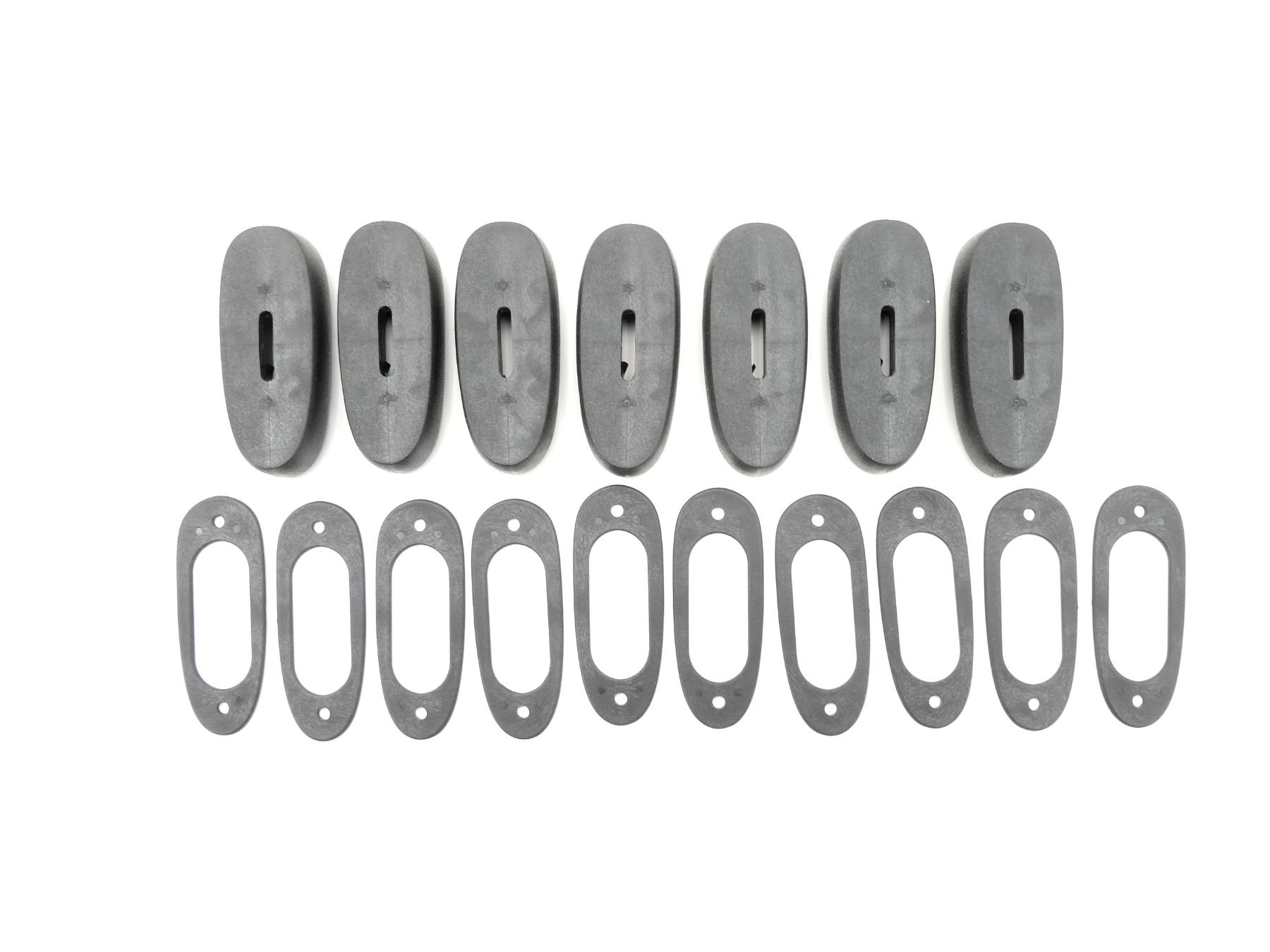 LOT INCLUDES; (7) UNKNOWN BLACK POLYMER BUTT PLATES, UNMARKED & (10) BLACK POLYMER SPACERS. MAY REQUIRE FITTING. SEE PHOTOS.