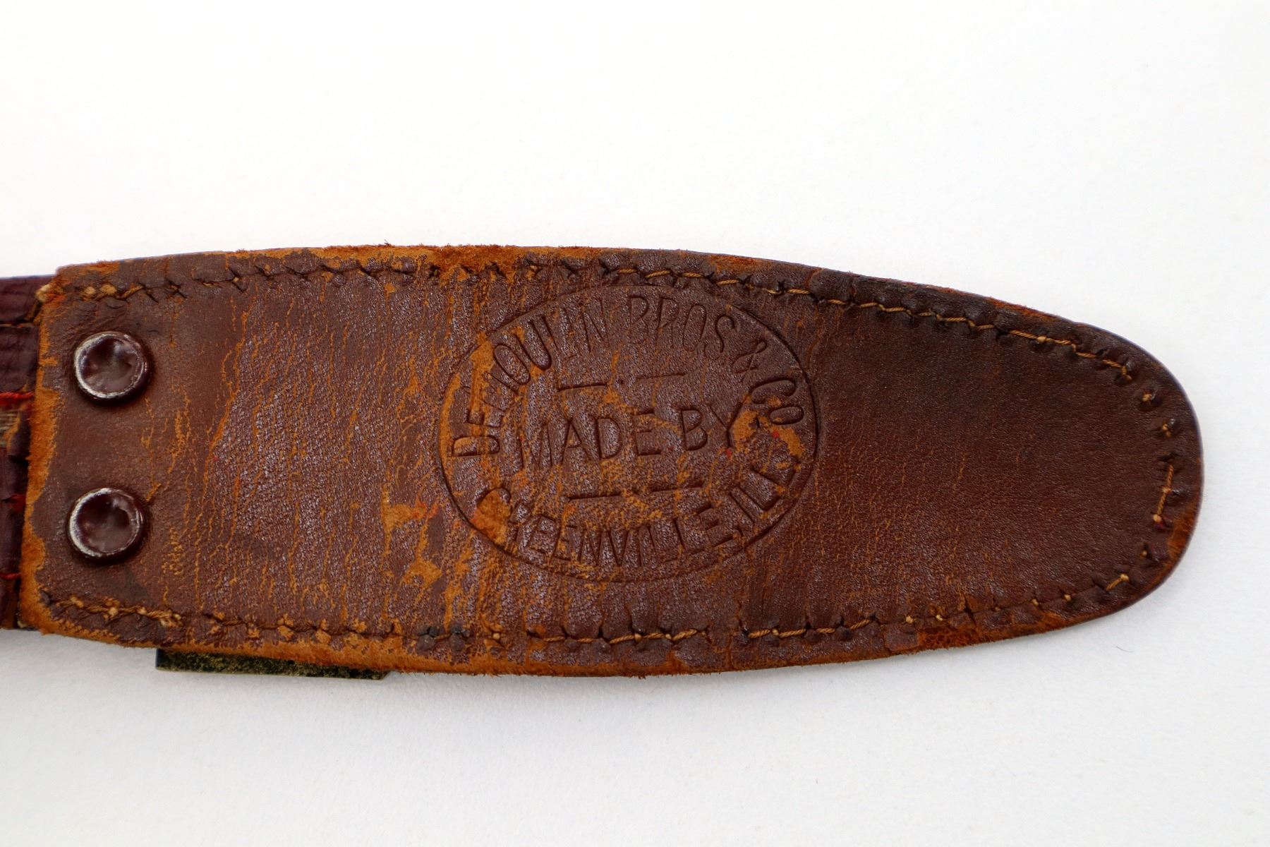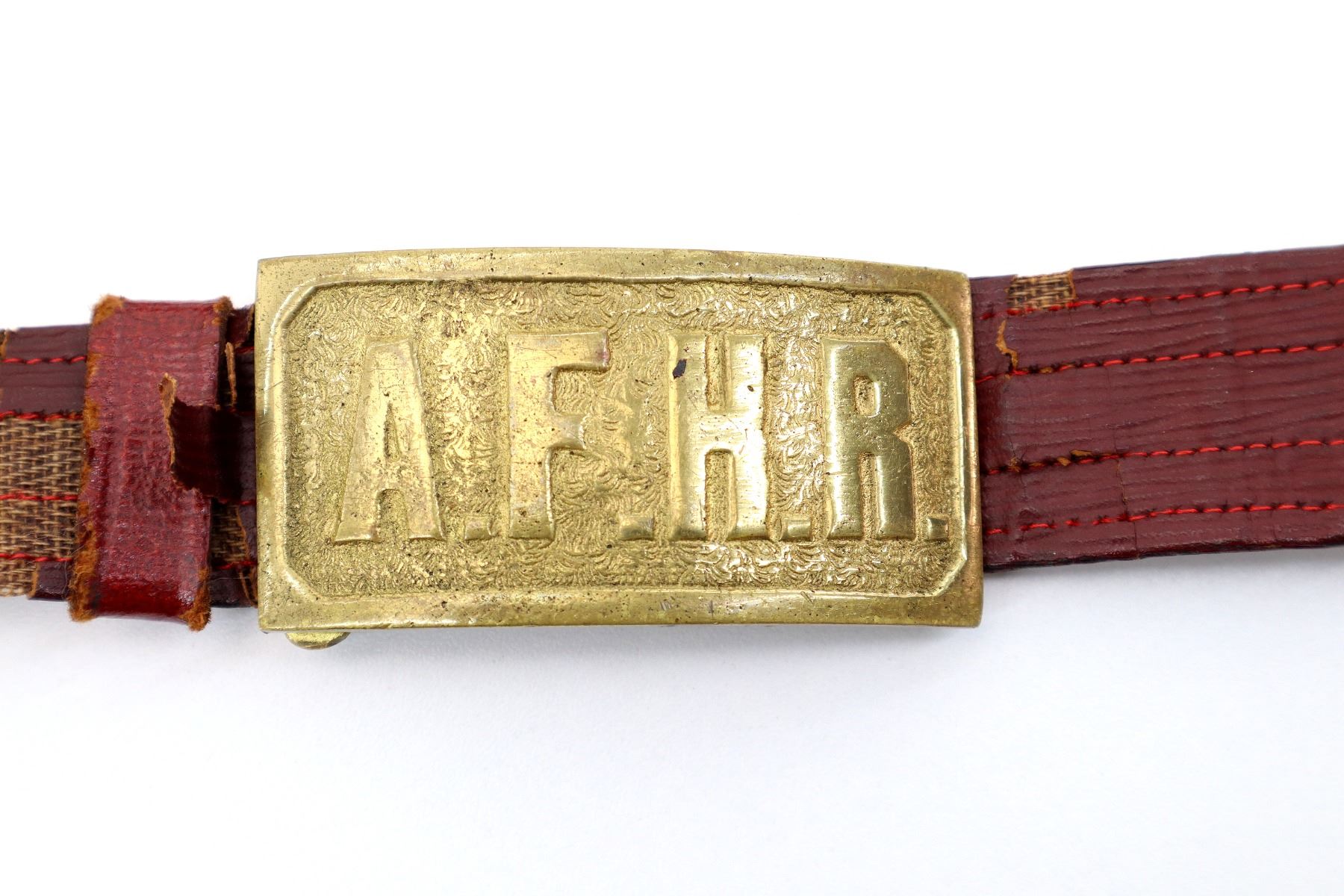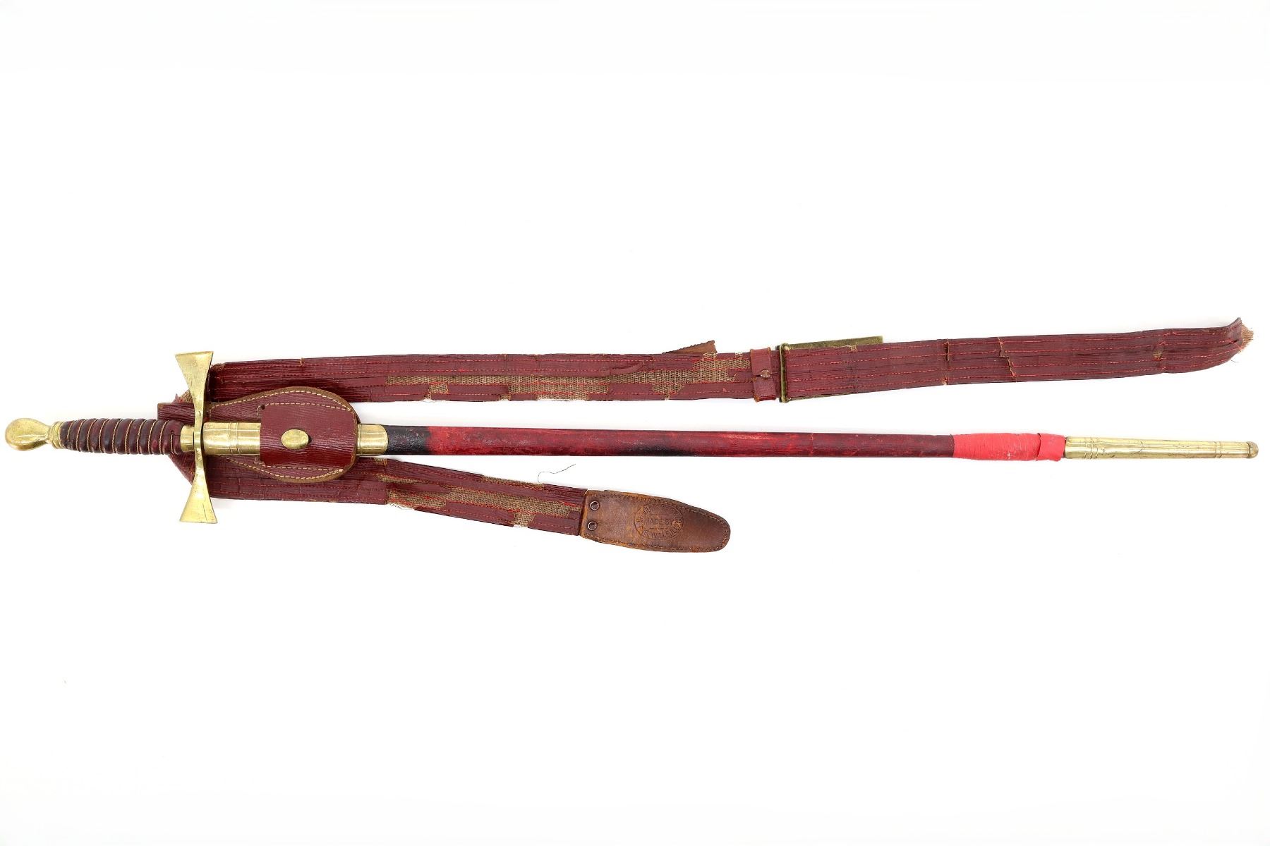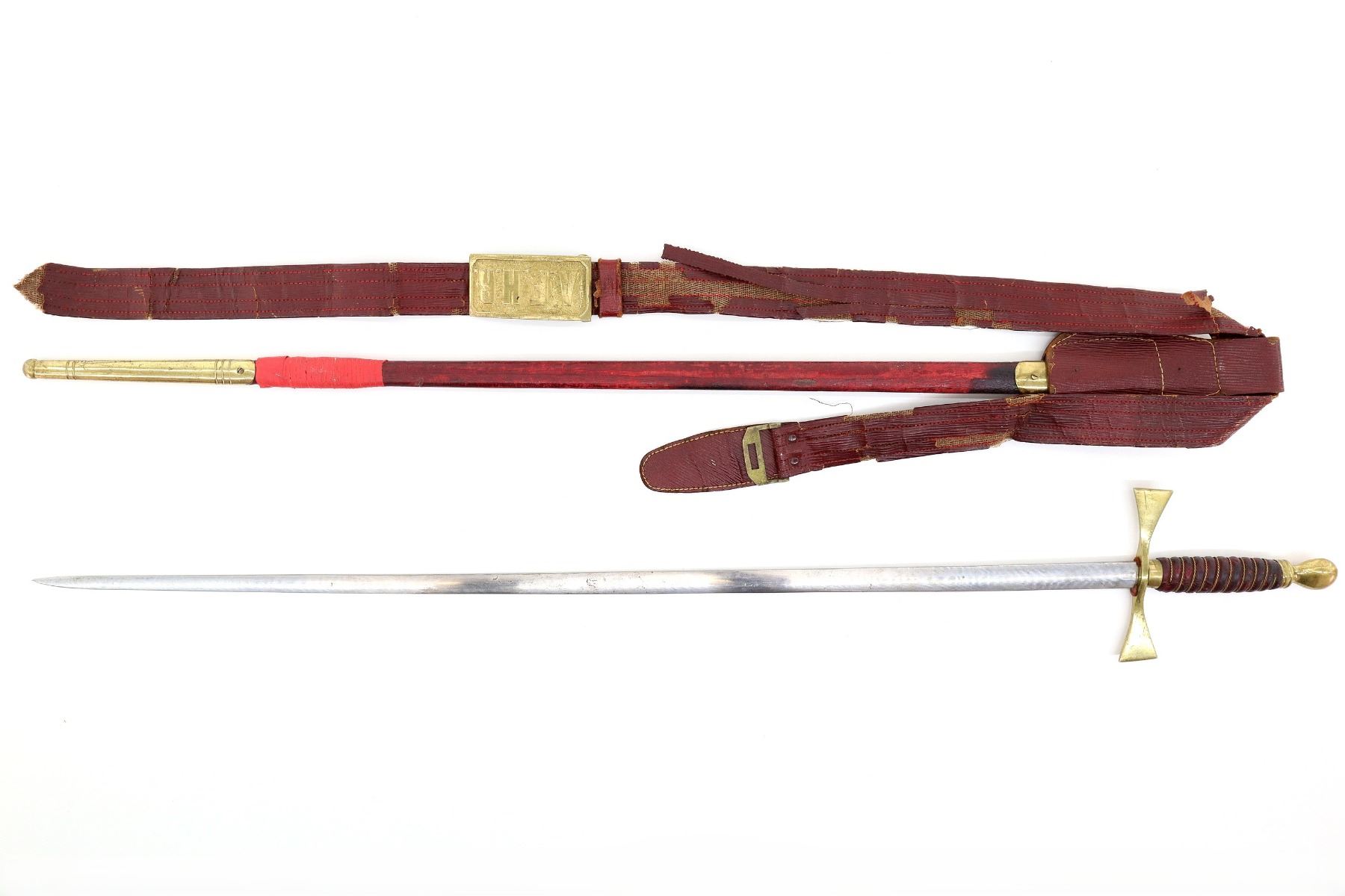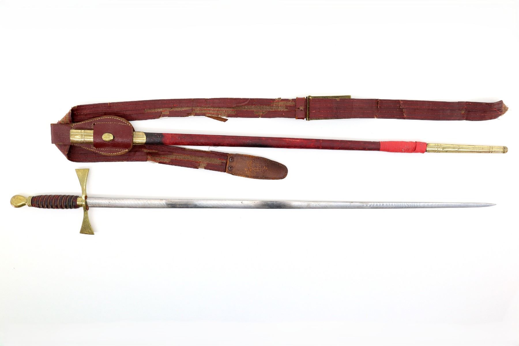 (1) STRAIGHT DOUBLE-EDGED SWORD, NO FULLER, NO VISIBLE MARKINGS ON BLADE, PARTIAL FELT WASHER / BUFFER PAD, BRASS CROSS-PIECE, LEATHER & BRASS WIRE WRAPPED GRIP, WIRE IS TWISTED, BRASS POMMEL, NO VISIBLE MARKINGS, RED PAINTED LEATHER & BRASS SCABBARD, TAPE WRAPPED AROUND END OF SCABBARD, NO VISIBLE MARKINGS, RED LEATHER SWORD HANGER WITH BRASS BUCKLE MARKED: "A.F.H.R.", LEATHER MARKED: "MADE BY, DEMOULIN BROS & CO, GREENVILLE, ILL", BLADE APPROX. 28.25", OAL APPROX. 33.5". SEE PHOTOS.