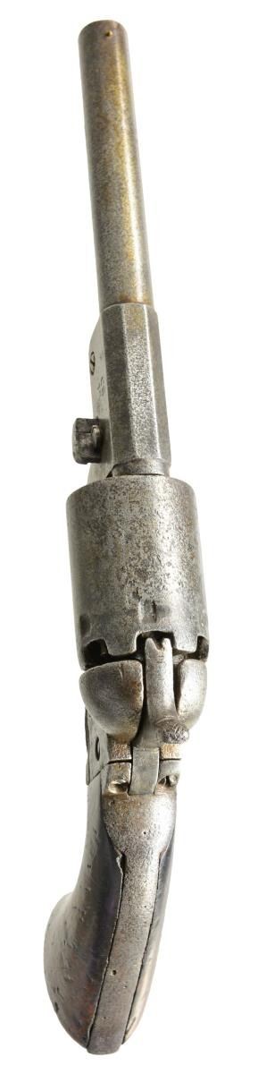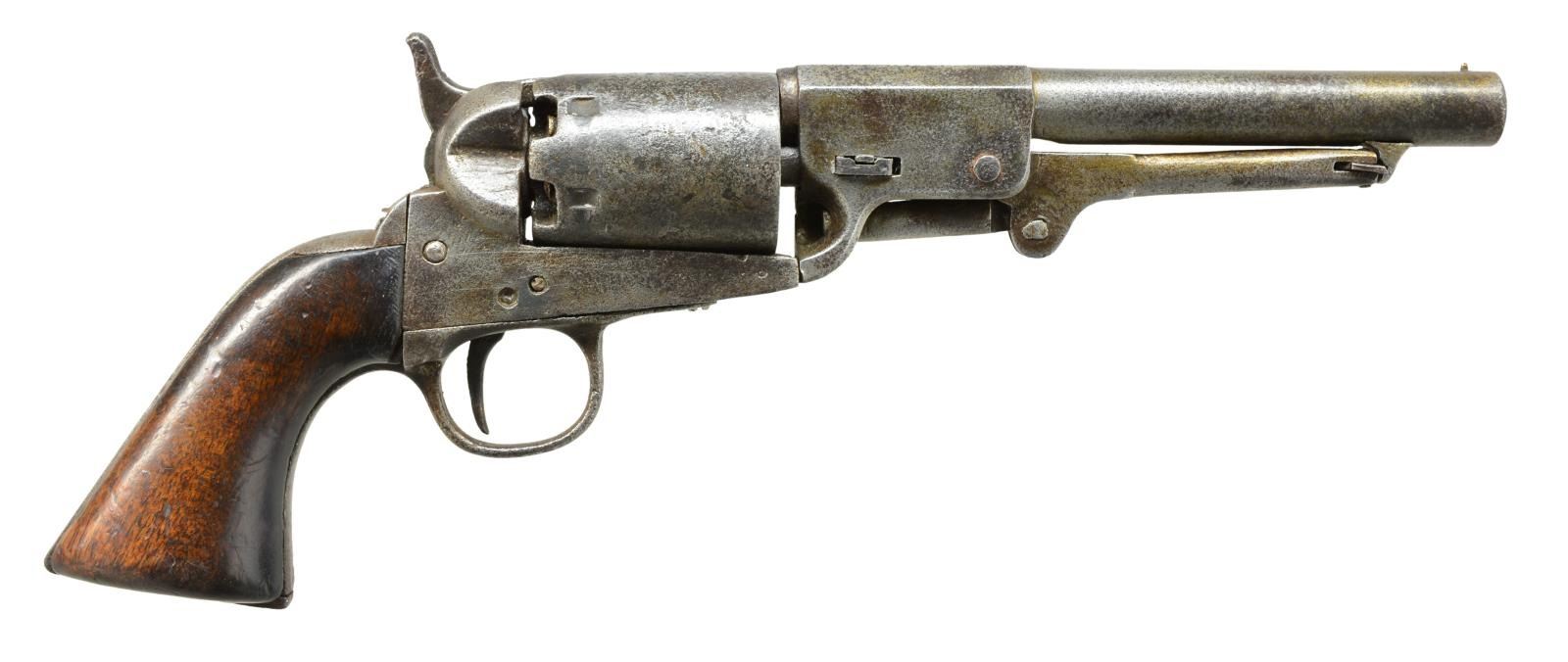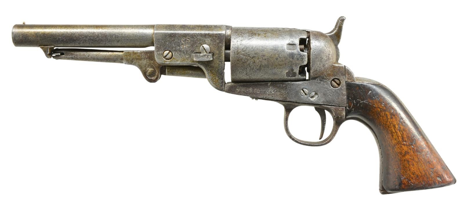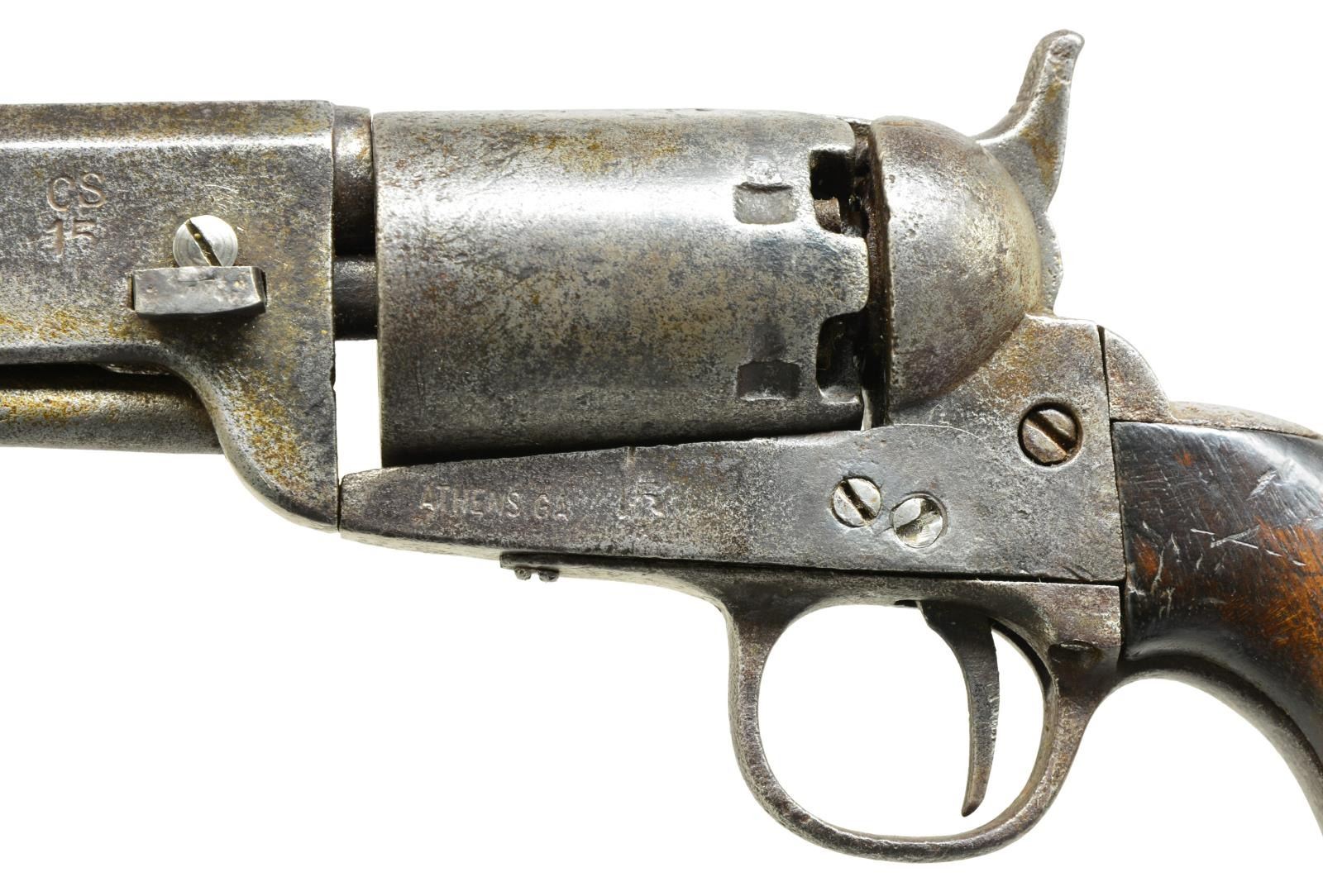 PERCUSSION REVOLVER. Cal. 42. S# 15. Bbl. 6 1/4". This iron mounted revolver appears Civil War era but the Confederate markings are highly suspect, however this gun is old & appears well used. 6.25" oct. to rnd. bbl. like a Colt Dragoon, long 2" cyl., unusual cal. between Army & Navy size, “38” is stamped internally on backstrap & triggerguard. “ATHENS GA” stamped on top bbl. flat & left side of frame. “15” In a lg. font stamped on left side of frame & bbl. housing. Bbl. housing is also stamped “CS”. All of these marks are highly suspect not Confederate. This is an interesting novelty that has been around for very long time. CONDITION: fair-good overall. Metal is gray & pitted. Wedge & wedge screw are replaced. Mechanically revolver will cock & rotate cyl., but cyl. won't lock. Bore is rifled & pitted. (01-19427/JS). ANTIQUE. $2,000-3,000.
