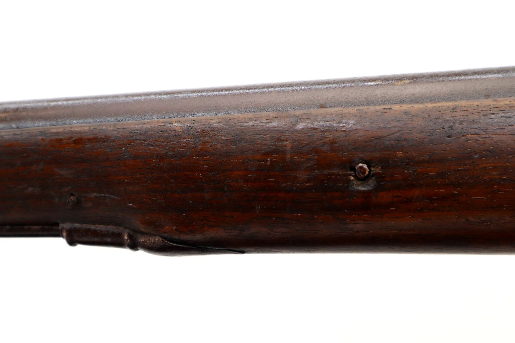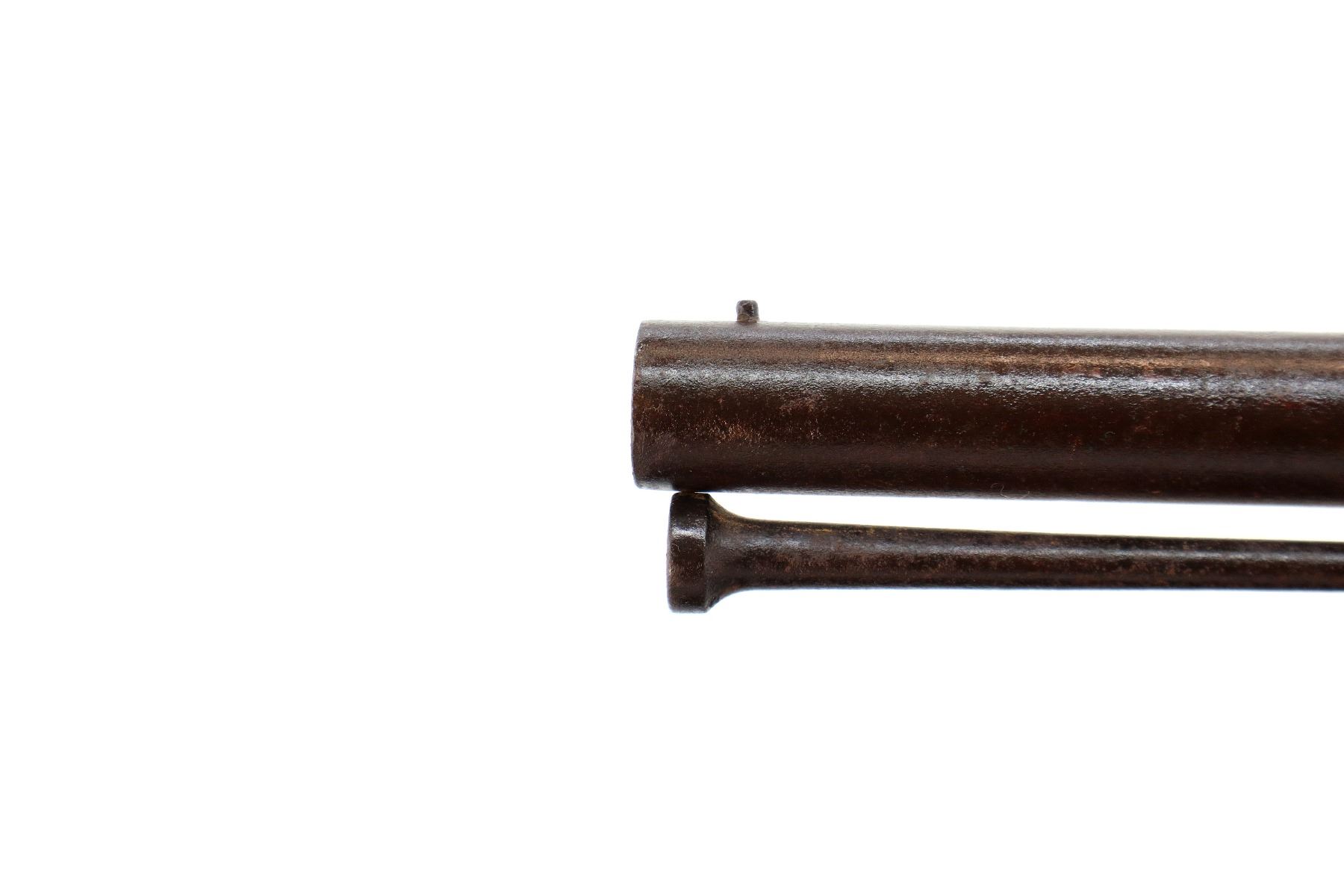 Main Description: Steel bead, tapered round barrel, nipple is damaged, missing tang screw, complete lock plus parts, butt plate and screws, trigger guard screws. Has a steel ramrod, hangers are damaged. One piece wood stock, forearm is chipped and cracked, straight grip chipped and cracked behind barrel and lock