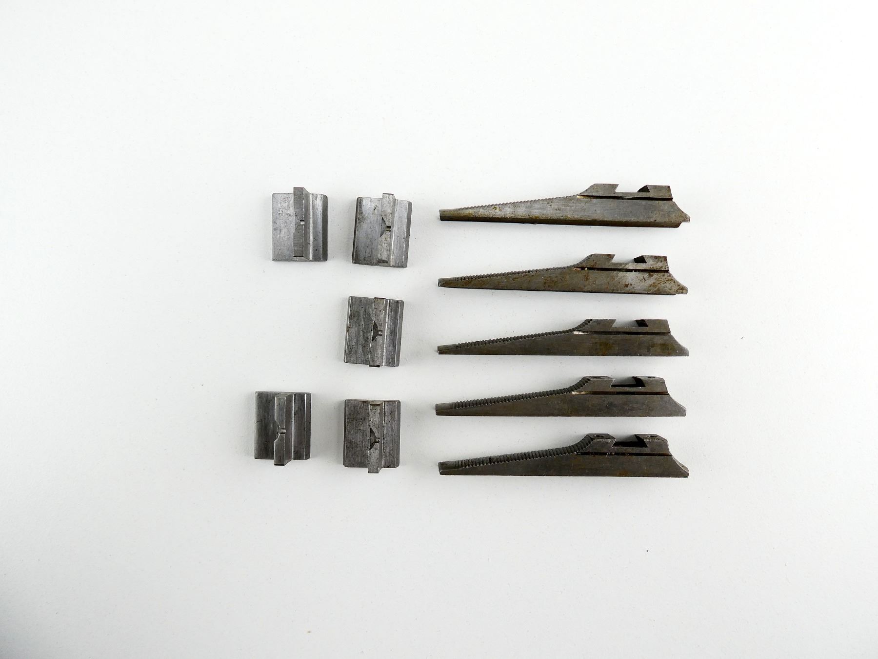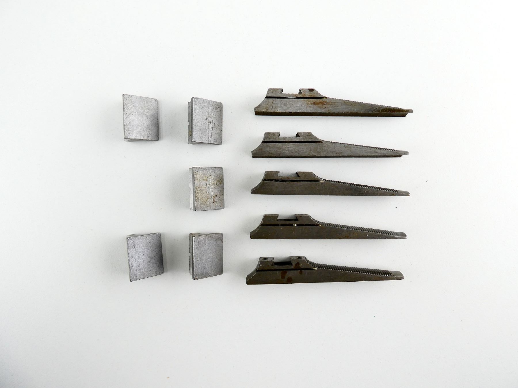 LOT INCLUDES; (5) FRONT SIGHT RAMPS, IN THE WHITE STEEL CONSTRUCTION & (5) REAR SIGHT BLADES, IN THE WHITE STEEL CONSTRUCTION. MAY REQUIRE FITTING. SEE PHOTOS.