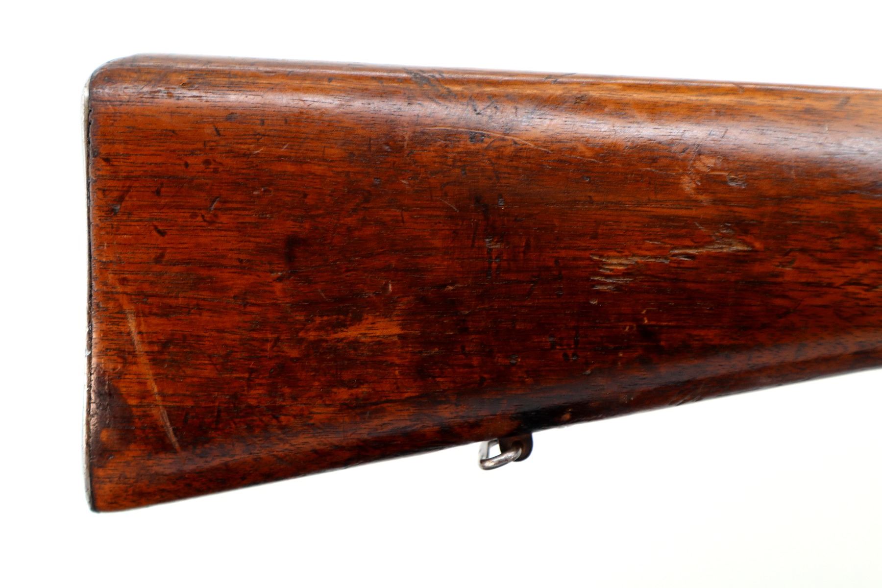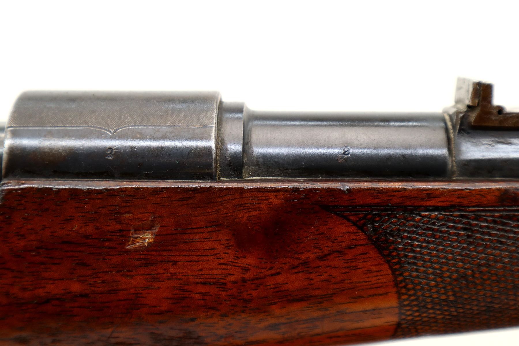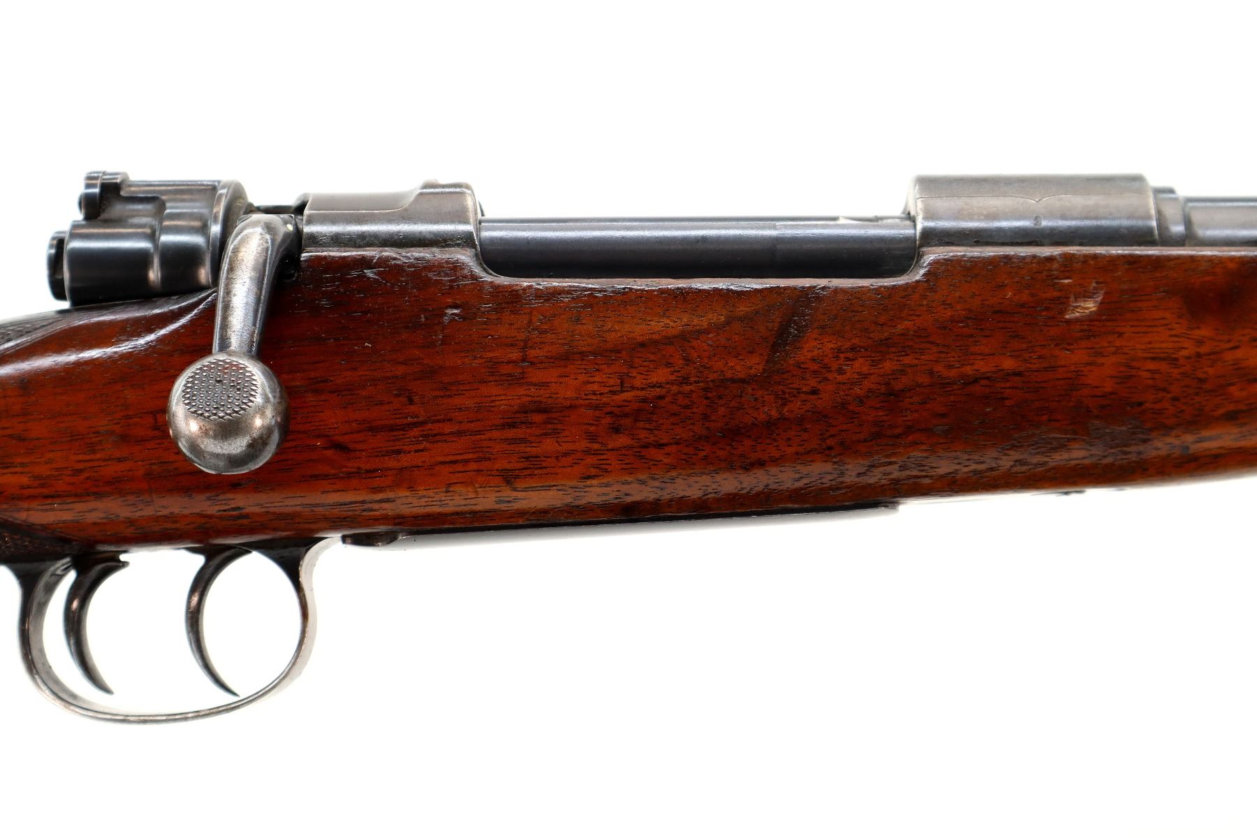 Main Description: Blade front sight with hood and ramp, adjustable u notched rear sight missing one folding leaf, blued finish, left side of barrel drilled and tapped with no plug screws installed, turned down bolt handle with checkered flat sided knob. One piece sporter wood stock, checkered forearm and pistol grip cracked through wrist, smooth steel butt plate, sling swivels.