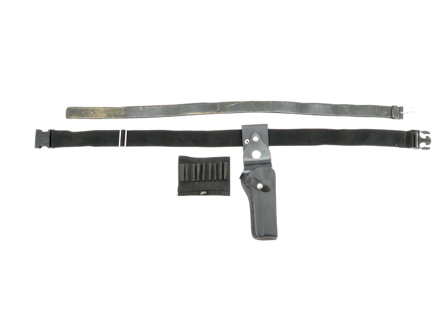 LOT INCLUDES; (1) BLACK HARD POLYMER HOLSTER, HOLSTER MARKED "RENO", OAL APPROX. 8", (1) BLACK NYLON BELT, OAL APPROX. 40", ADJUSTABLE, (1) BLACK LEATHER BELT, OAL APPROX. 36", (1) UNCLE MIKE'S SLIP ON SHELL HOLDER. SEE PHOTOS.