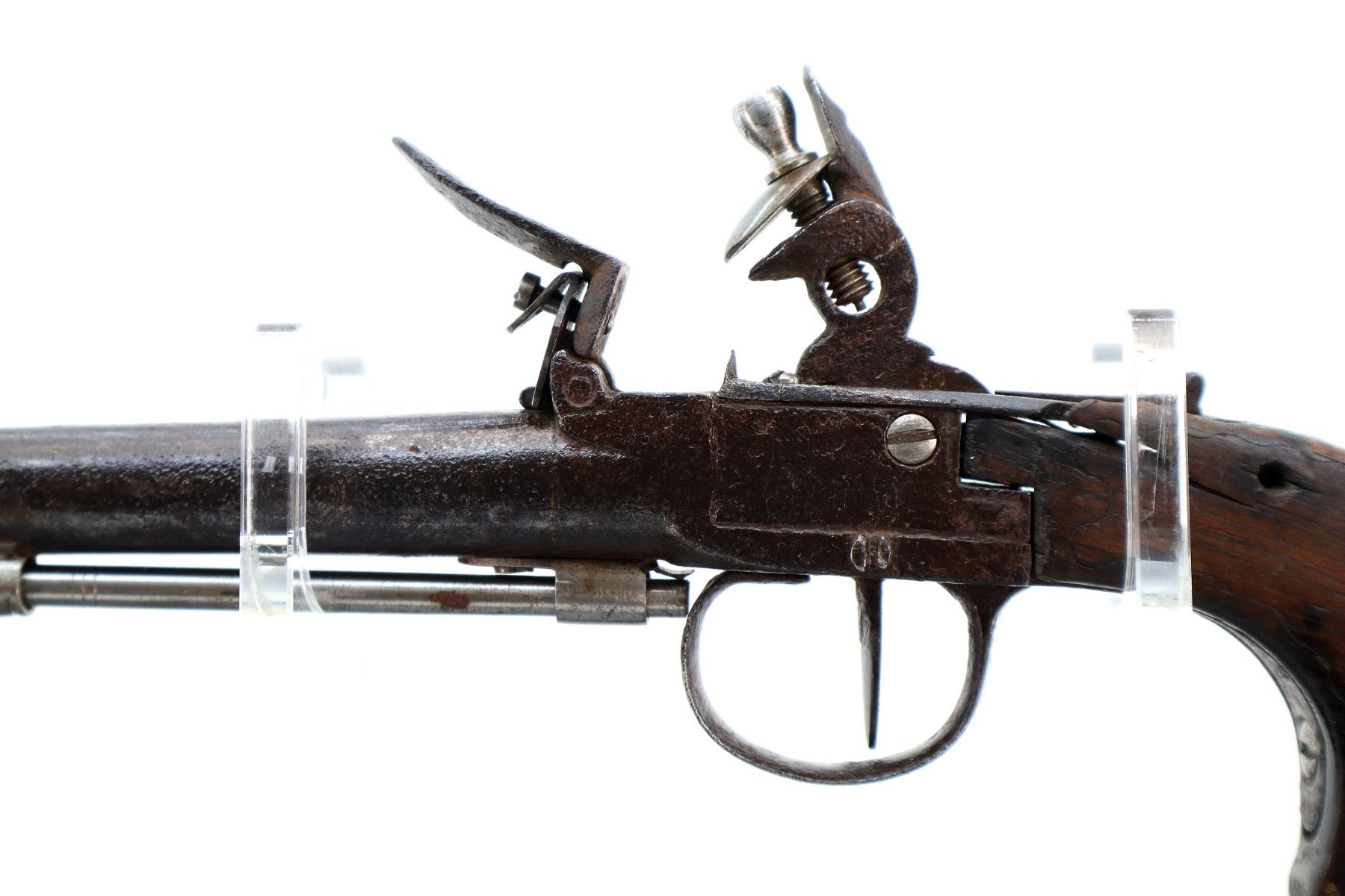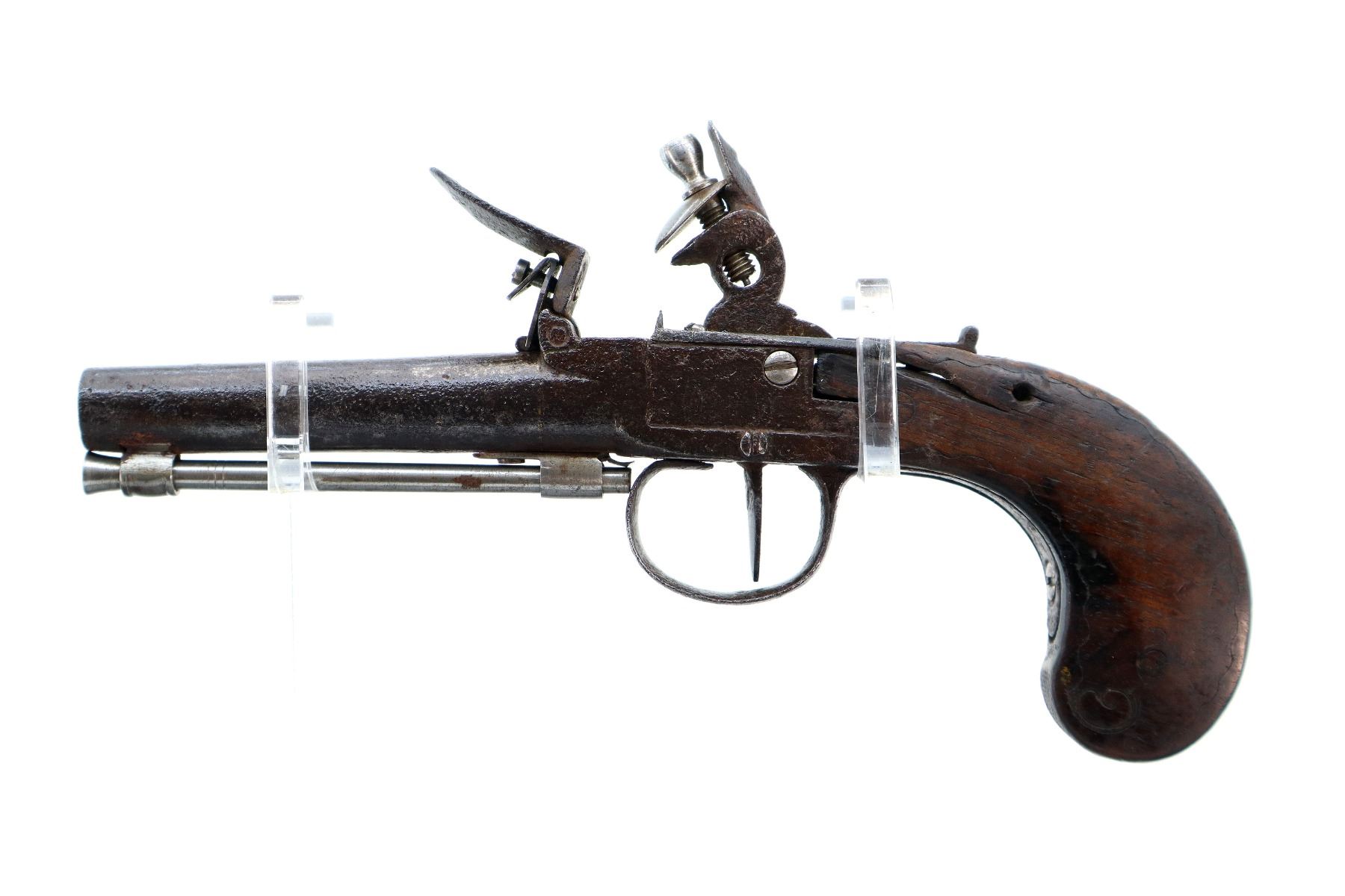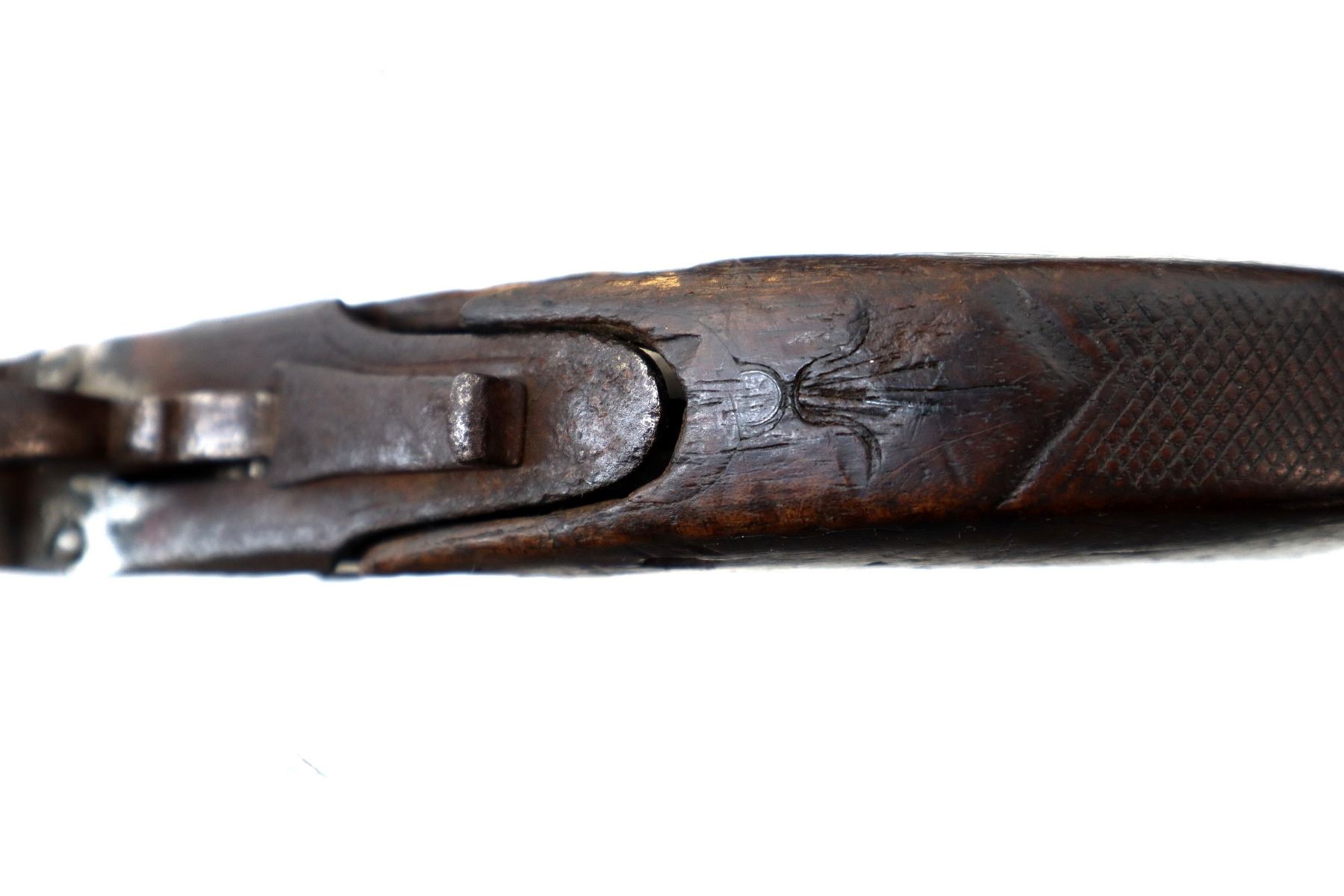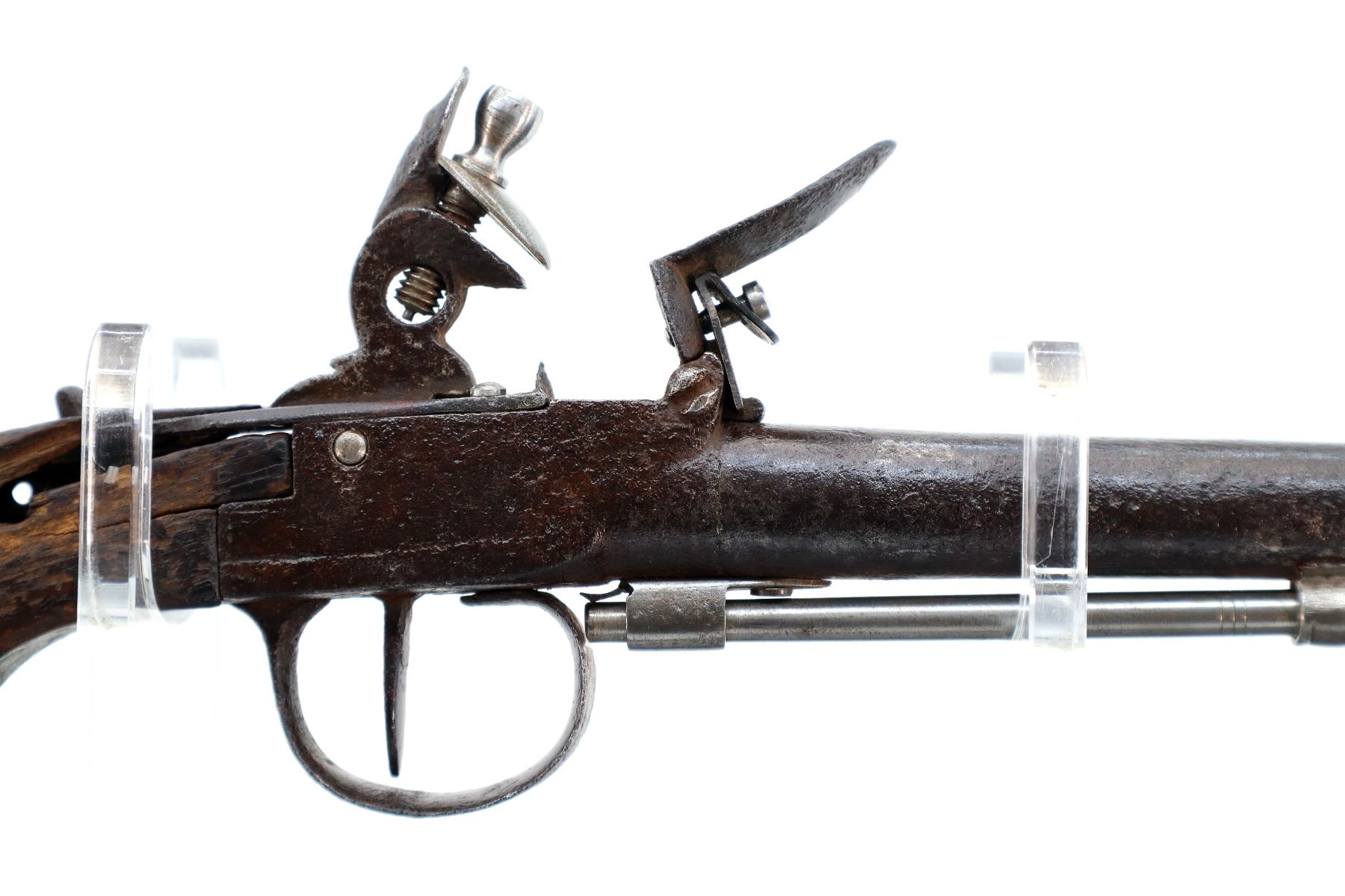 Main Description: No sights, tapered round barrel, hammer and frizzen function, safety catch behind hammer. One piece wood grip, chipped cracked and broken, replaced hammer screw, top jaw and screw, ramrod and holes.