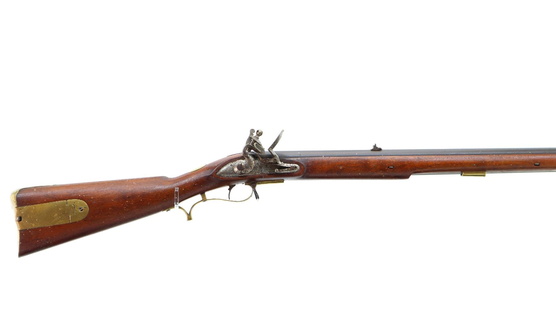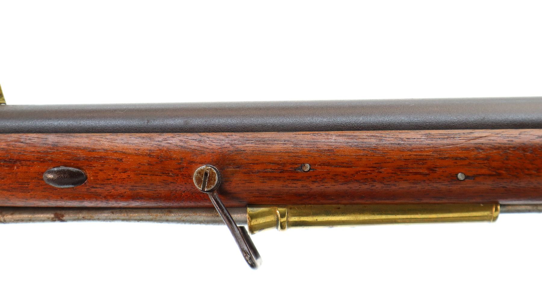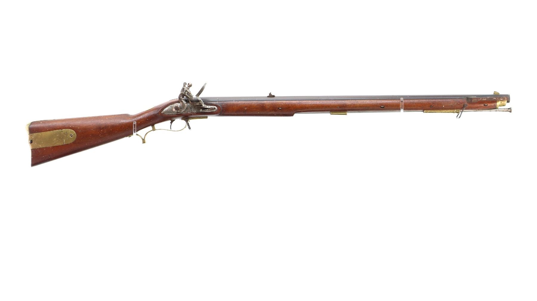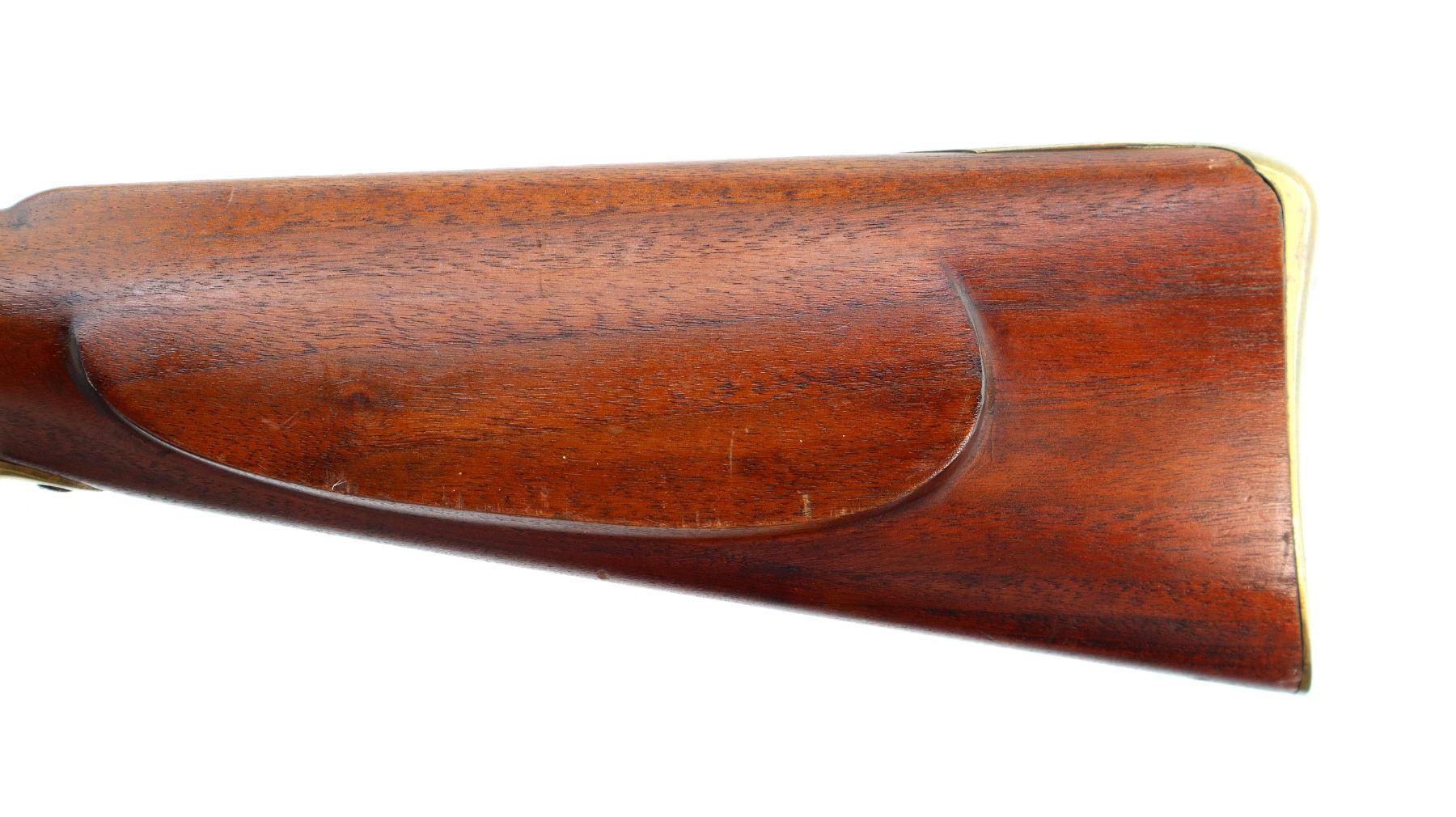 Main Description: Brass blade front sight, u notched rear sight with one fixed and one folding leaf, round barrel, smooth lock with Crown, hammer and frizzen function. One piece full military wood stock, three forearm wedges, straight grip with vanity plate, cheek rest, smooth brass butt plate, patch box, finger rest trigger guard and nose cap. Sling swivels, ramrod, bayonet bar on right side of barrel.
