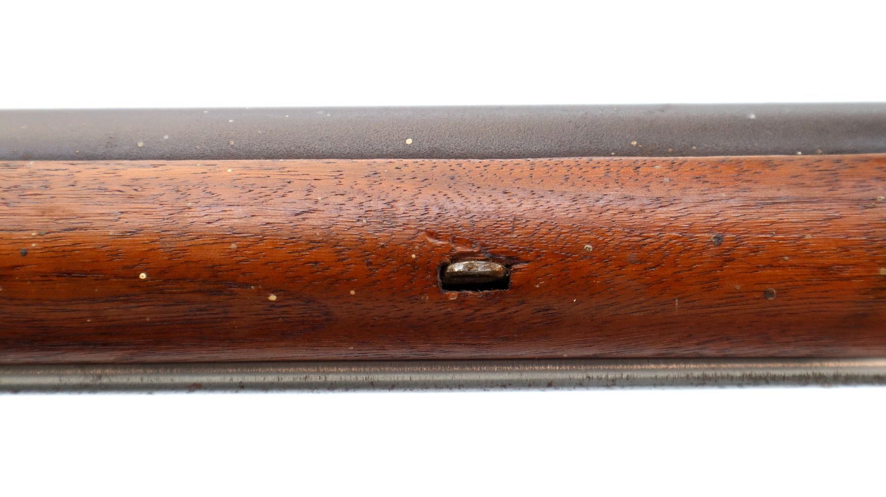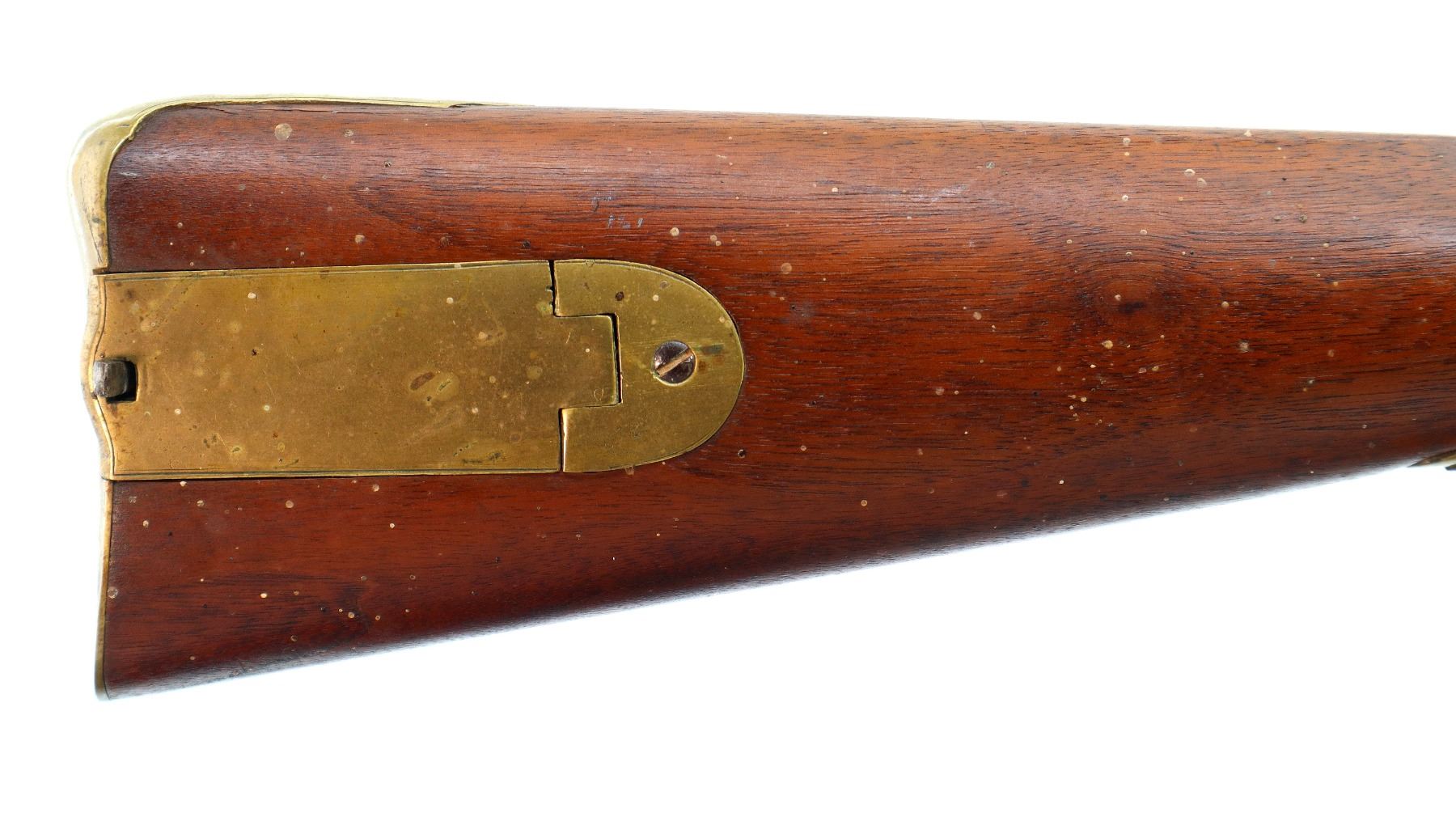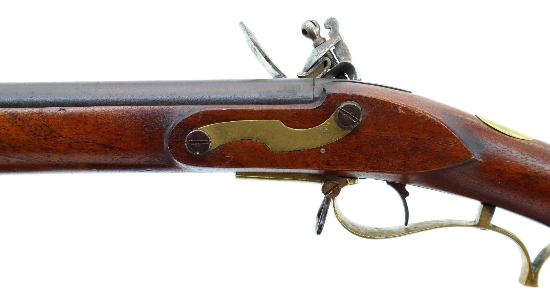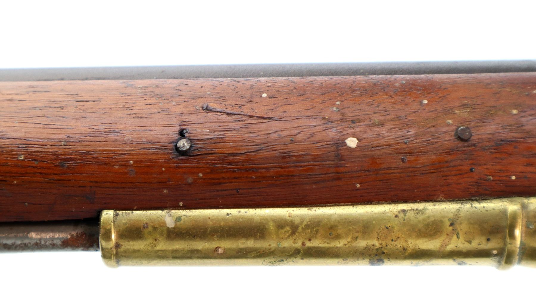 Main Description: Brass blade front sight, u notched rear sight with one fixed and one folding leaf, round barrel, smooth lock with Crown, hammer and frizzen function. One piece full military wood stock, three forearm wedges, straight grip with vanity plate, cheek rest, smooth brass butt plate, patch box, finger rest trigger guard and nose cap. Sling swivels, ramrod, bayonet bar on right side of barrel.
