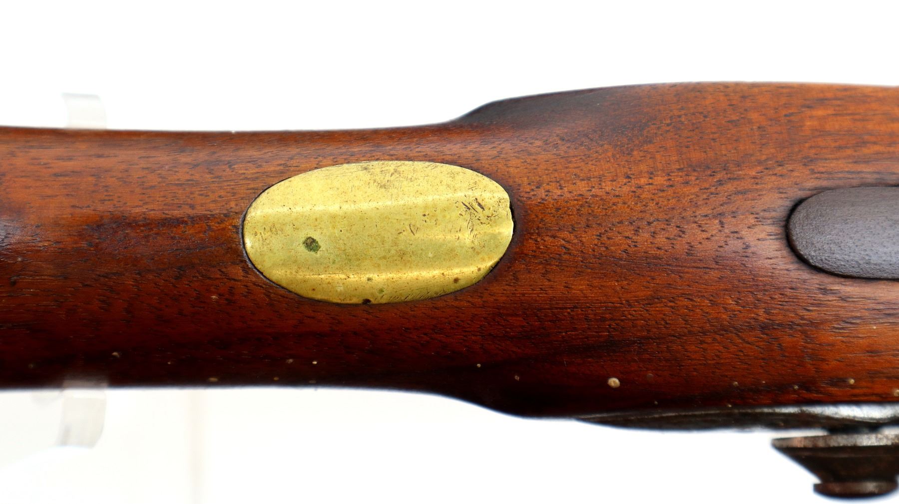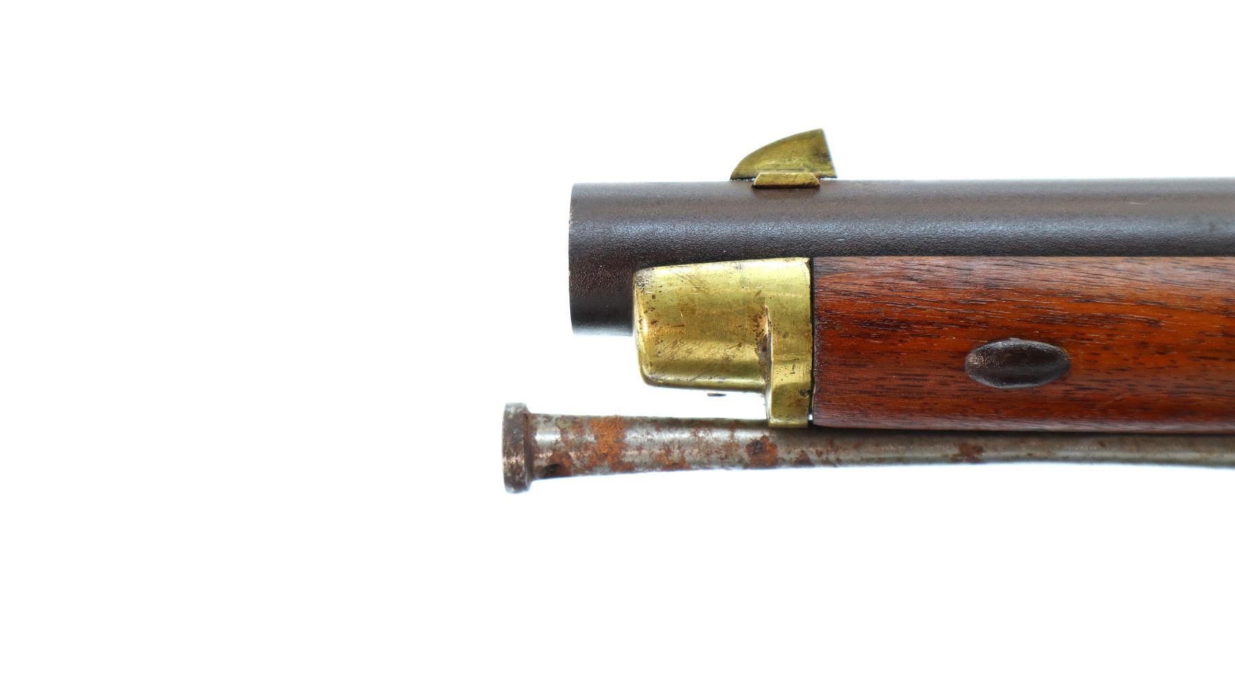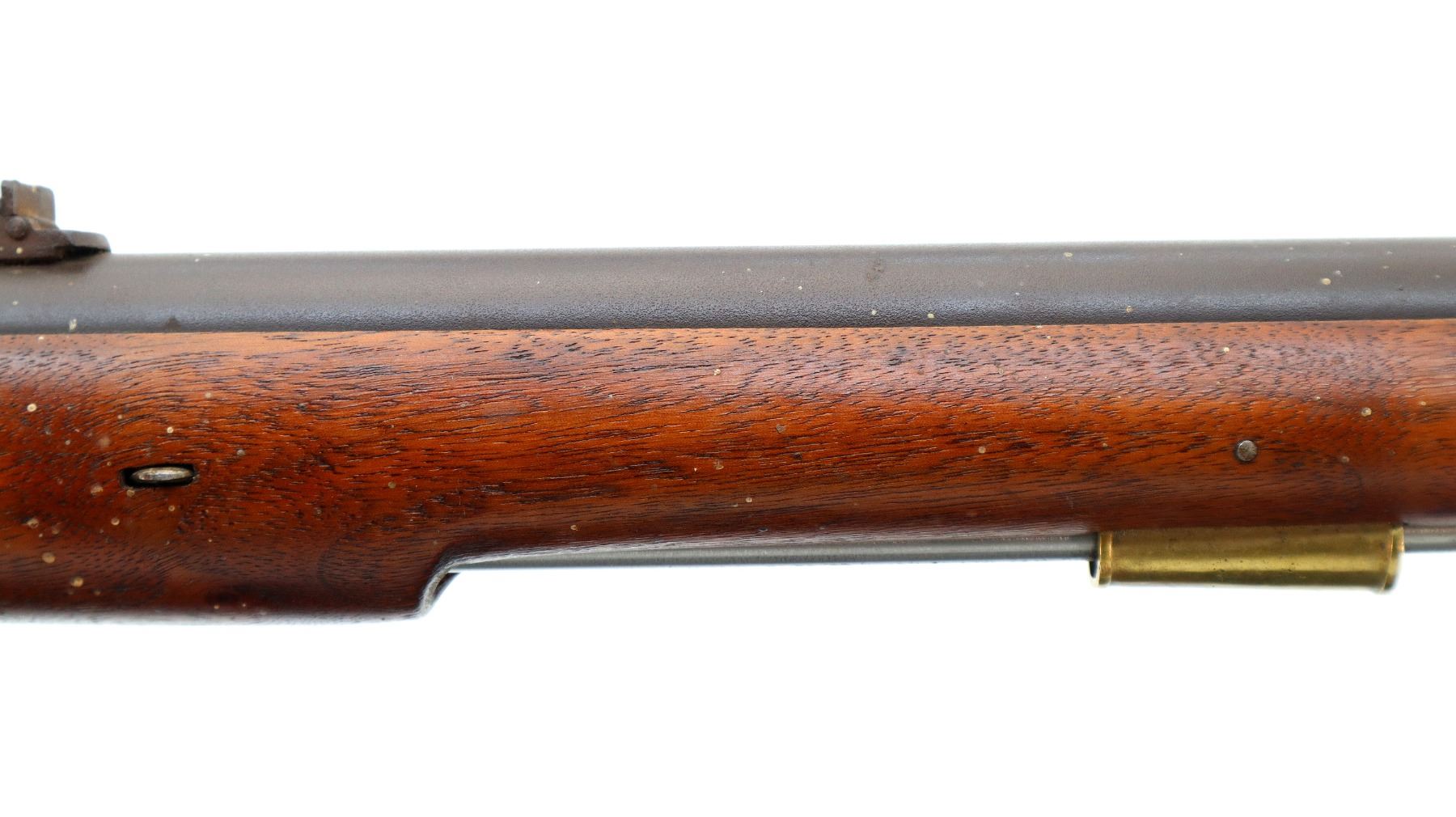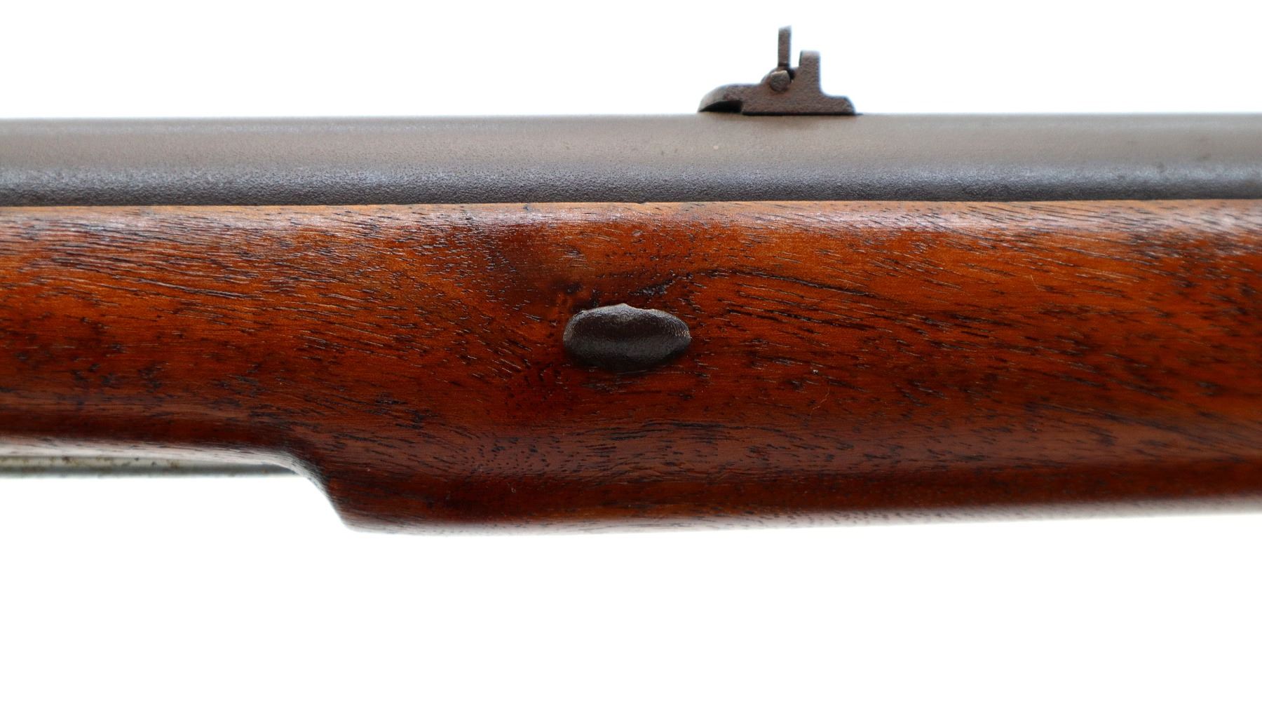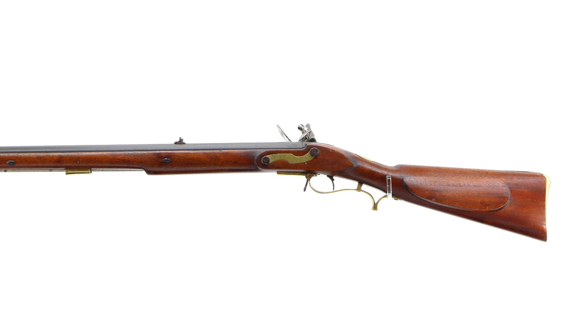 Main Description: Brass blade front sight, u notched rear sight with one fixed and one folding leaf, round barrel, smooth lock with Crown, hammer and frizzen function. One piece full military wood stock, three forearm wedges, straight grip with vanity plate, cheek rest, smooth brass butt plate, patch box, finger rest trigger guard and nose cap. Sling swivels, ramrod, bayonet bar on right side of barrel.