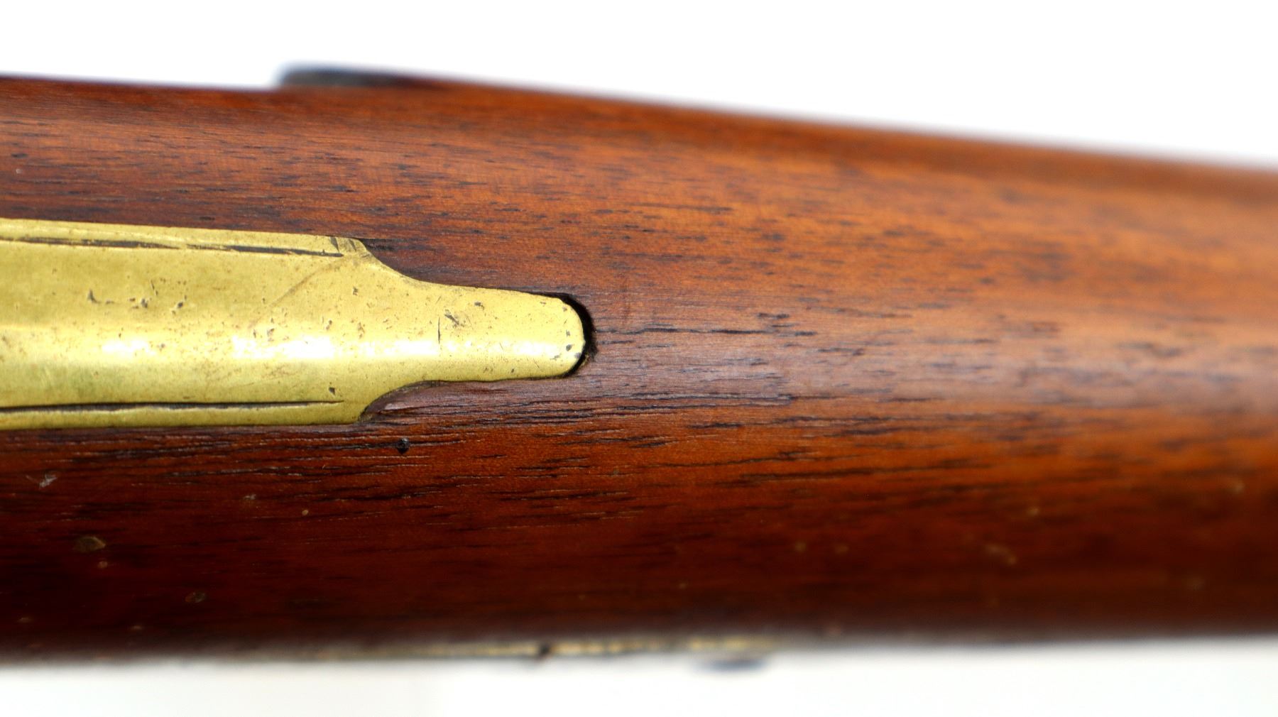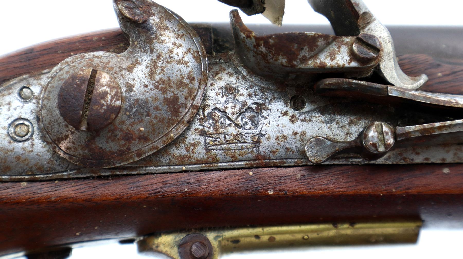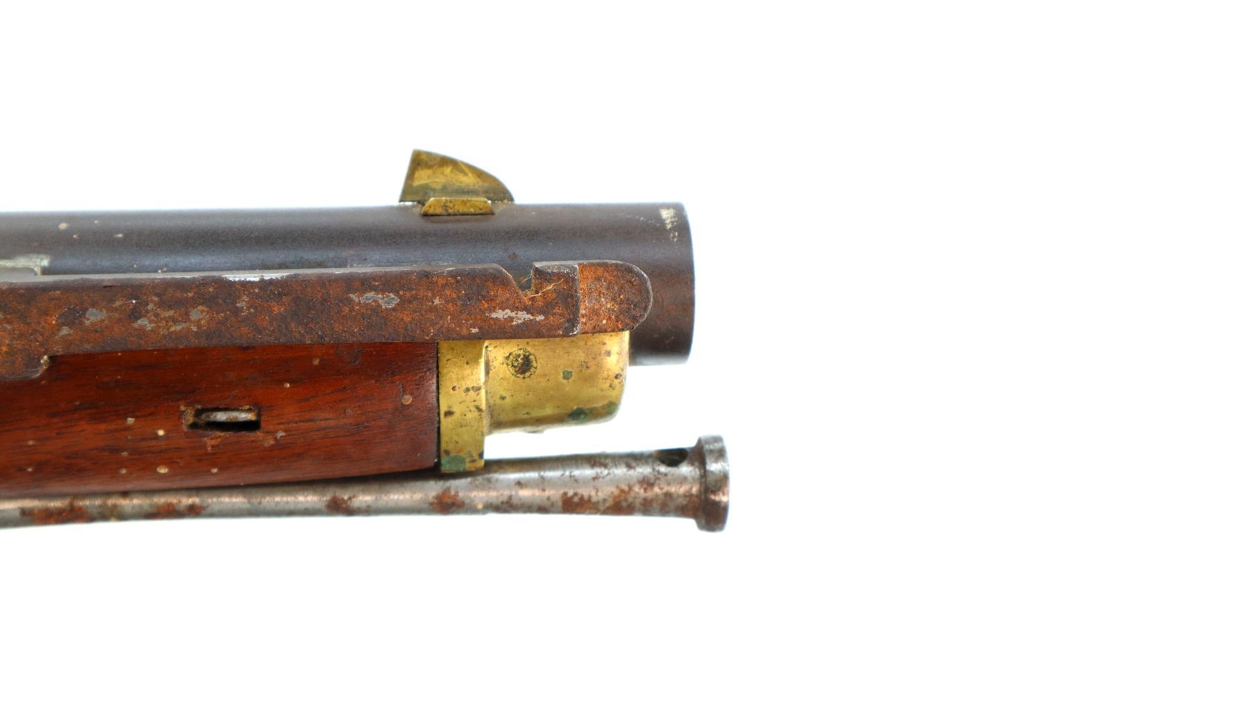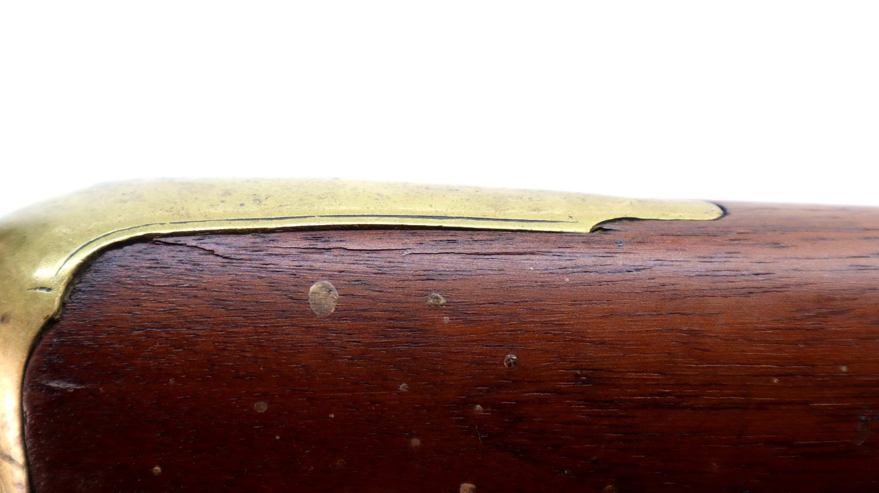 Main Description: Brass blade front sight, u notched rear sight with one fixed and one folding leaf, round barrel, smooth lock with Crown, hammer and frizzen function. One piece full military wood stock, three forearm wedges, straight grip with vanity plate, cheek rest, smooth brass butt plate, patch box, finger rest trigger guard and nose cap. Sling swivels, ramrod, bayonet bar on right side of barrel.