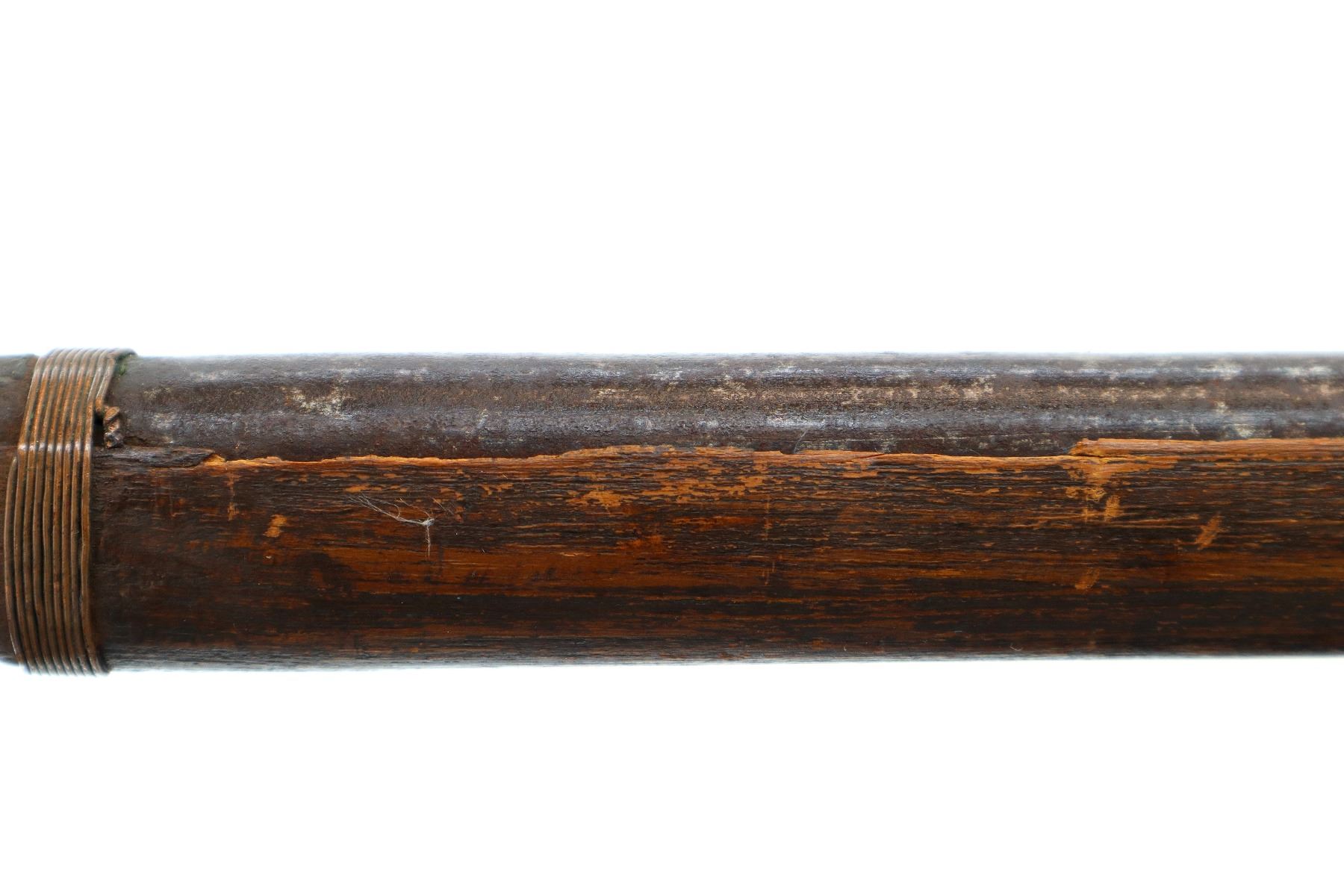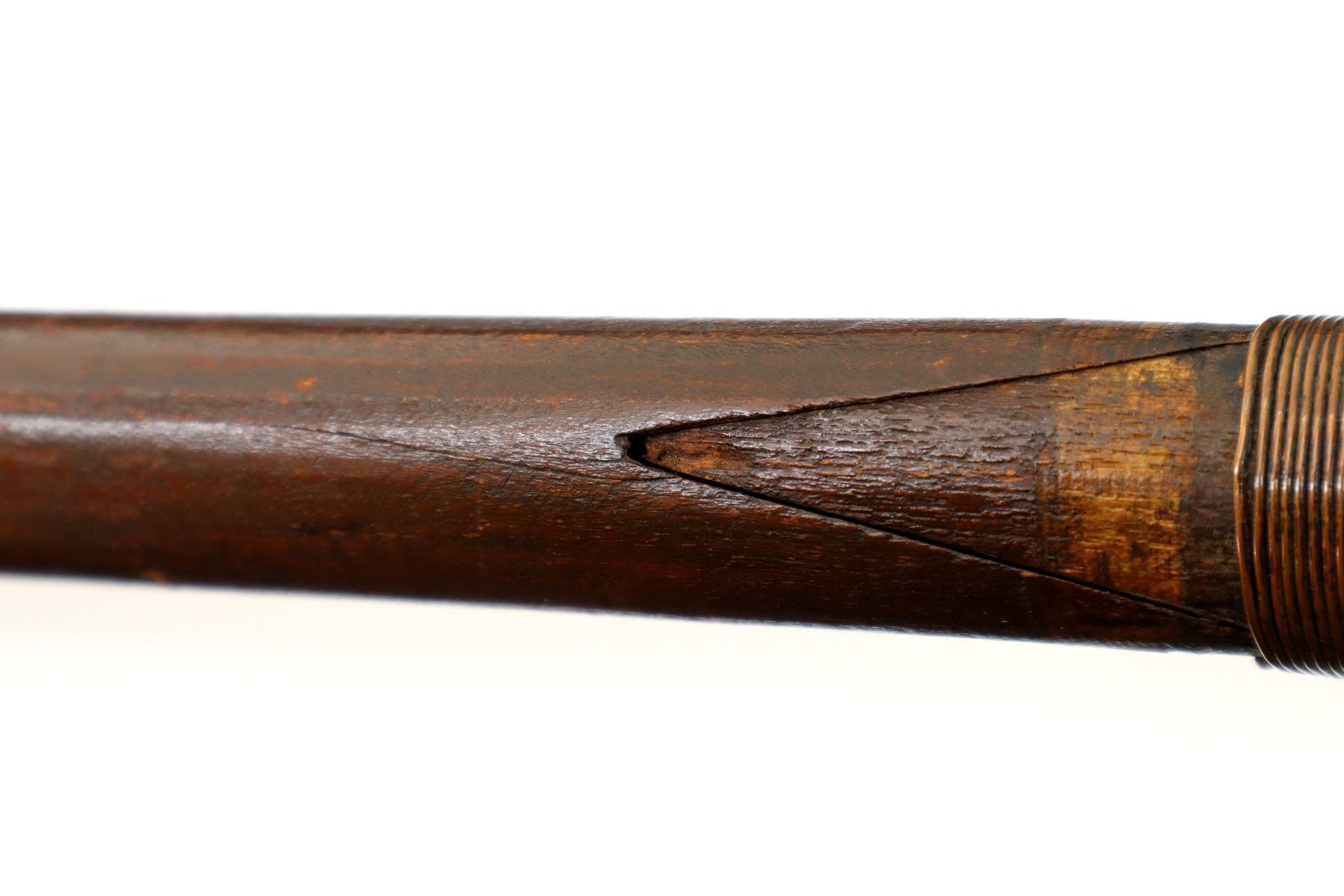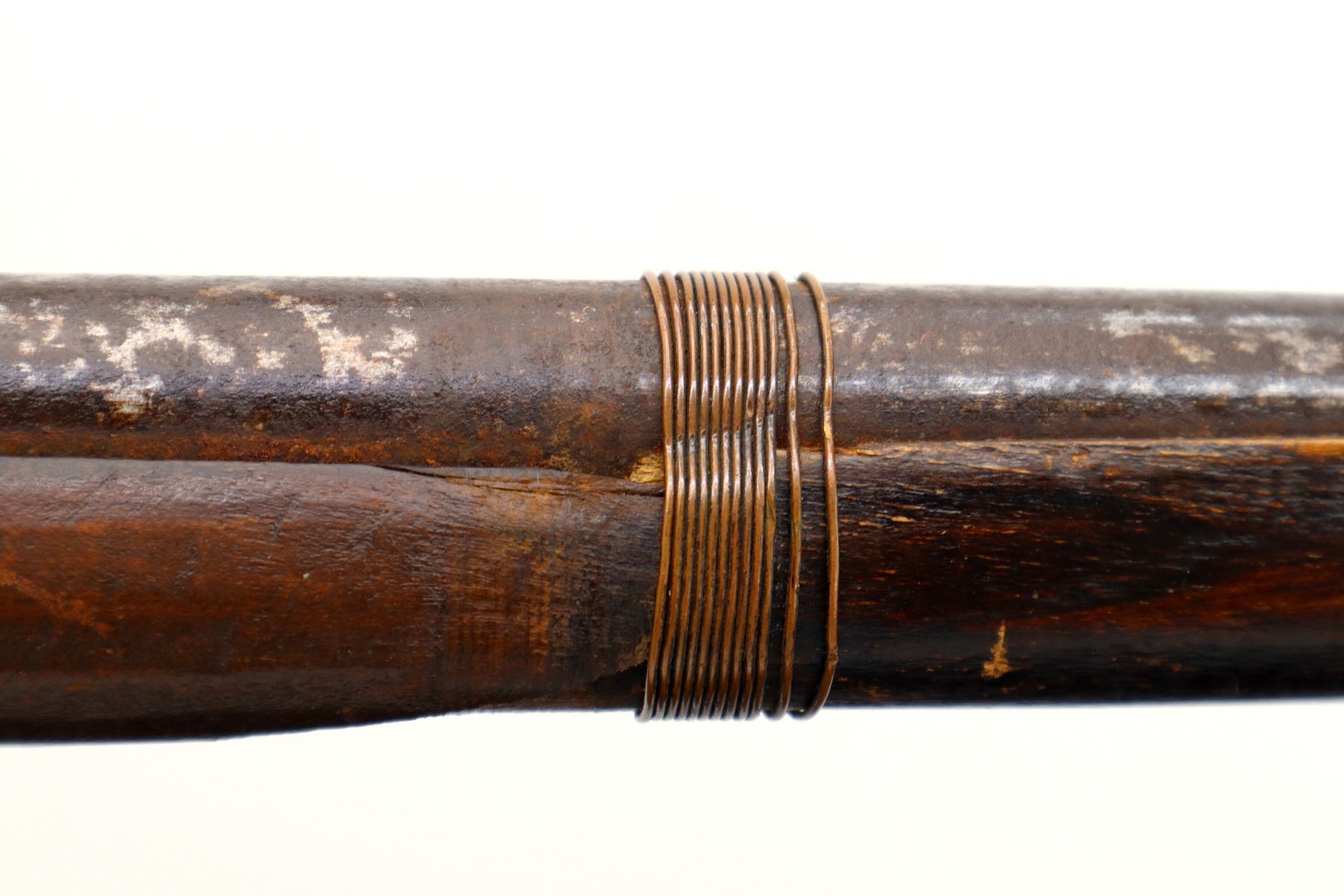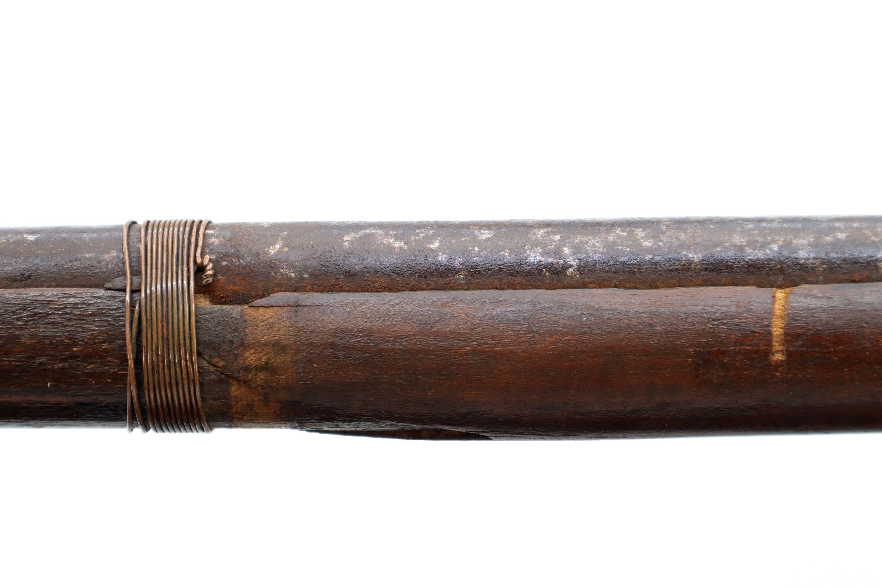 Main Description: Bead front sight, fixed u notched rear sight, tapered round barrel with flared muzzle, cock does not function, flashole pan has a pivoting cover. One piece full length wood stock, chipped and cracked spliced in the middle with copper wire bands, straight grip, smooth butt with age cracks, single swivel, some engraving on side plates.