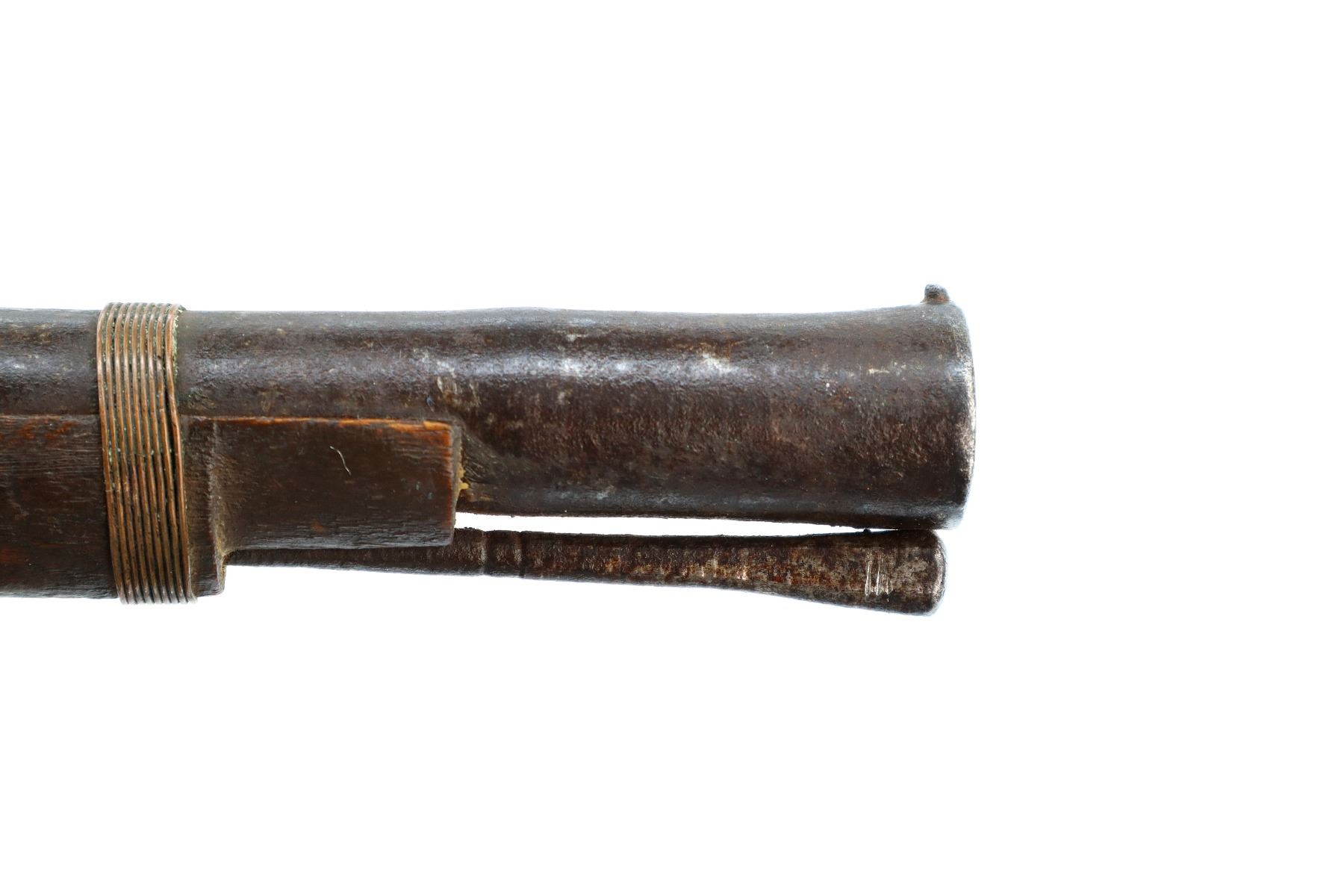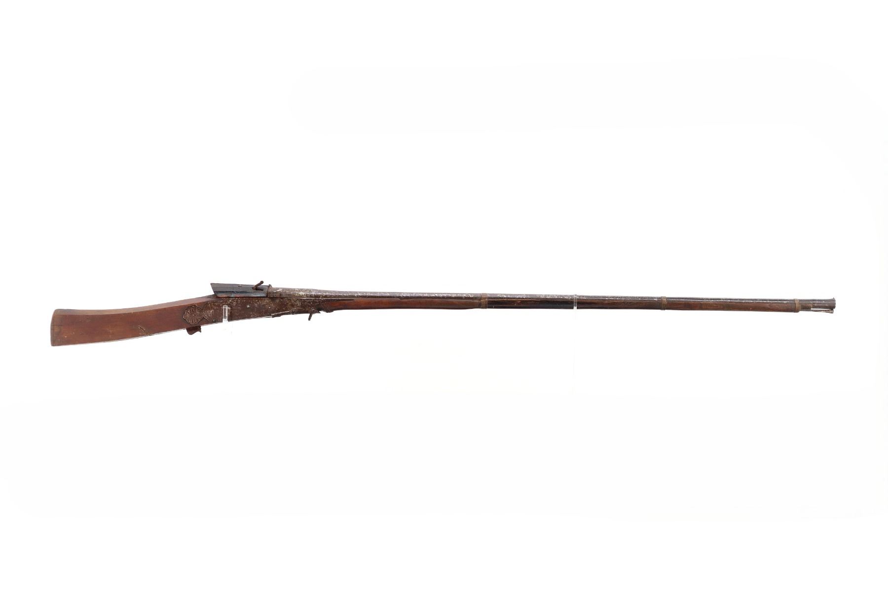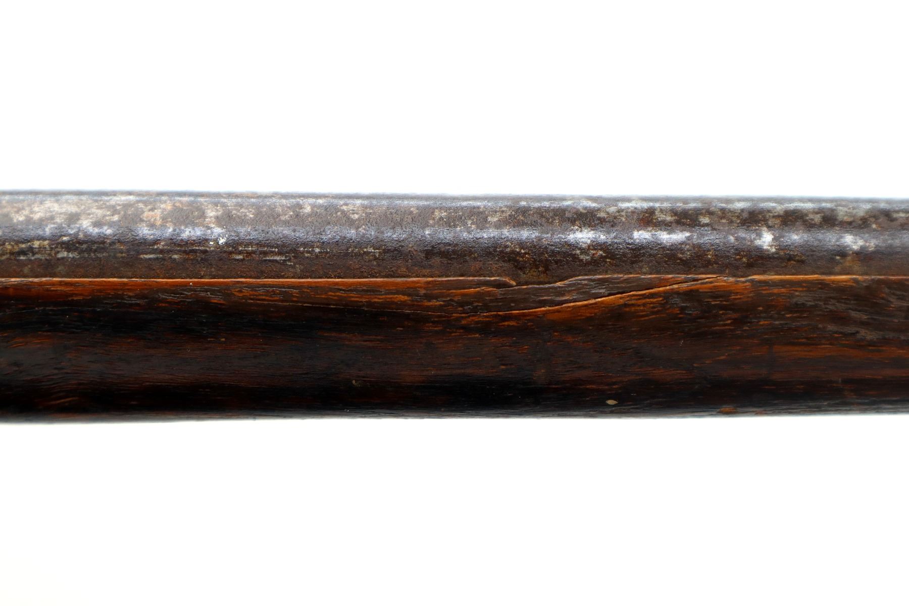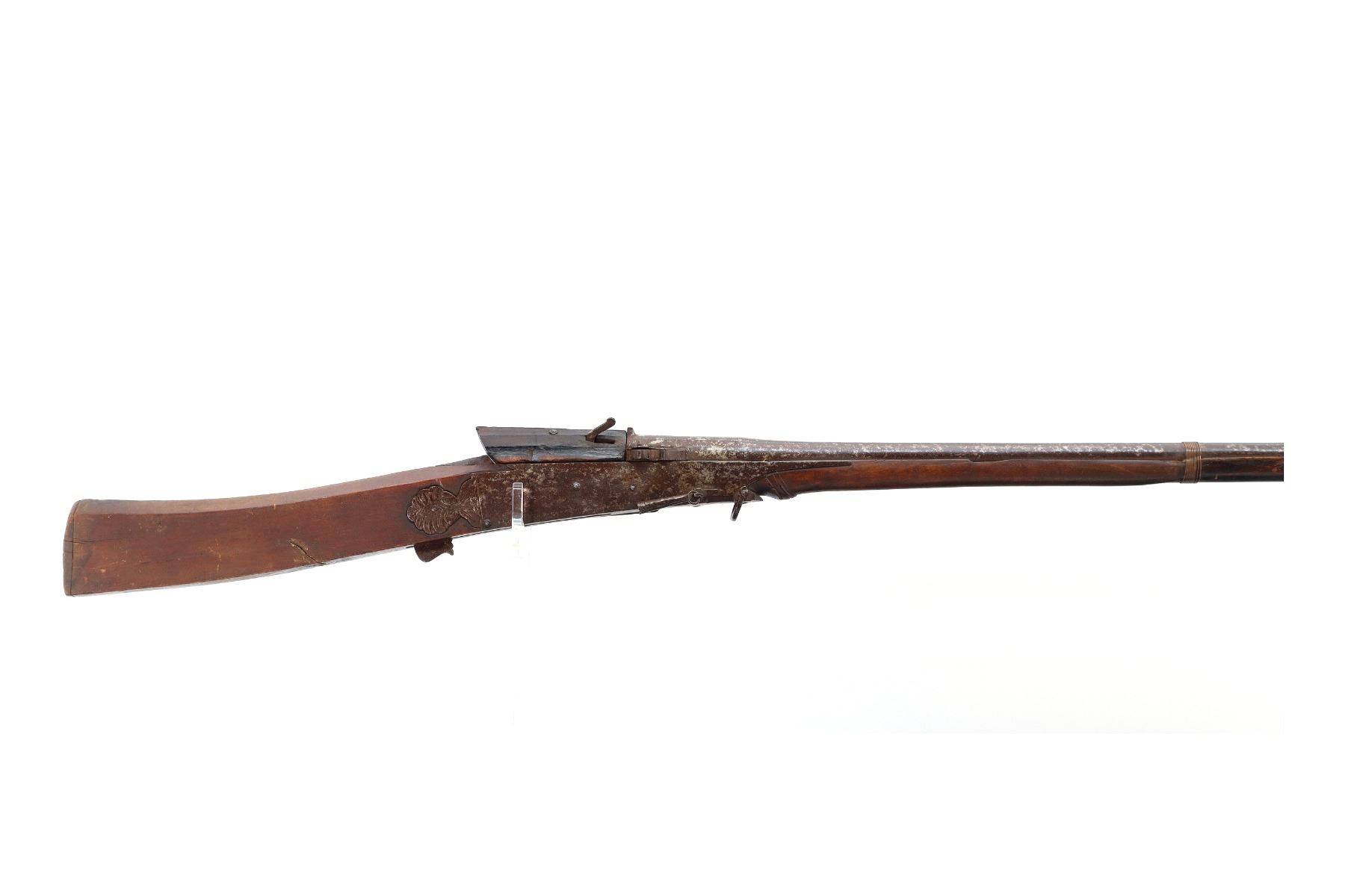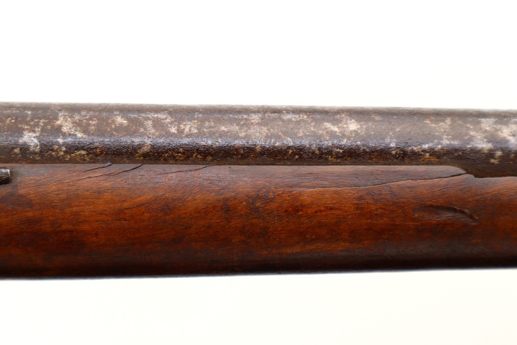 Main Description: Bead front sight, fixed u notched rear sight, tapered round barrel with flared muzzle, cock does not function, flashole pan has a pivoting cover. One piece full length wood stock, chipped and cracked spliced in the middle with copper wire bands, straight grip, smooth butt with age cracks, single swivel, some engraving on side plates.
