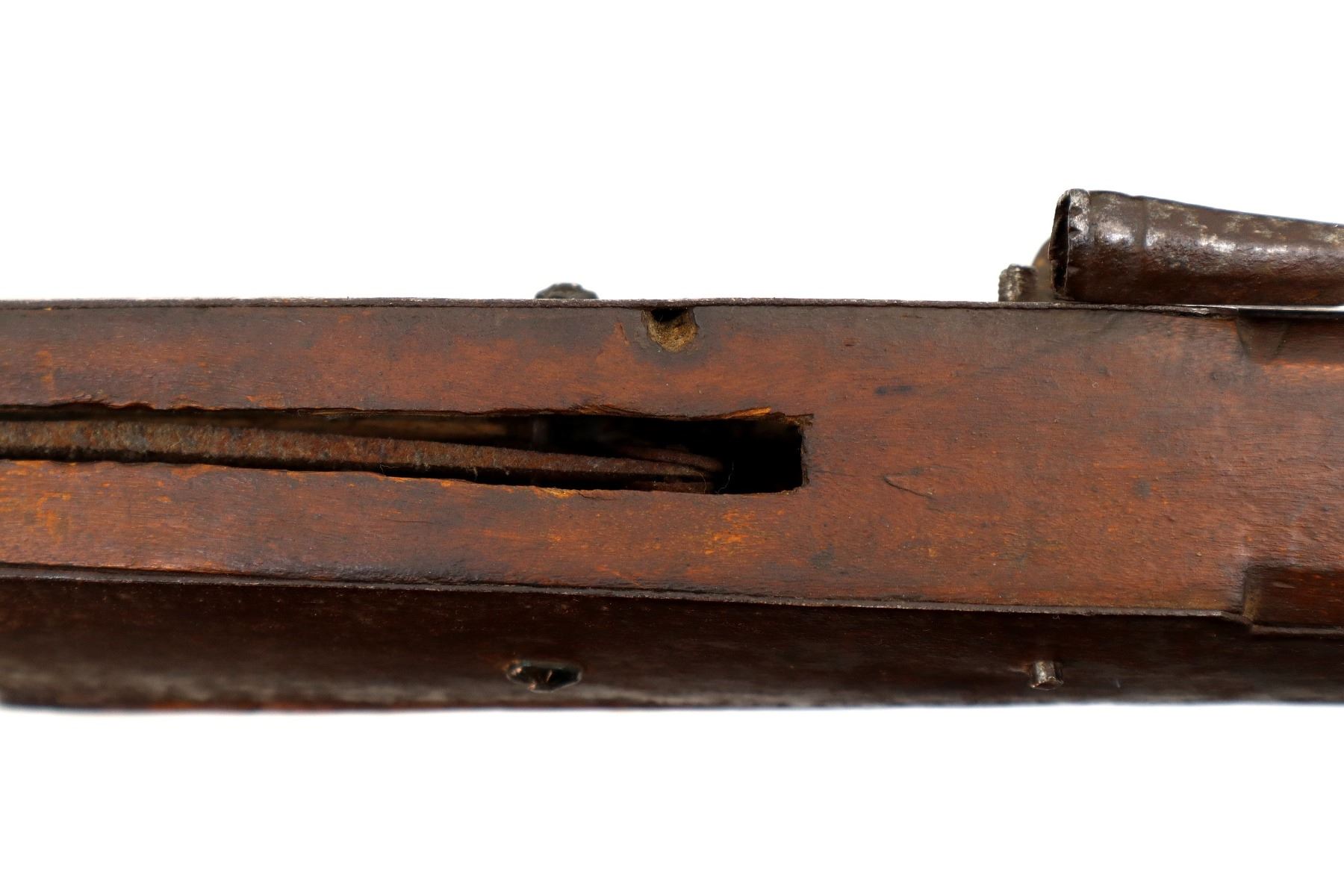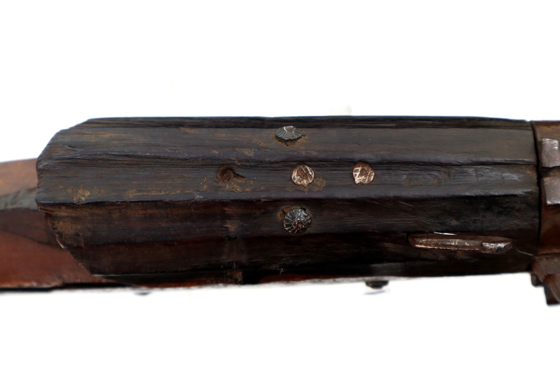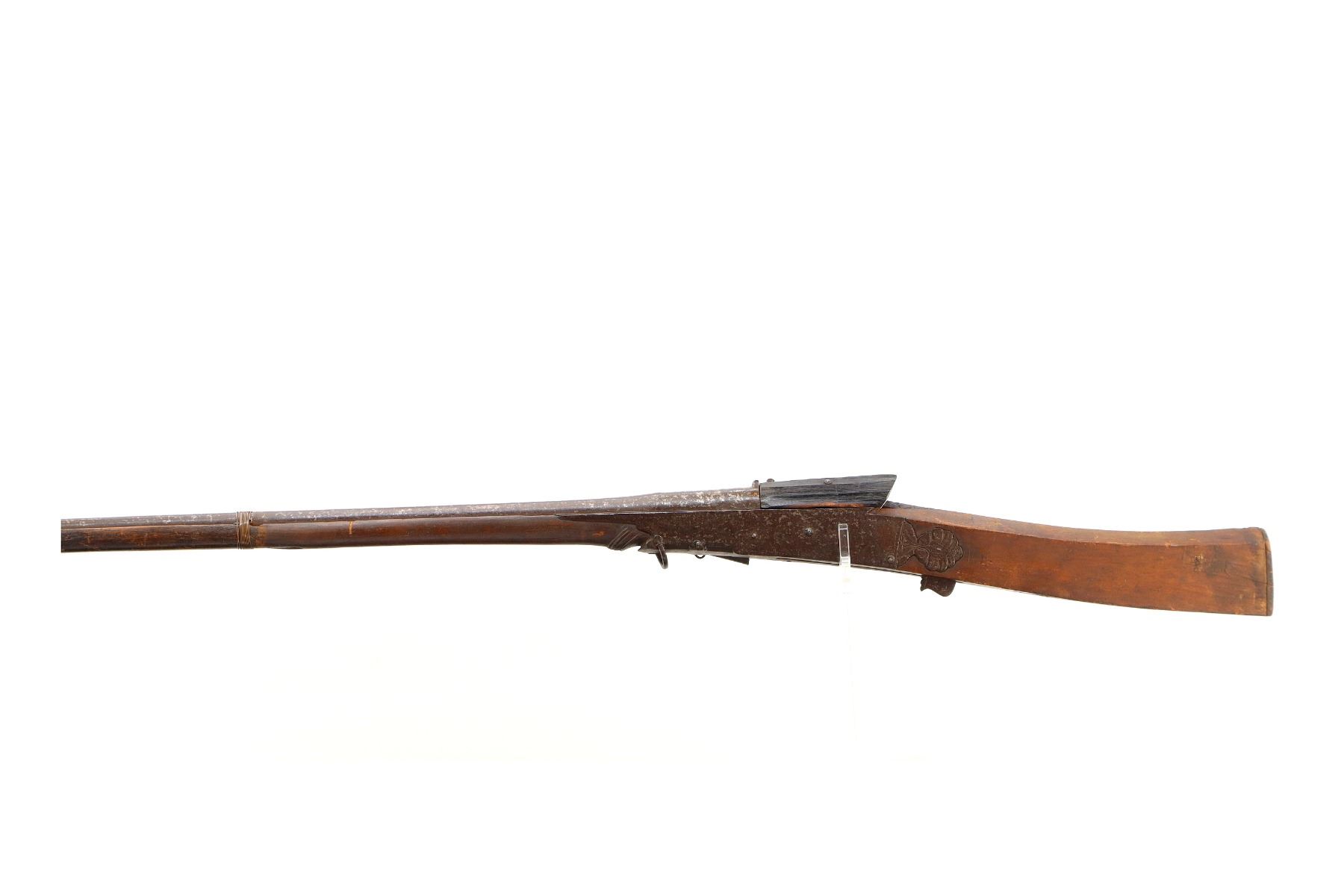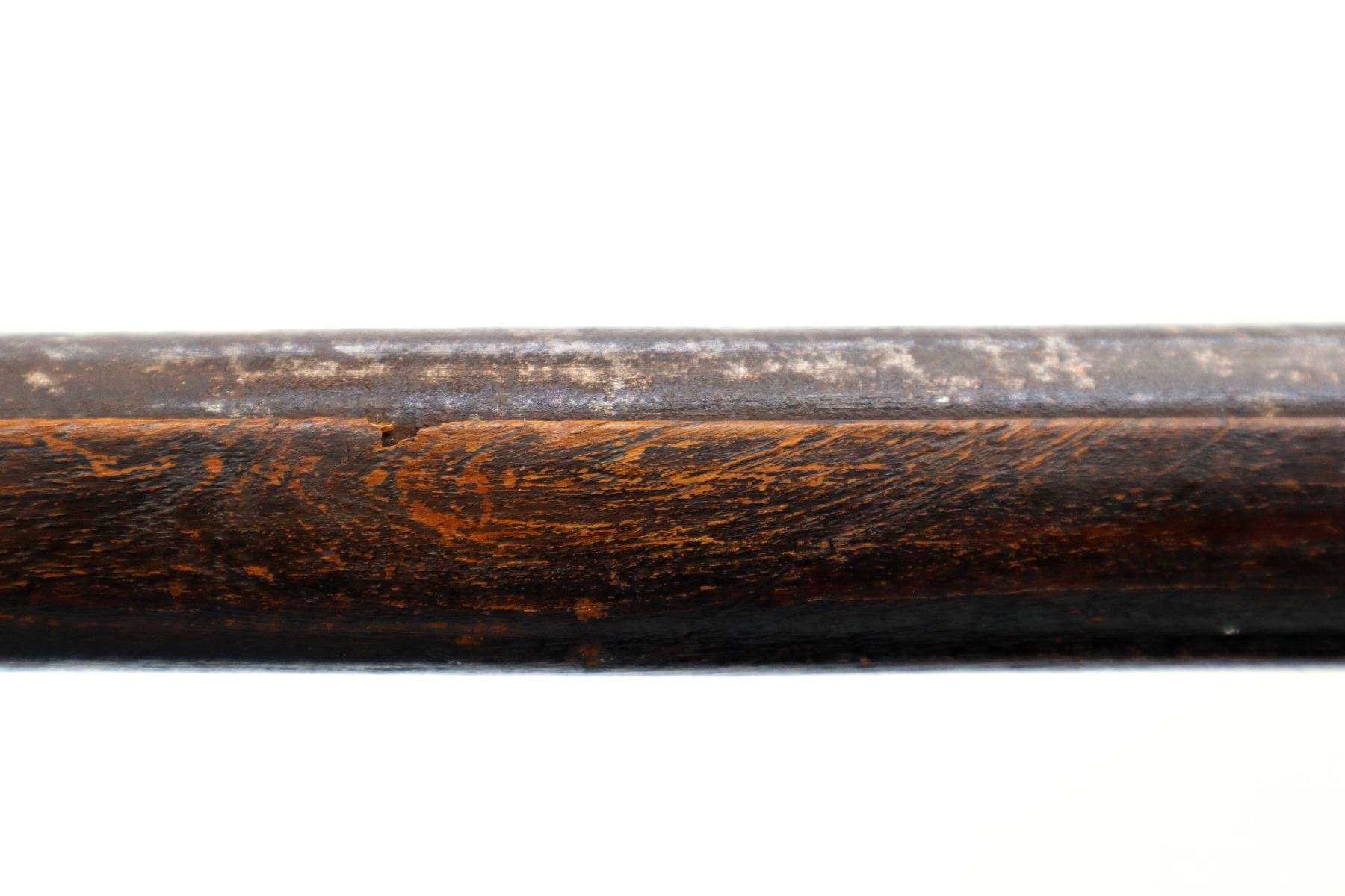 Main Description: Bead front sight, fixed u notched rear sight, tapered round barrel with flared muzzle, cock does not function, flashole pan has a pivoting cover. One piece full length wood stock, chipped and cracked spliced in the middle with copper wire bands, straight grip, smooth butt with age cracks, single swivel, some engraving on side plates.