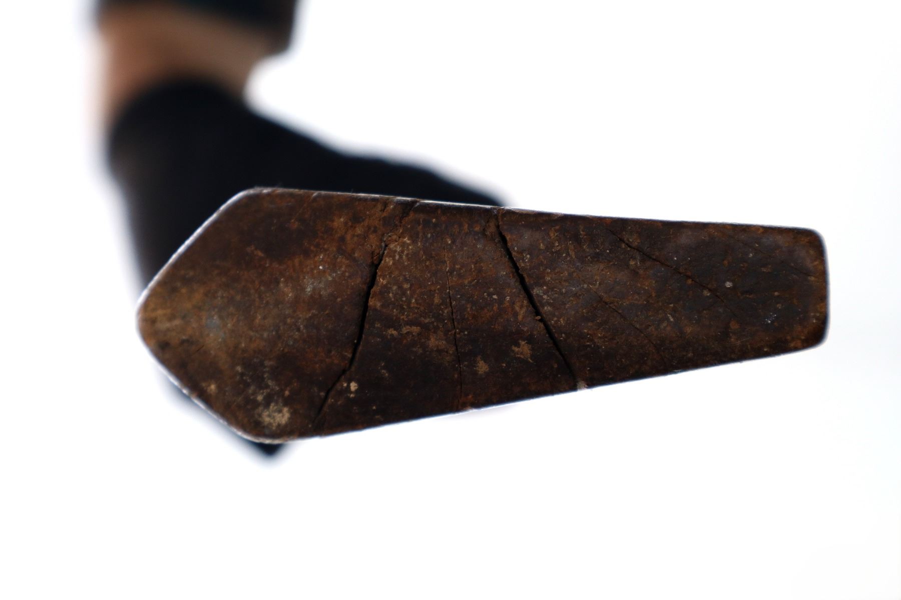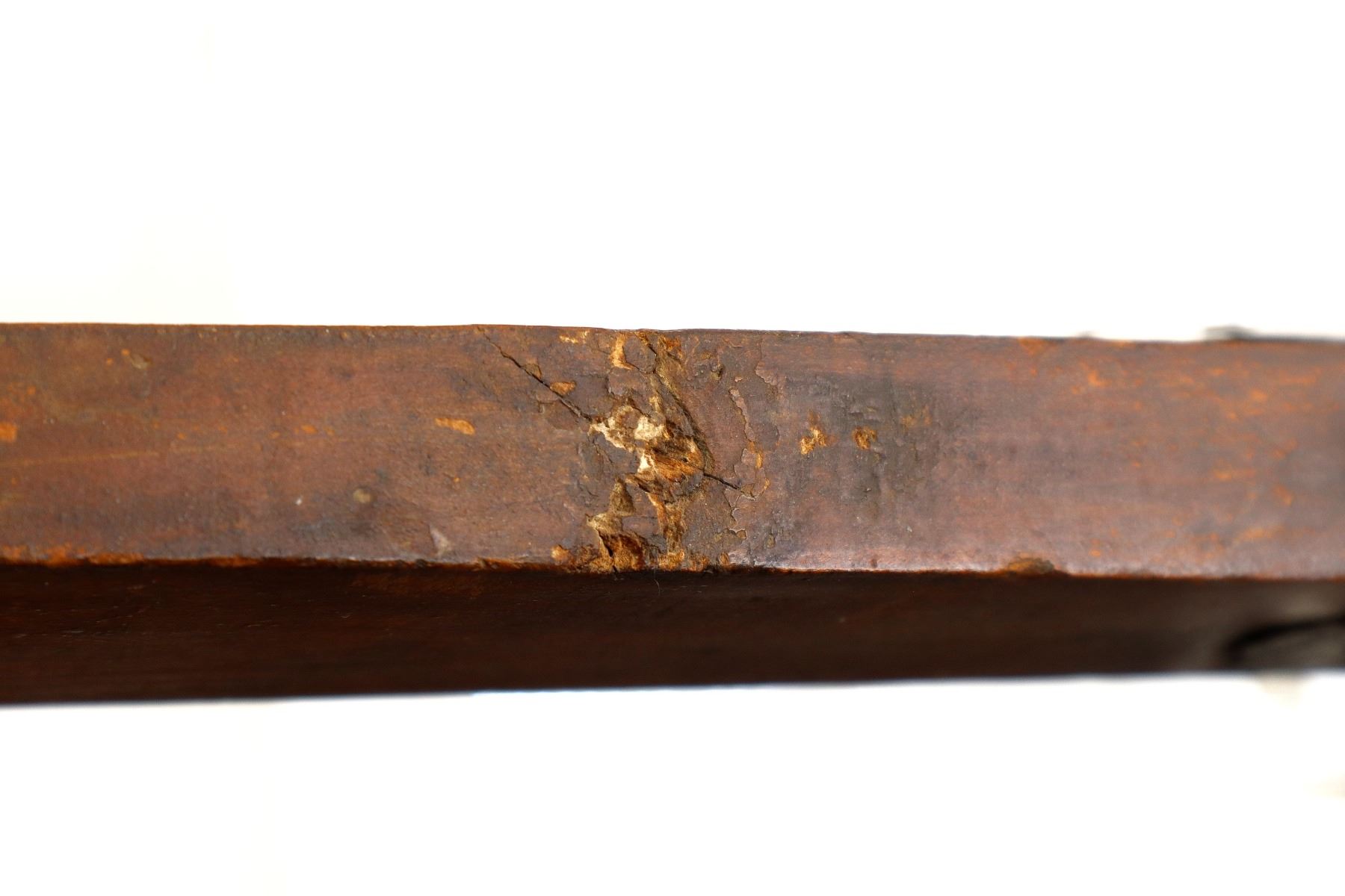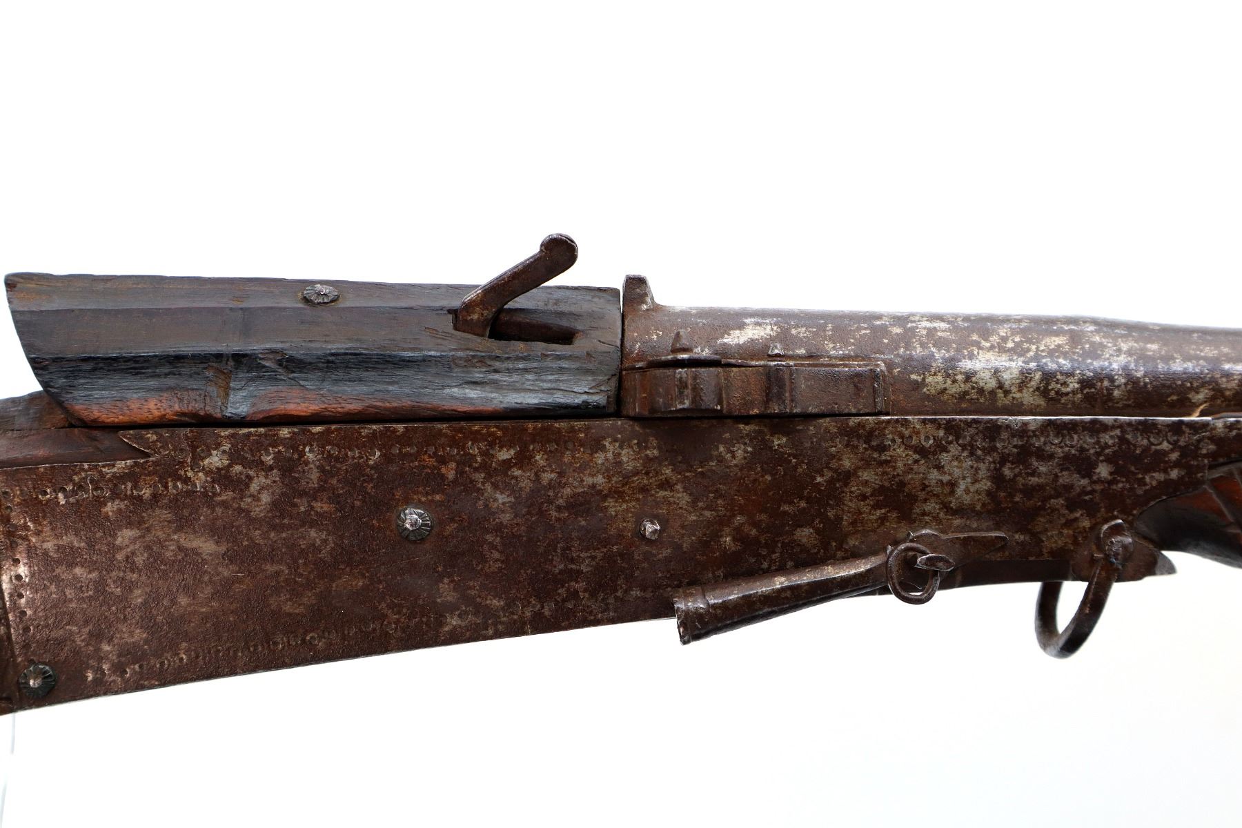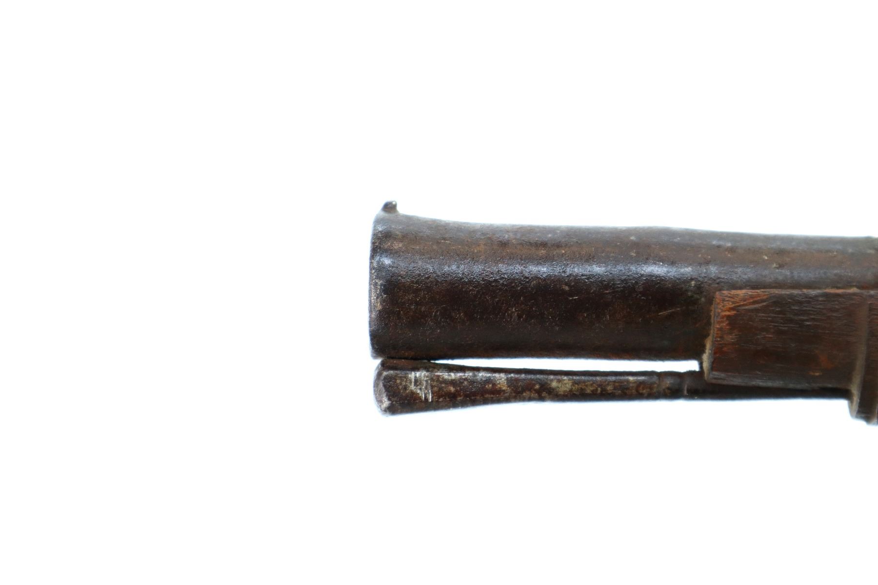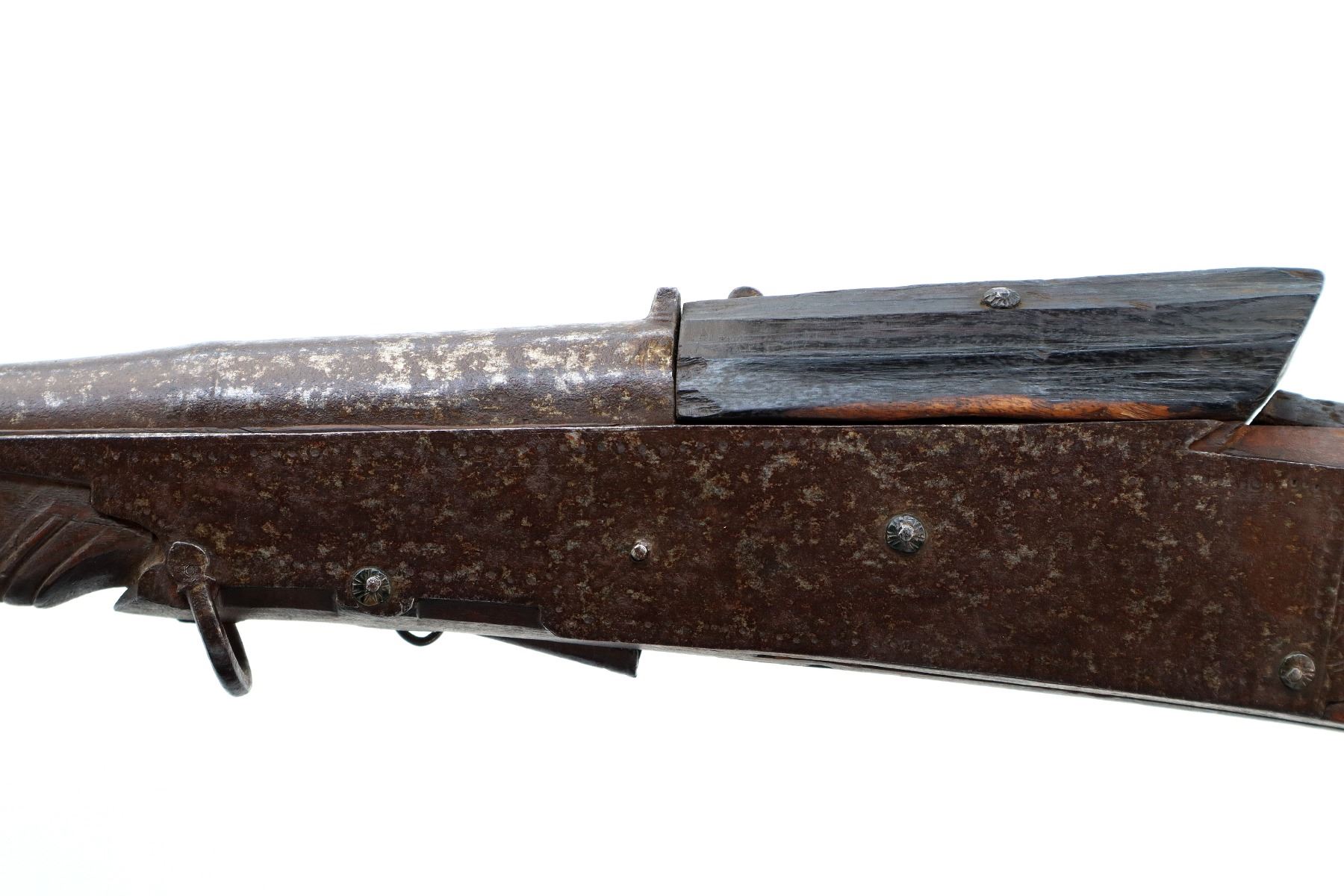 Main Description: Bead front sight, fixed u notched rear sight, tapered round barrel with flared muzzle, cock does not function, flashole pan has a pivoting cover. One piece full length wood stock, chipped and cracked spliced in the middle with copper wire bands, straight grip, smooth butt with age cracks, single swivel, some engraving on side plates.