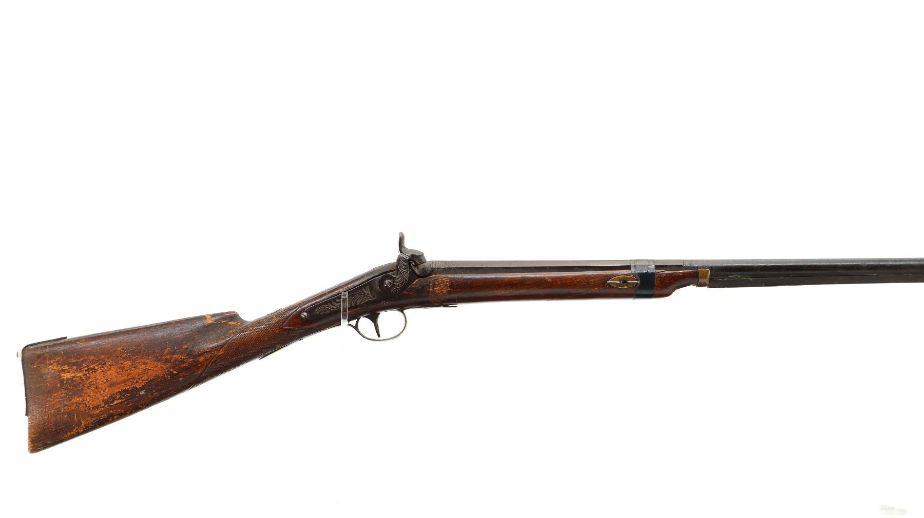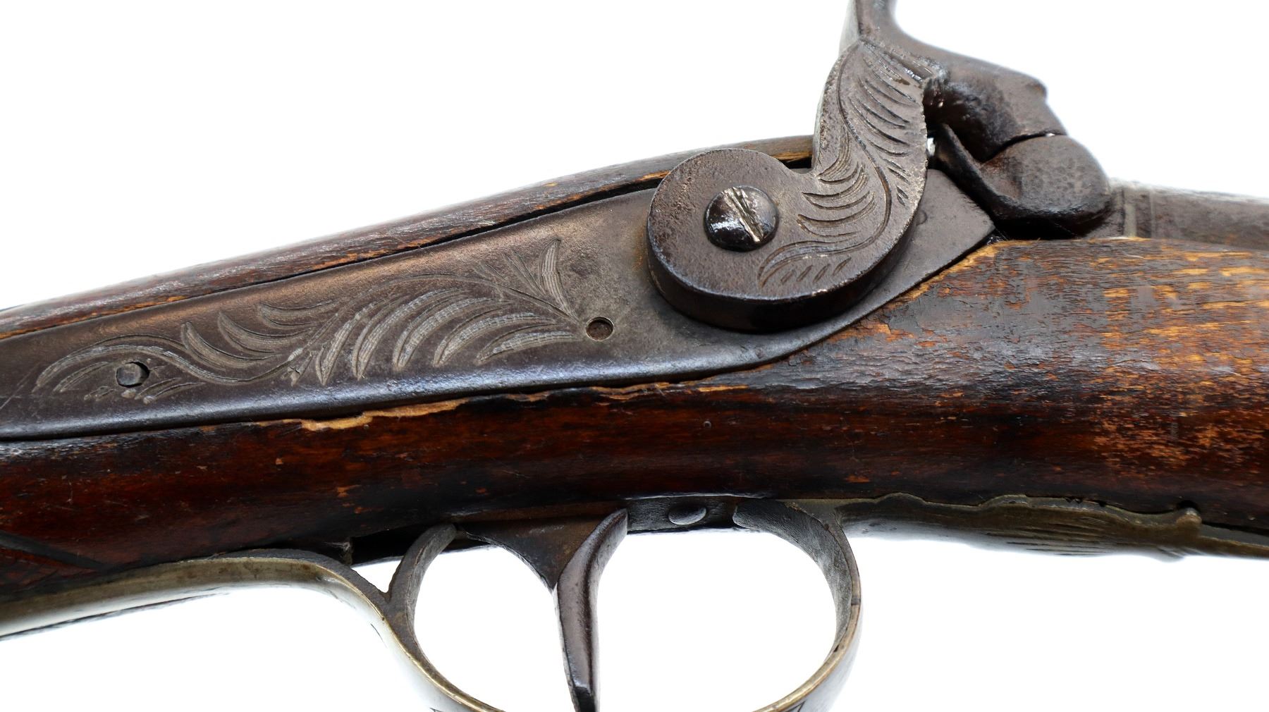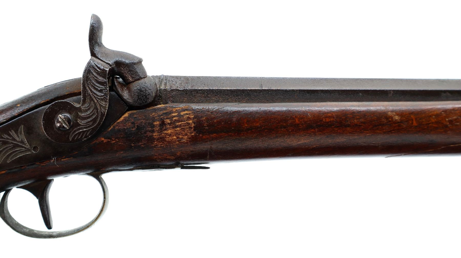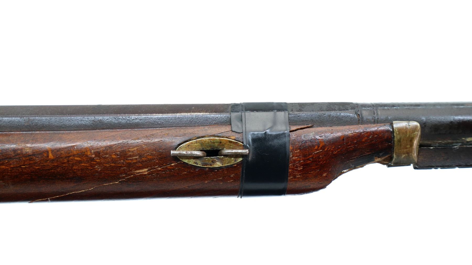 Main Description: Steel bead, 1/3rd octagon, 2/3rd round barrel, engraved back action lock with smooth spur hammer that does not function, nipple is damaged. One piece half length wood stock, replaced wedge, tip is cracked chipped and broken wrapped with tape, checkered straight grip with vanity plate, stock chipped and cracked around lock behind barrel, tang is broken, smooth steel butt plate which is broken, stock cracked at heel, missing ramrod, ramrod guide is loose.