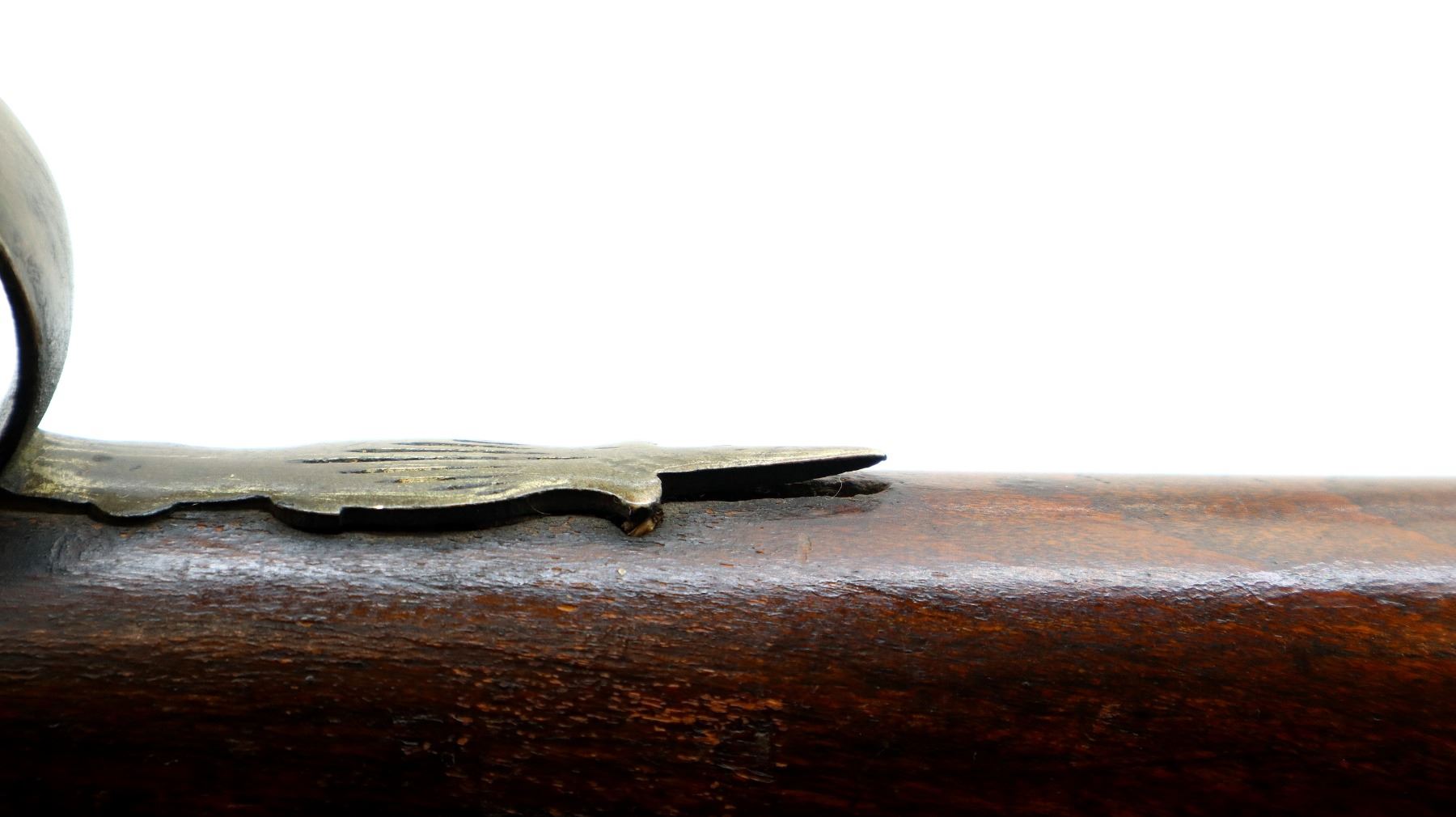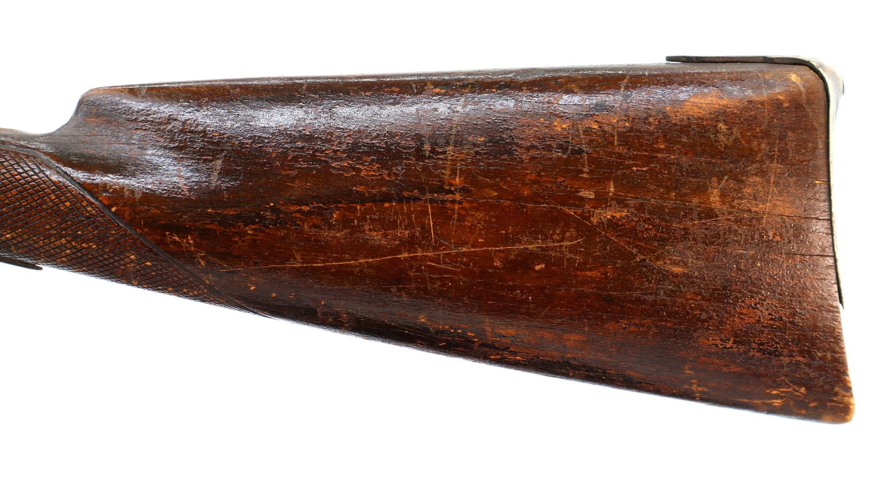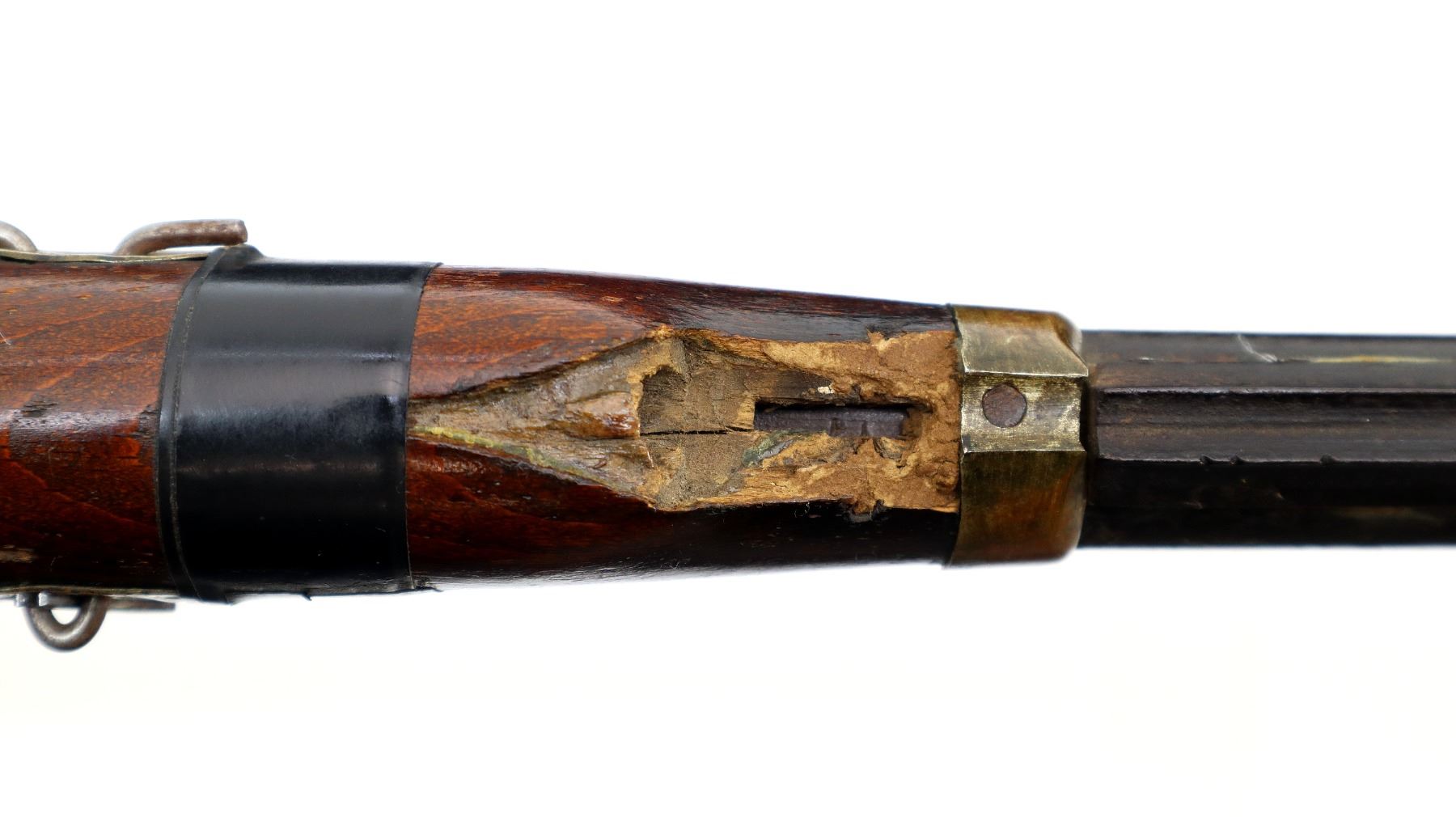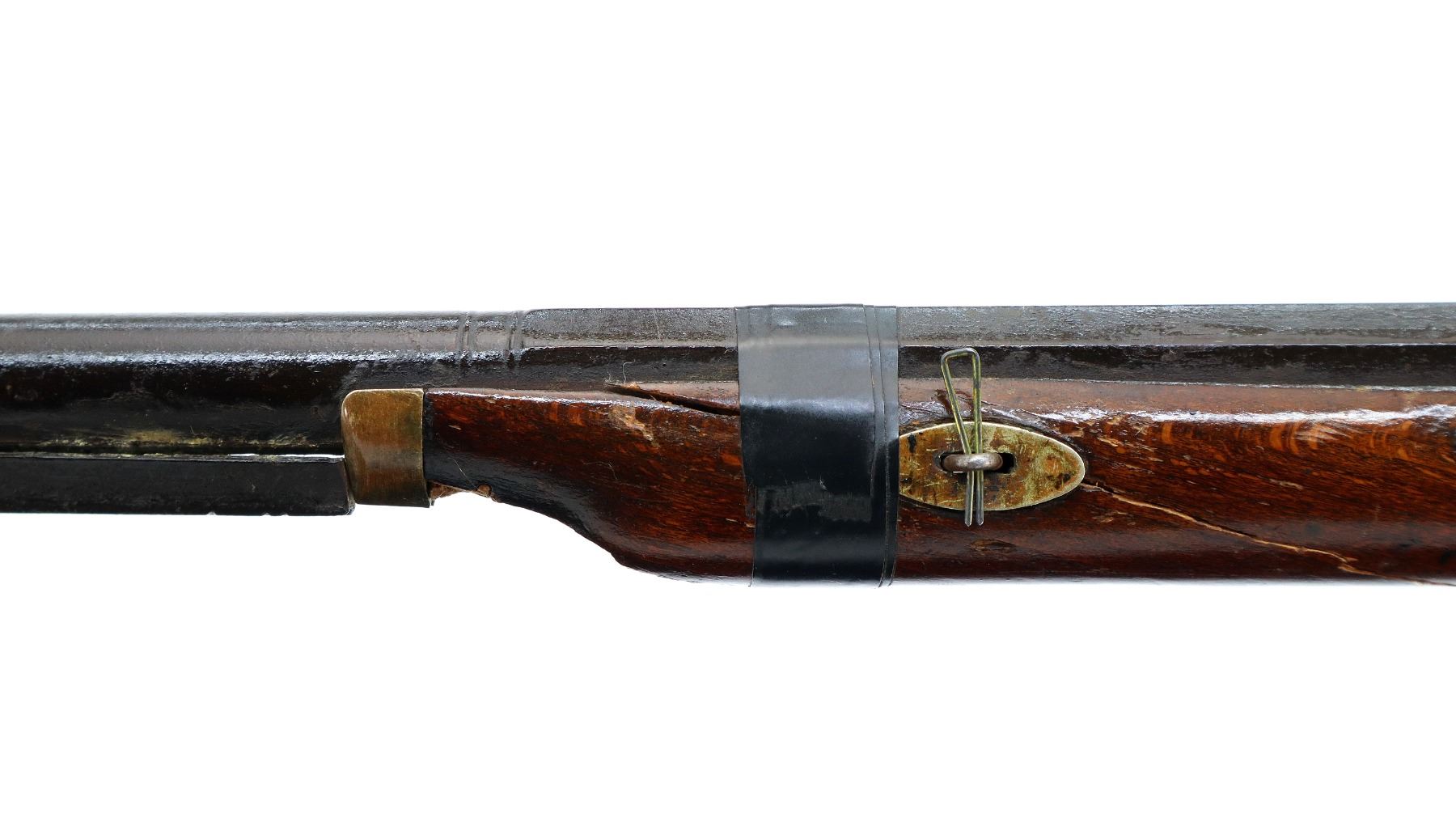 Main Description: Steel bead, 1/3rd octagon, 2/3rd round barrel, engraved back action lock with smooth spur hammer that does not function, nipple is damaged. One piece half length wood stock, replaced wedge, tip is cracked chipped and broken wrapped with tape, checkered straight grip with vanity plate, stock chipped and cracked around lock behind barrel, tang is broken, smooth steel butt plate which is broken, stock cracked at heel, missing ramrod, ramrod guide is loose.