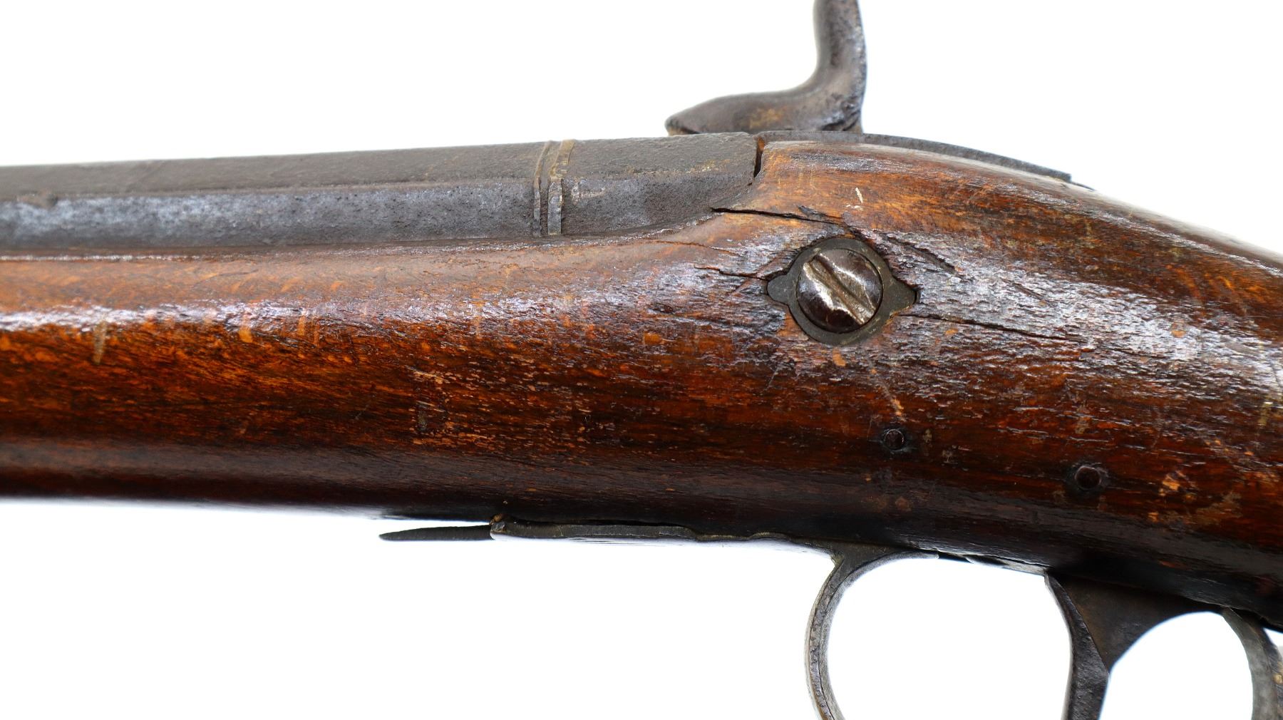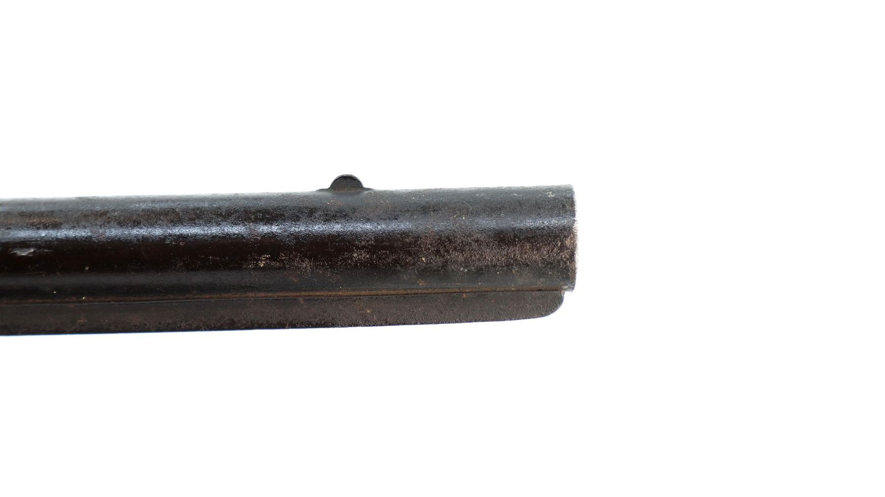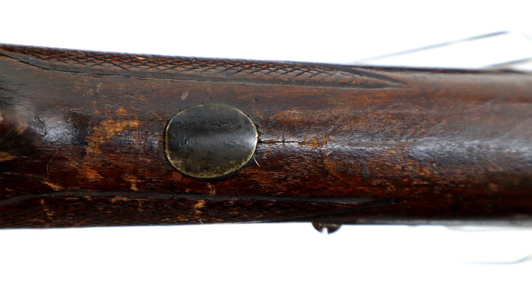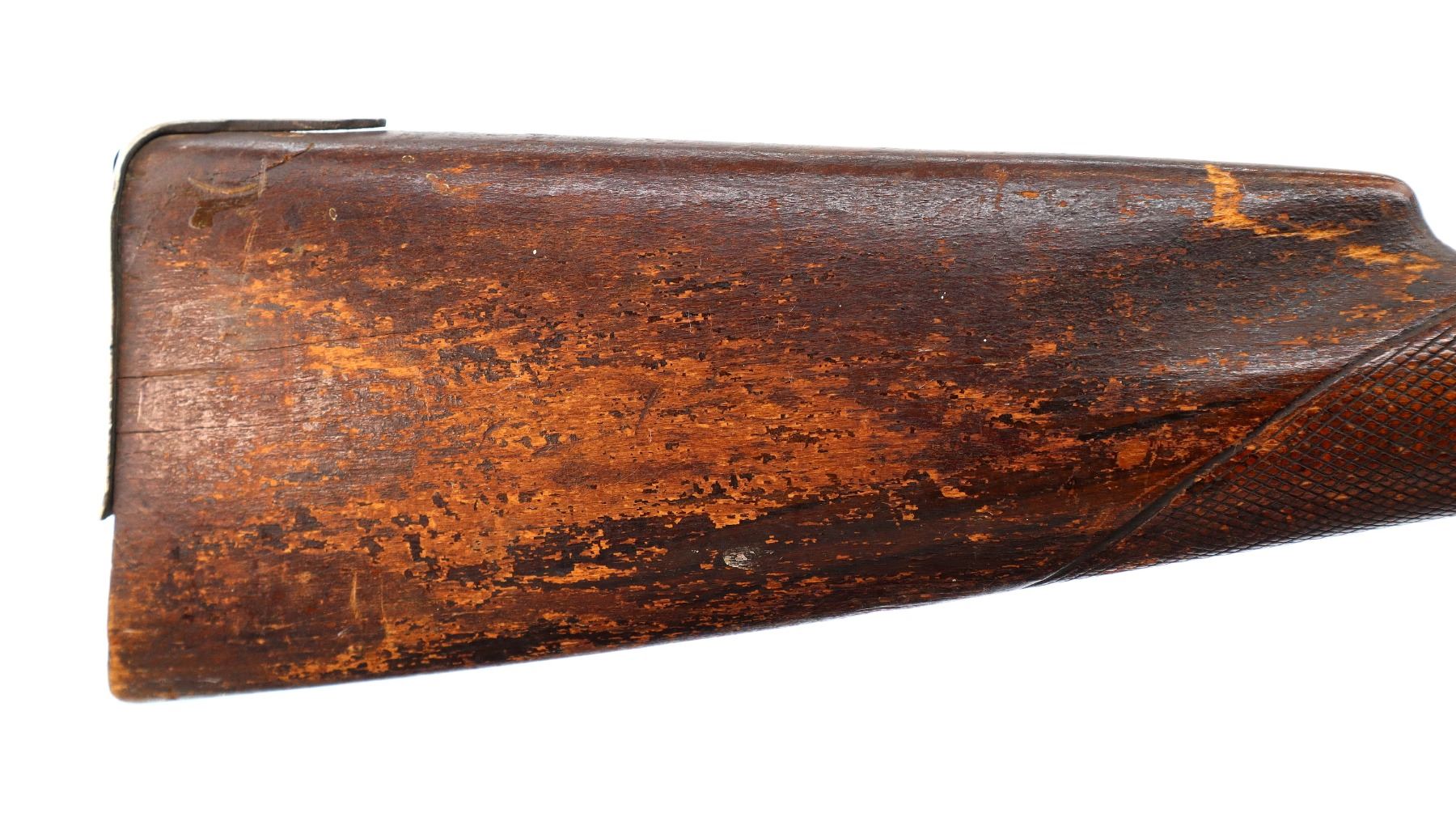 Main Description: Steel bead, 1/3rd octagon, 2/3rd round barrel, engraved back action lock with smooth spur hammer that does not function, nipple is damaged. One piece half length wood stock, replaced wedge, tip is cracked chipped and broken wrapped with tape, checkered straight grip with vanity plate, stock chipped and cracked around lock behind barrel, tang is broken, smooth steel butt plate which is broken, stock cracked at heel, missing ramrod, ramrod guide is loose.