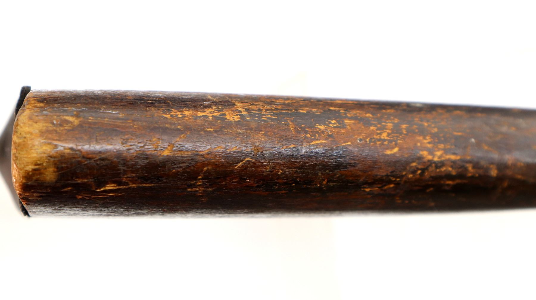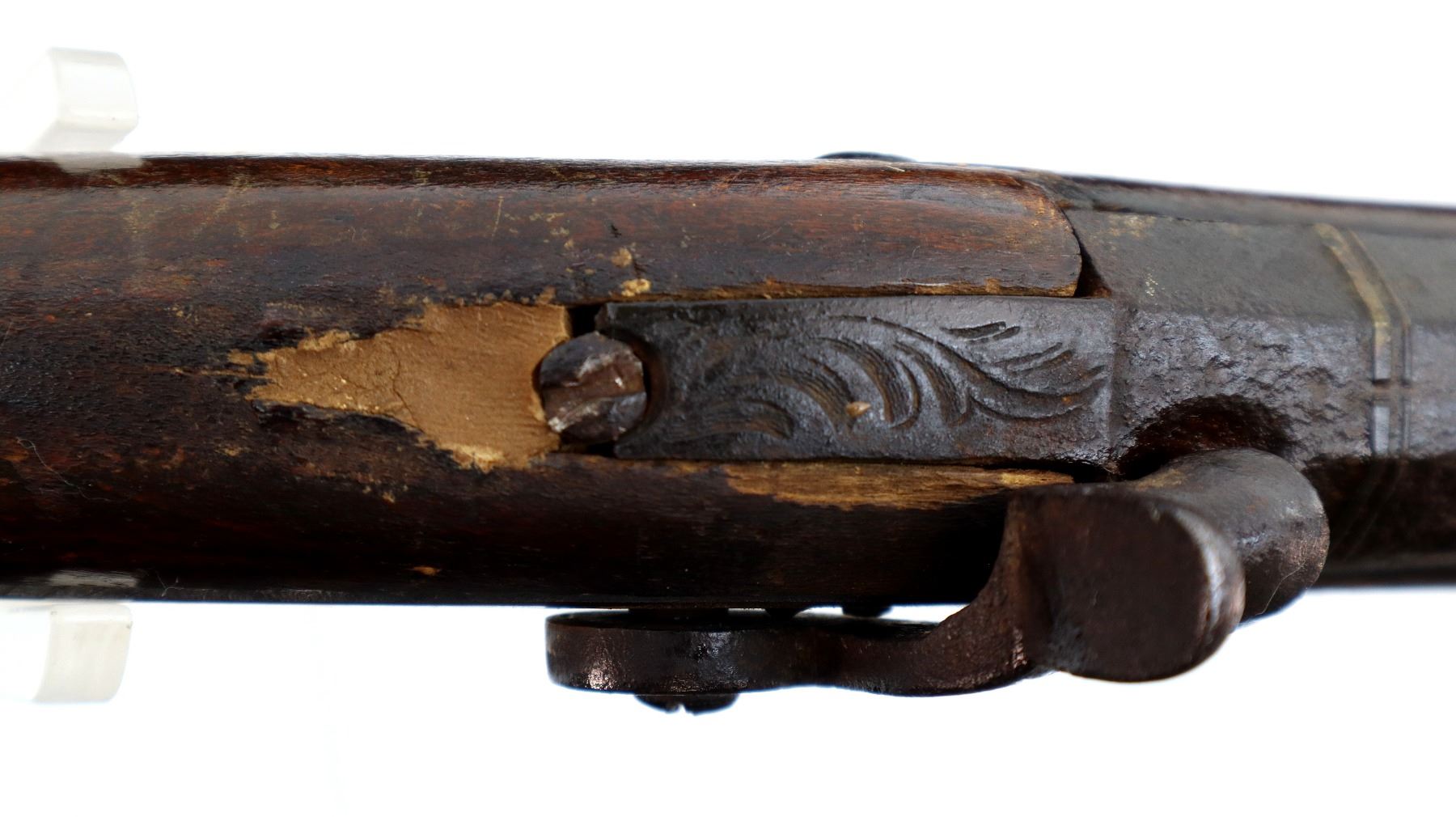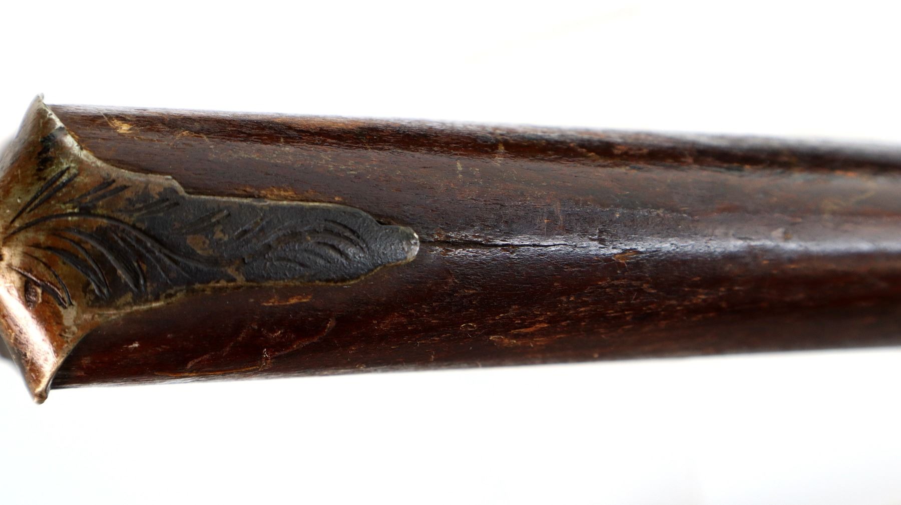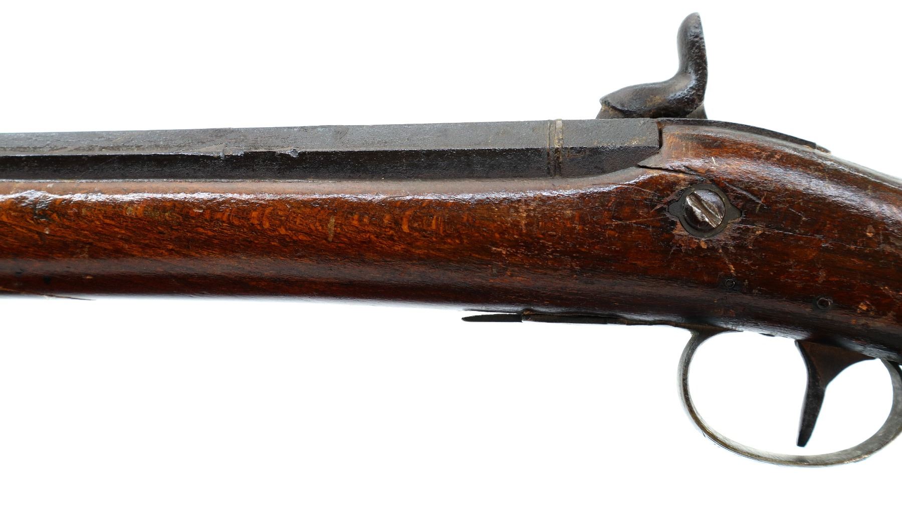 Main Description: Steel bead, 1/3rd octagon, 2/3rd round barrel, engraved back action lock with smooth spur hammer that does not function, nipple is damaged. One piece half length wood stock, replaced wedge, tip is cracked chipped and broken wrapped with tape, checkered straight grip with vanity plate, stock chipped and cracked around lock behind barrel, tang is broken, smooth steel butt plate which is broken, stock cracked at heel, missing ramrod, ramrod guide is loose.
