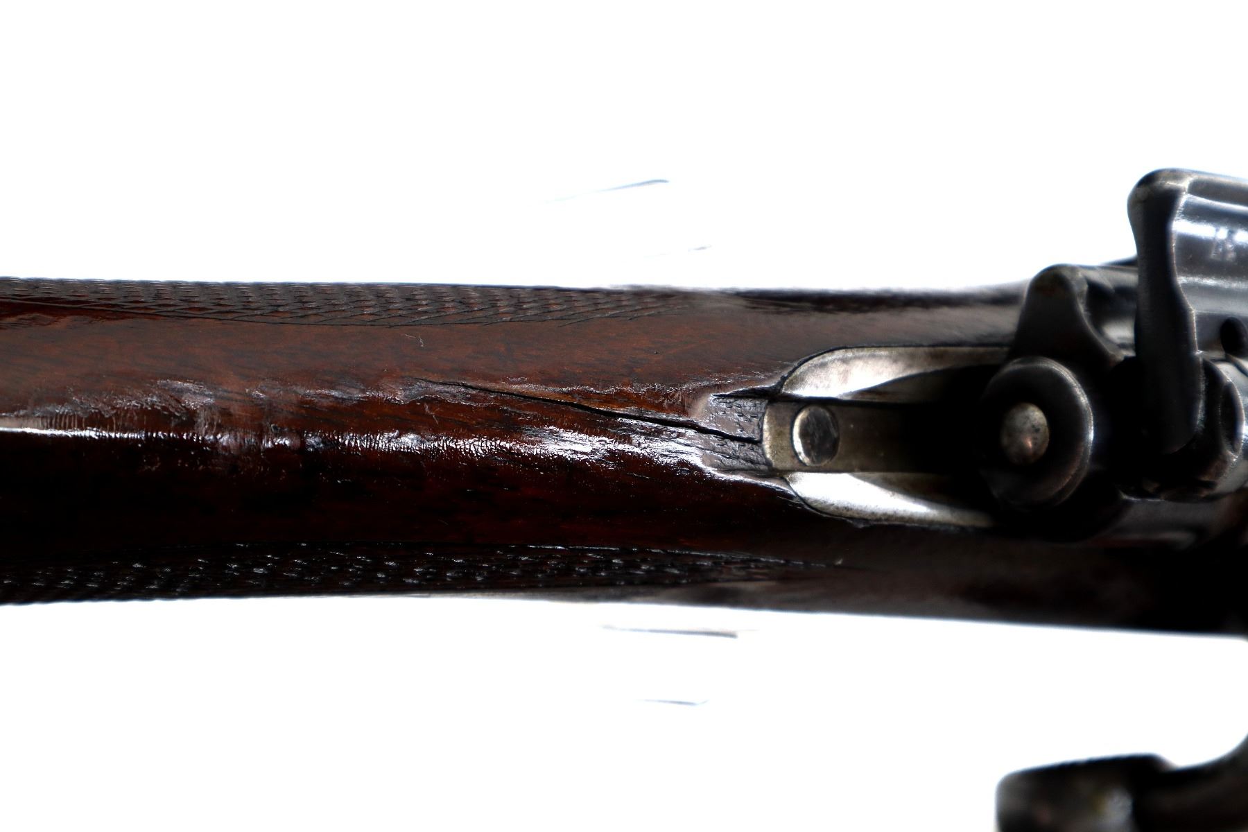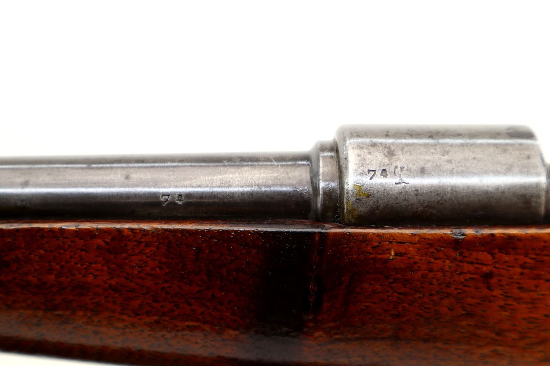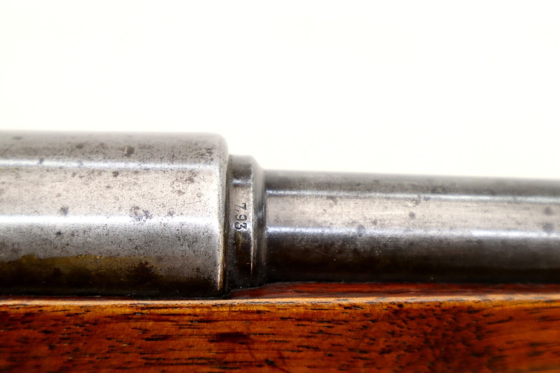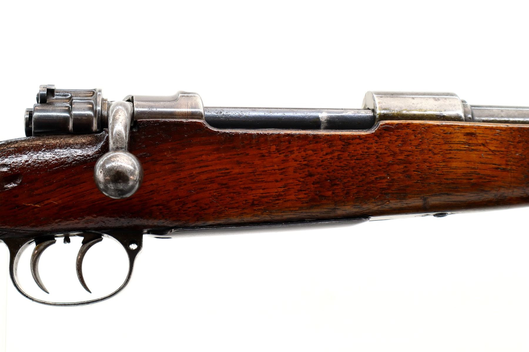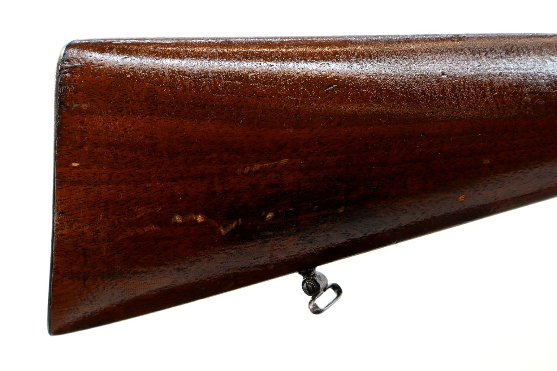 Main Description: Blade front sight with ramp, adjustable u notched rear sight with one fixed and one folding leaf, turned down bolt handle with checkered flat bottomed knob, double set triggers. One piece wood stock, Schnabel forend tip, checkered pistol grip cracked behind receiver, European cheek rest, smooth steel butt plate, stock cracked at heel. Sling swivels
