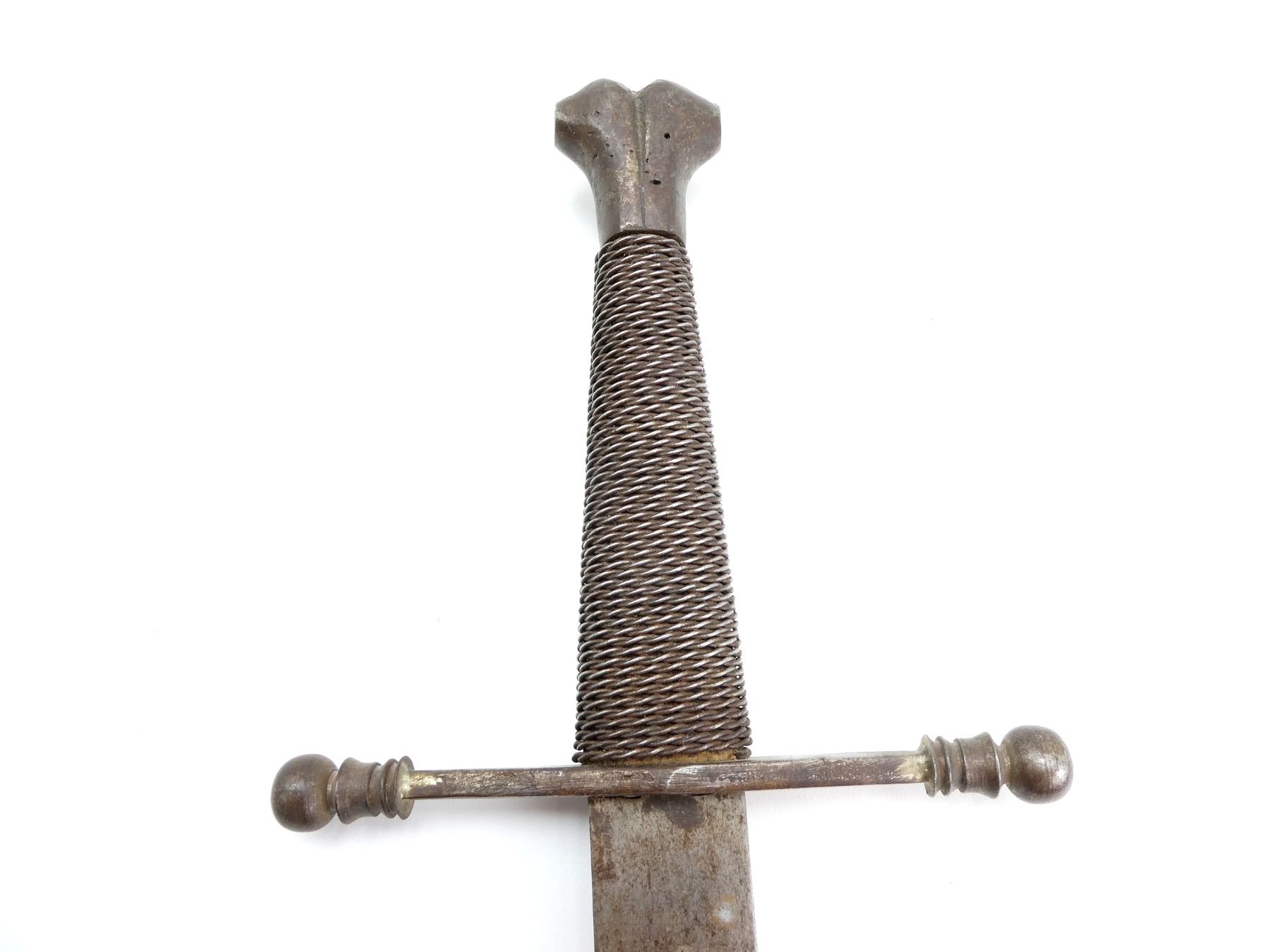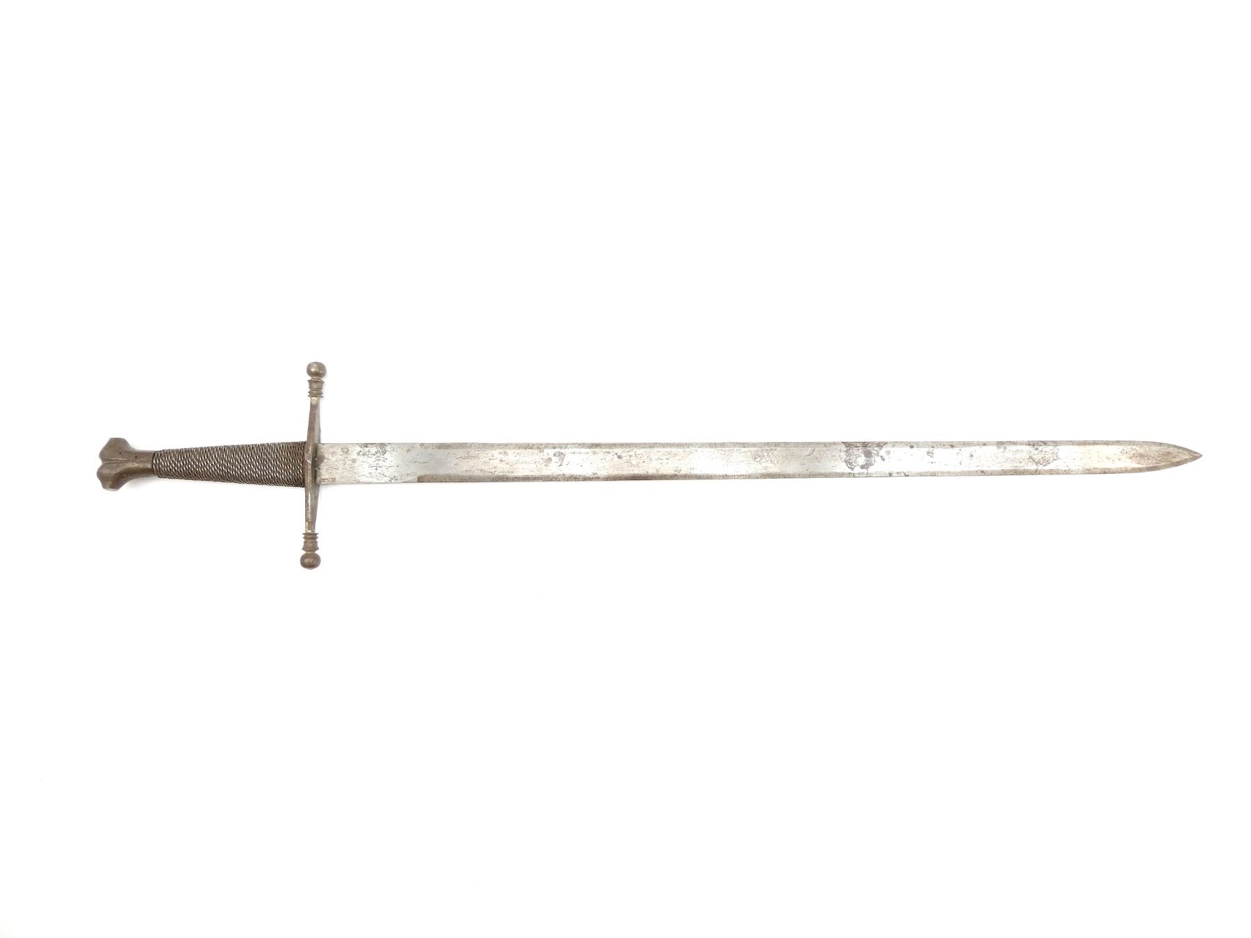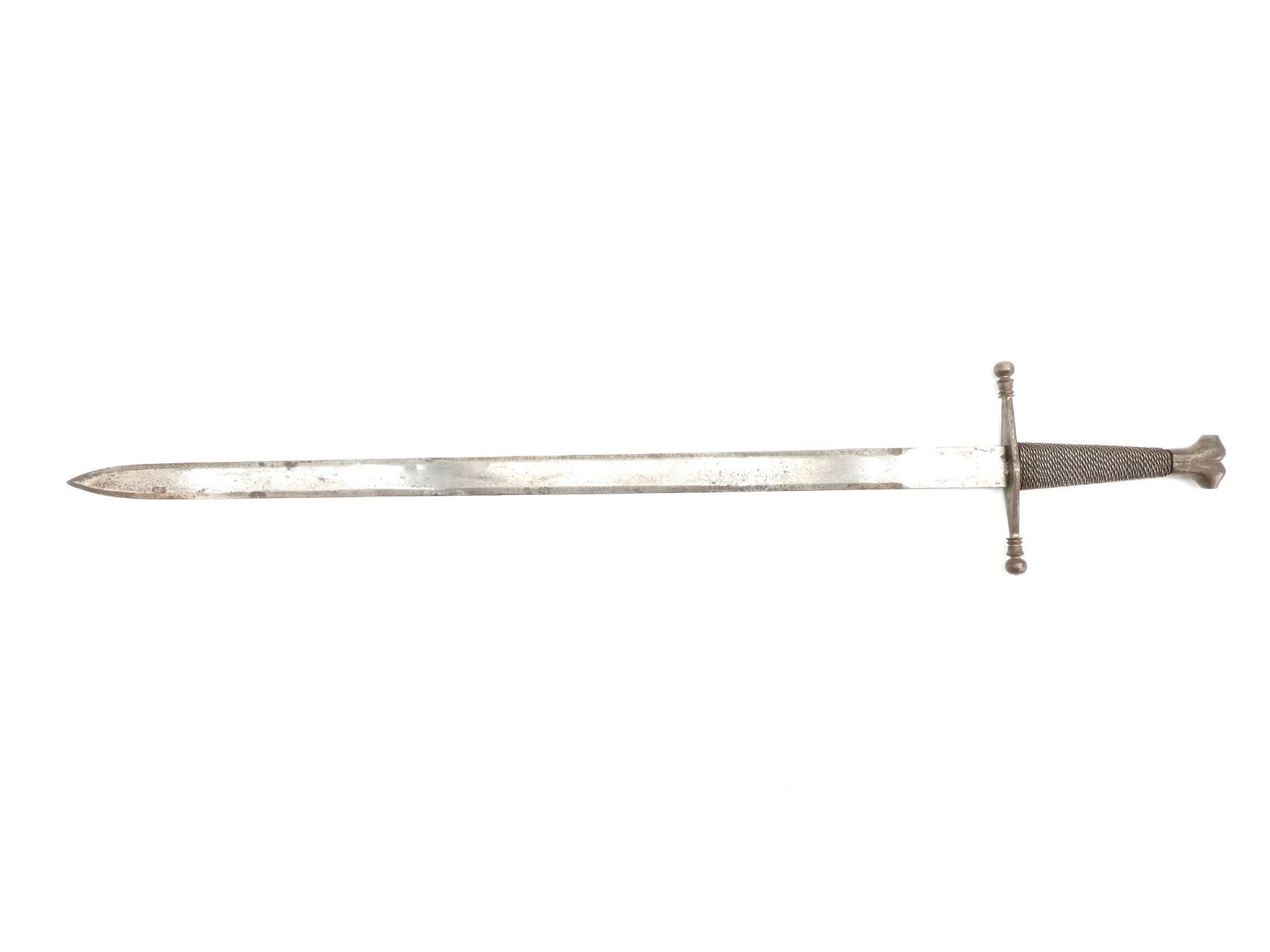 (1) STRAIGHT DOUBLE-EDGED STEEL BLADE, CROSS-GUARD WITH BALL ENDS, TWISTED WIRE WRAPPED GRIP, DECORATIVE BONE SHAPED METAL POMMEL, NO VISIBLE MARKINGS, BLADE APPROX. 23.75" & OAL APPROX. 29.5". SEE PHOTOS.