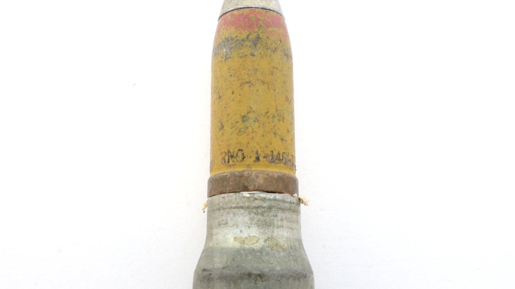 (1) STEEL CASING, STEEL YELLOW / RED PAINTED PROJECTILE, COPPER BAND, FIRED PRIMER, PROJECTILE TIP MARKED: "INERT", PROJECTILE BODY MARKED: "?NO-1-146-73-M?GA", HAND-WRITTEN MARKINGS ON CASING BODY, APPROX. 1 1/8" DIA. & OAL APPROX. 6 5/8". SEE PHOTOS.