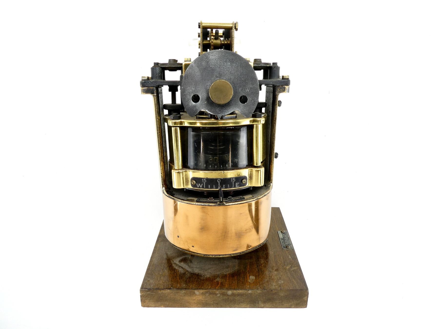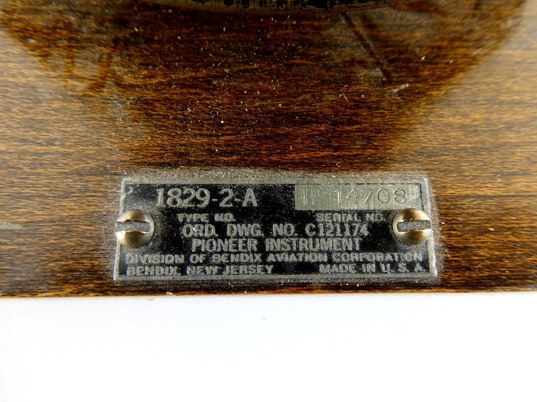 (1) BRASS / METAL CONSTRUCTED COMPASS, UN-TESTED, DATA PLATE, MARKED: "1829-2-A TYPE NO., H-14708 SERIAL NO., ORD. DWG. NO. C121174, PIONEER INSTRUMENT, DIVISION OF BENDIX AVIATION CORPORATION, BENDIX, NEW JERSEY, MADE IN U.S.A.", VARIOUS OTHER MARKINGS ON COMPASS, COMPASS FLUID UNDER GLASS, APPROX. 5 5/8" X 5.5" X 8.75". SEE PHOTOS. *NO GUARANTEE ON GLASS FOR SHIPPING*