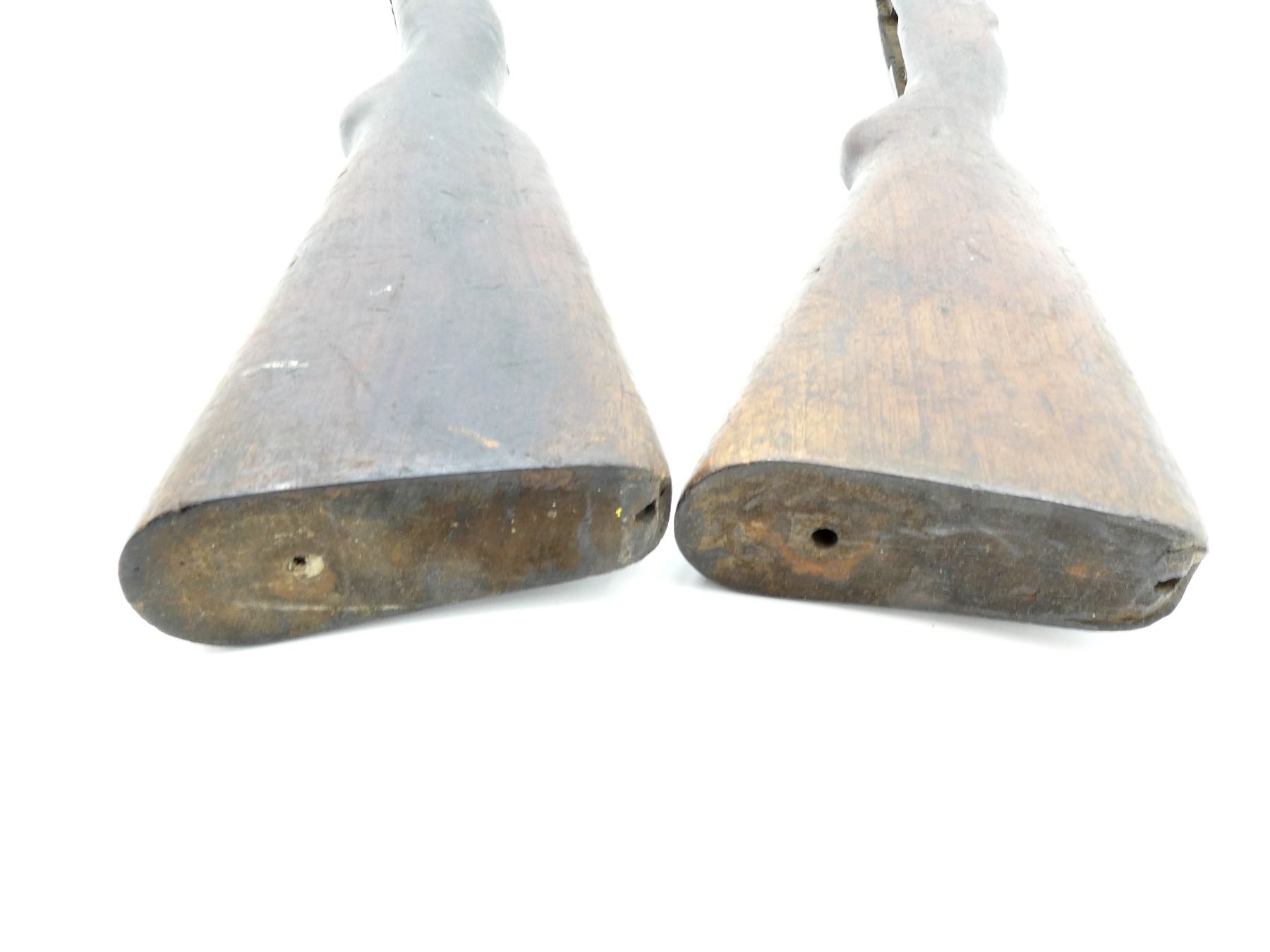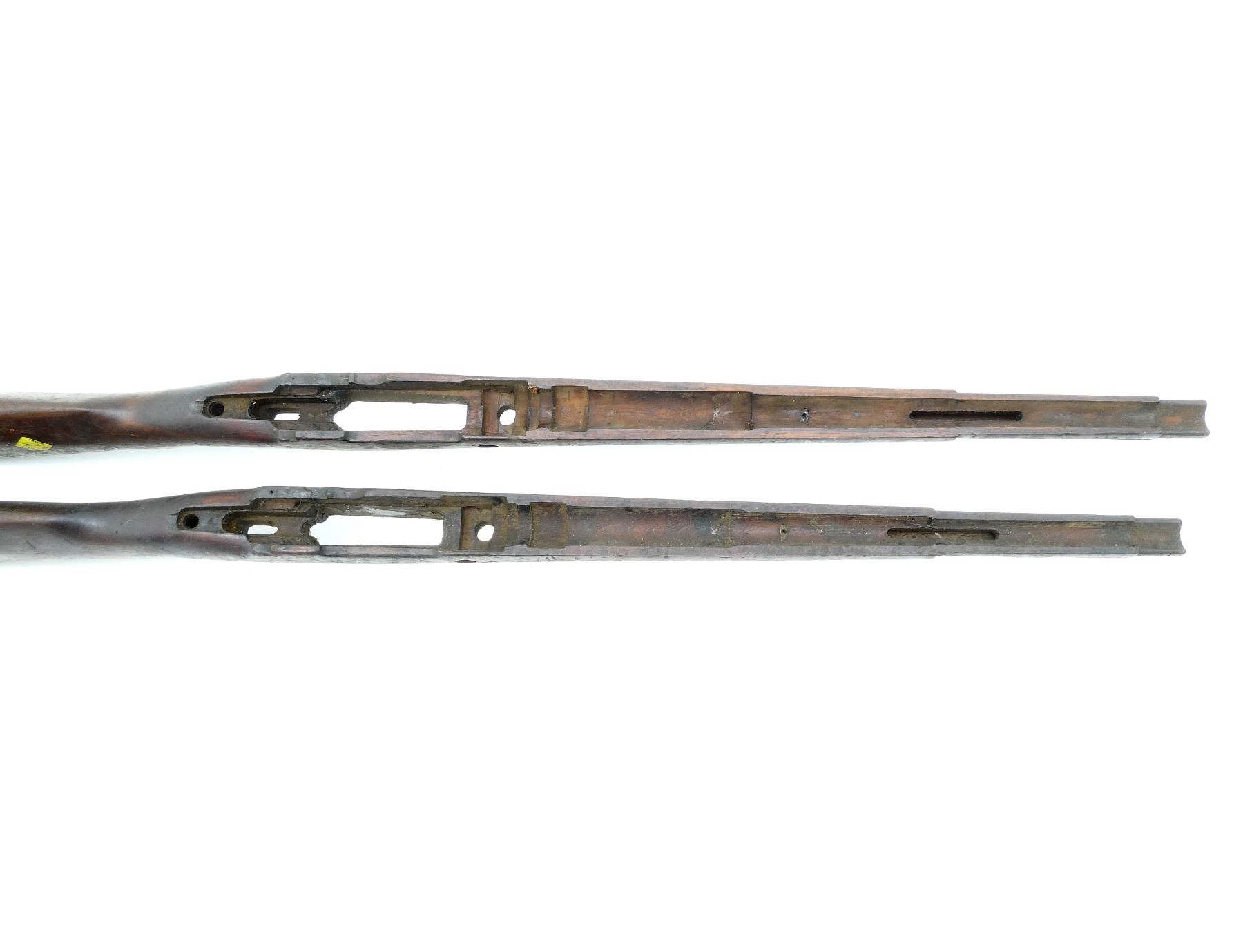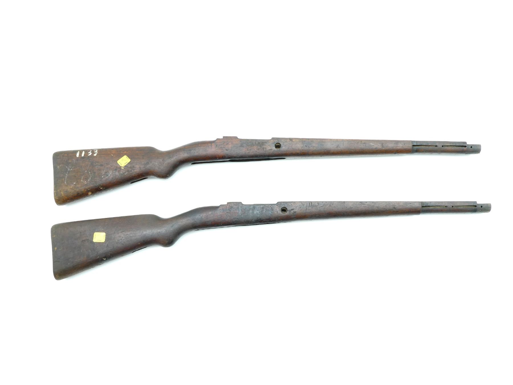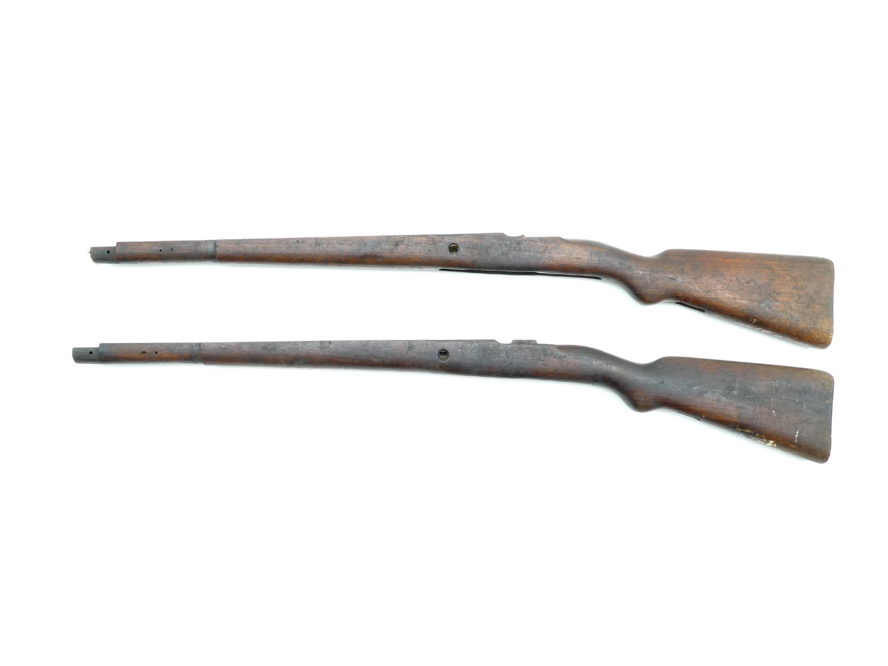 LOT INCLUDES; (2) WOODEN STOCKS, SMOOTH, PISTOL GRIP, STRIPPED - NO PARTS, MAY HAVE SMALL CRACKS & CHIPS / SHOWS WEAR / TEAR, UNMARKED, OAL APPROX. 37". MAY REQUIRE FITTING. SEE PHOTOS.