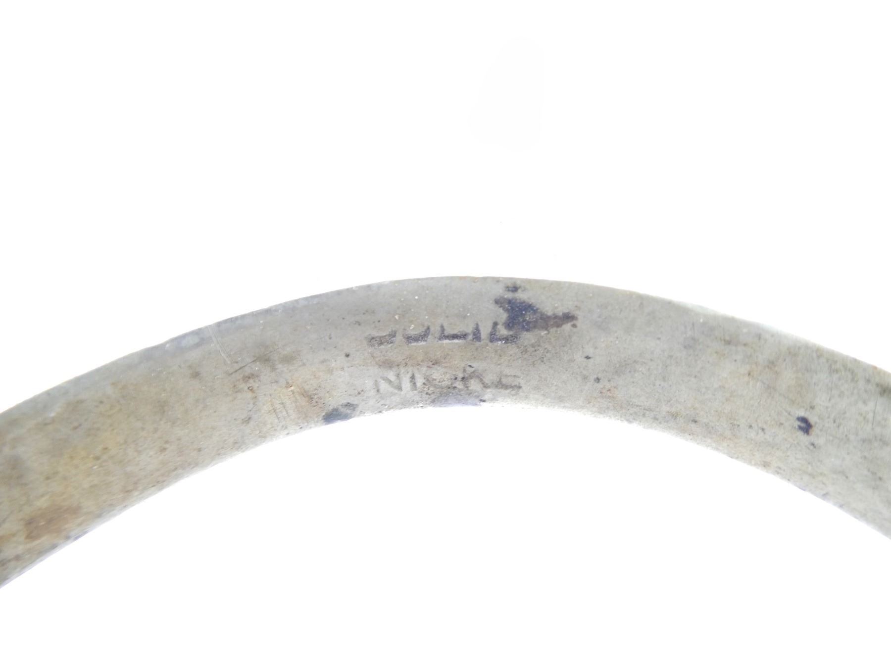 (1) PAIR OF BOOT SPURS, METAL SPURS WITH LEATHER STRAPS, METAL PARTIALLY MARKED: "SOLID NICKEL", ONE HAS VARIOUS HAND-WRITTEN MARKINGS, NO VISIBLE MARKINGS ON LEATHER, LEATHER IS PARTIALLY STIFF, SHOWS WEAR / TEAR, APPROX. 3 3/8" L X 3 1/8" W, OAL APPROX. 5". SEE PHOTOS.