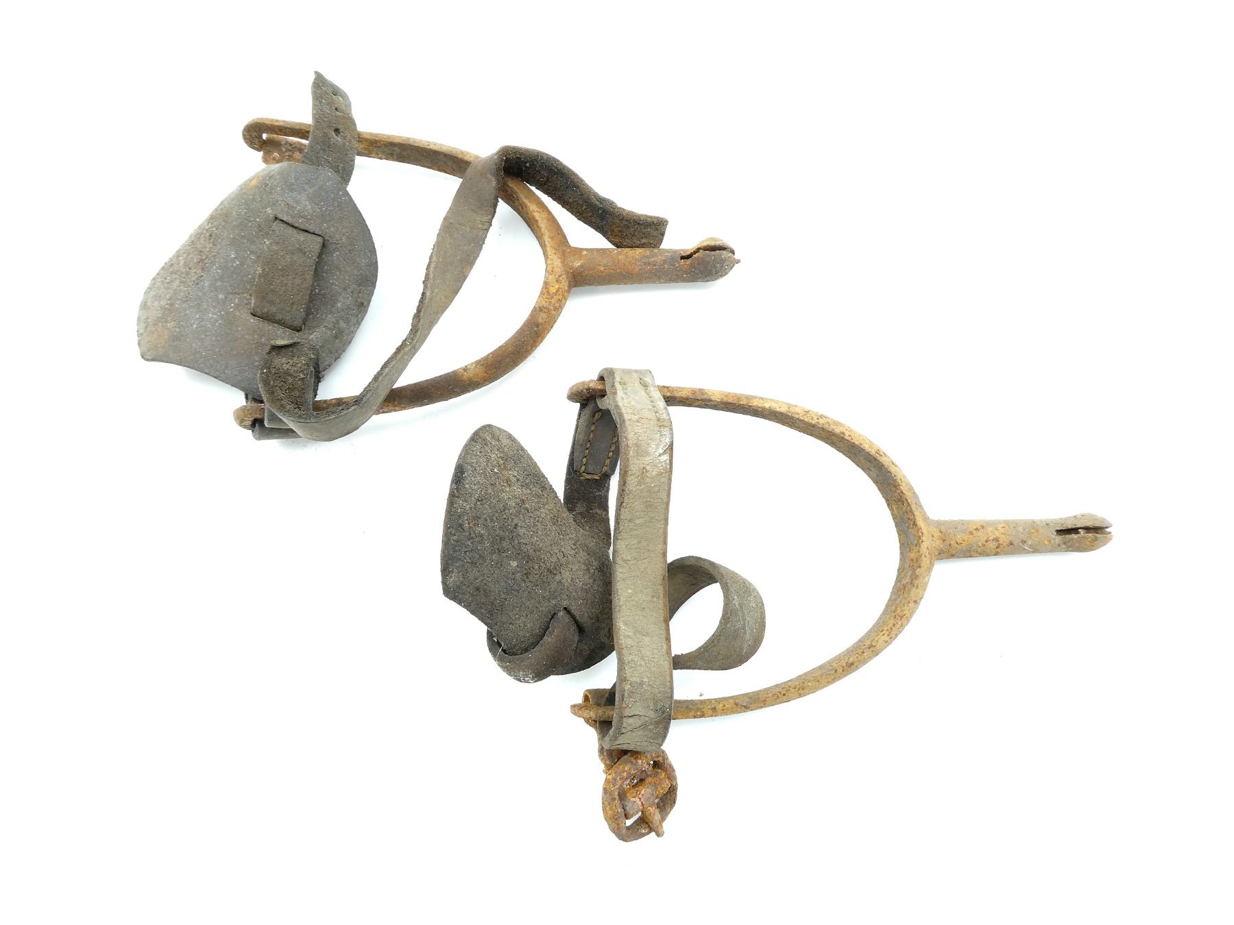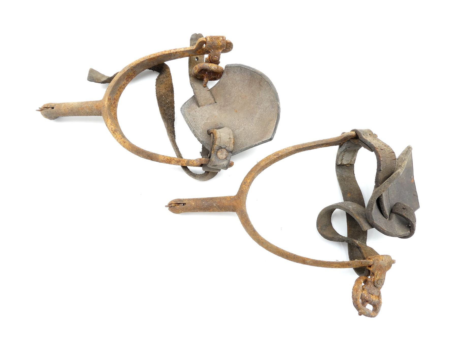 (1) PAIR OF BOOT SPURS, METAL SPURS WITH LEATHER STRAPS, NO VISIBLE MARKINGS ON METAL (RUSTED), NO VISIBLE MARKINGS ON LEATHER, LEATHER IS STIFF, SPURS SHOWS AGE / WEAR / TEAR, APPROX. 4" L X 3.75" W, OAL APPROX. 6.5". SEE PHOTOS.