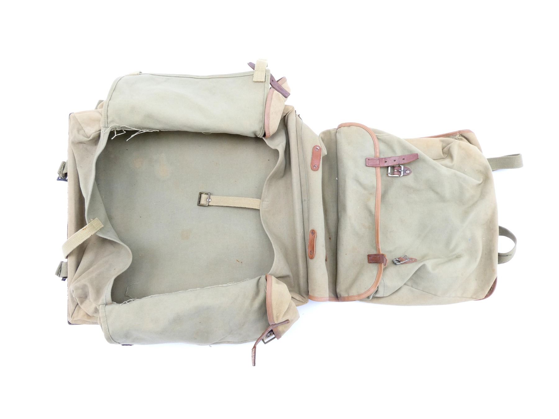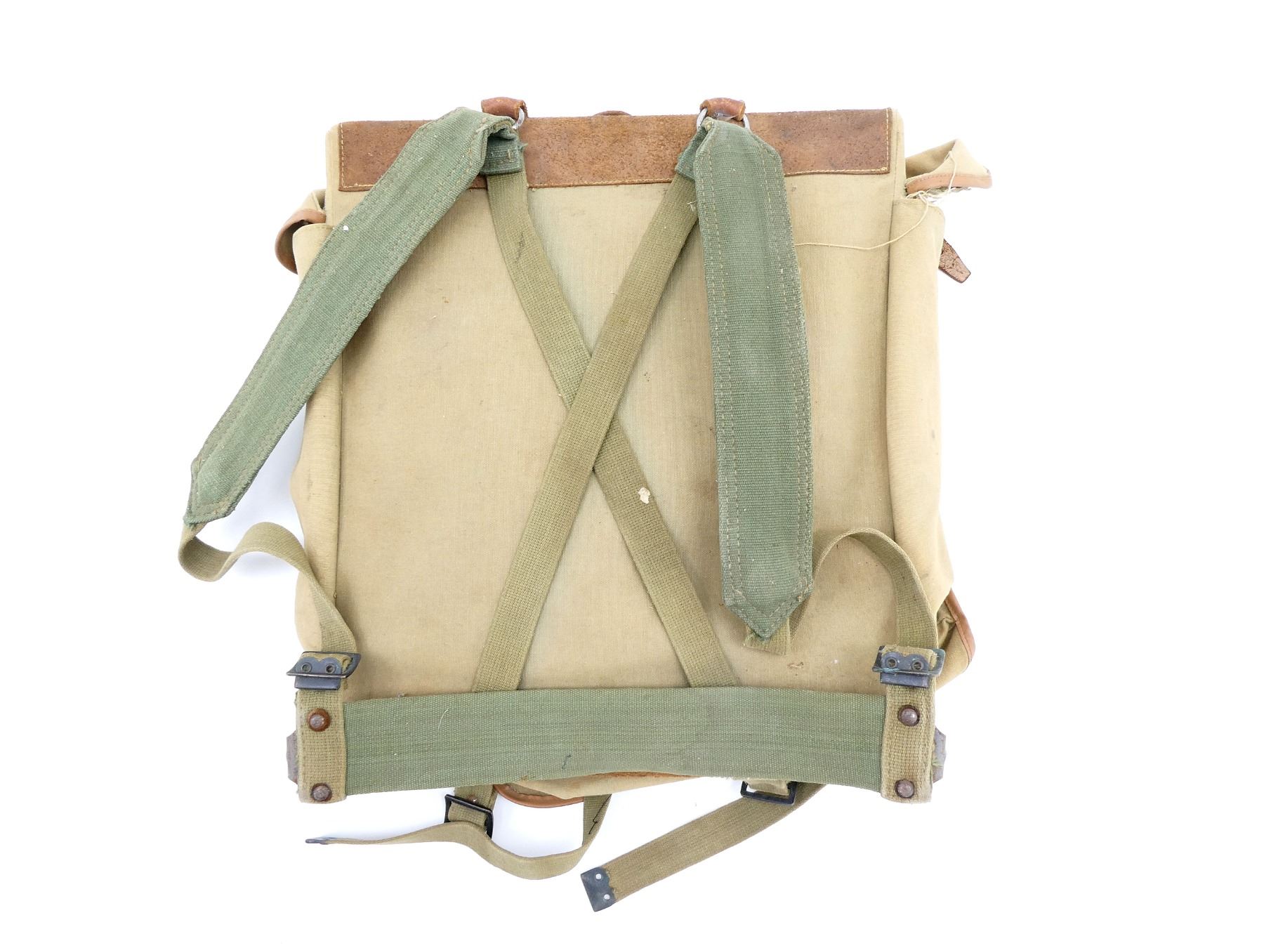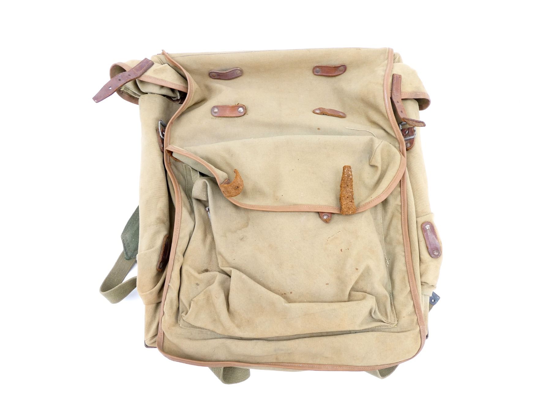 (1) TAN CANVAS & LEATHER TORNISTER, WOODEN CONSTRUCTED FRAME, NO VISIBLE MARKINGS, VARIOUS CANVAS / LEATHER STRAPS, VARIOUS POCKETS, WITH SHOULDER STRAPS, METAL BRACKETS ON BOTTOM CORNERS, SHOWS WEAR, APPROX. 16" X 14.5" X 7". SEE PHOTOS.