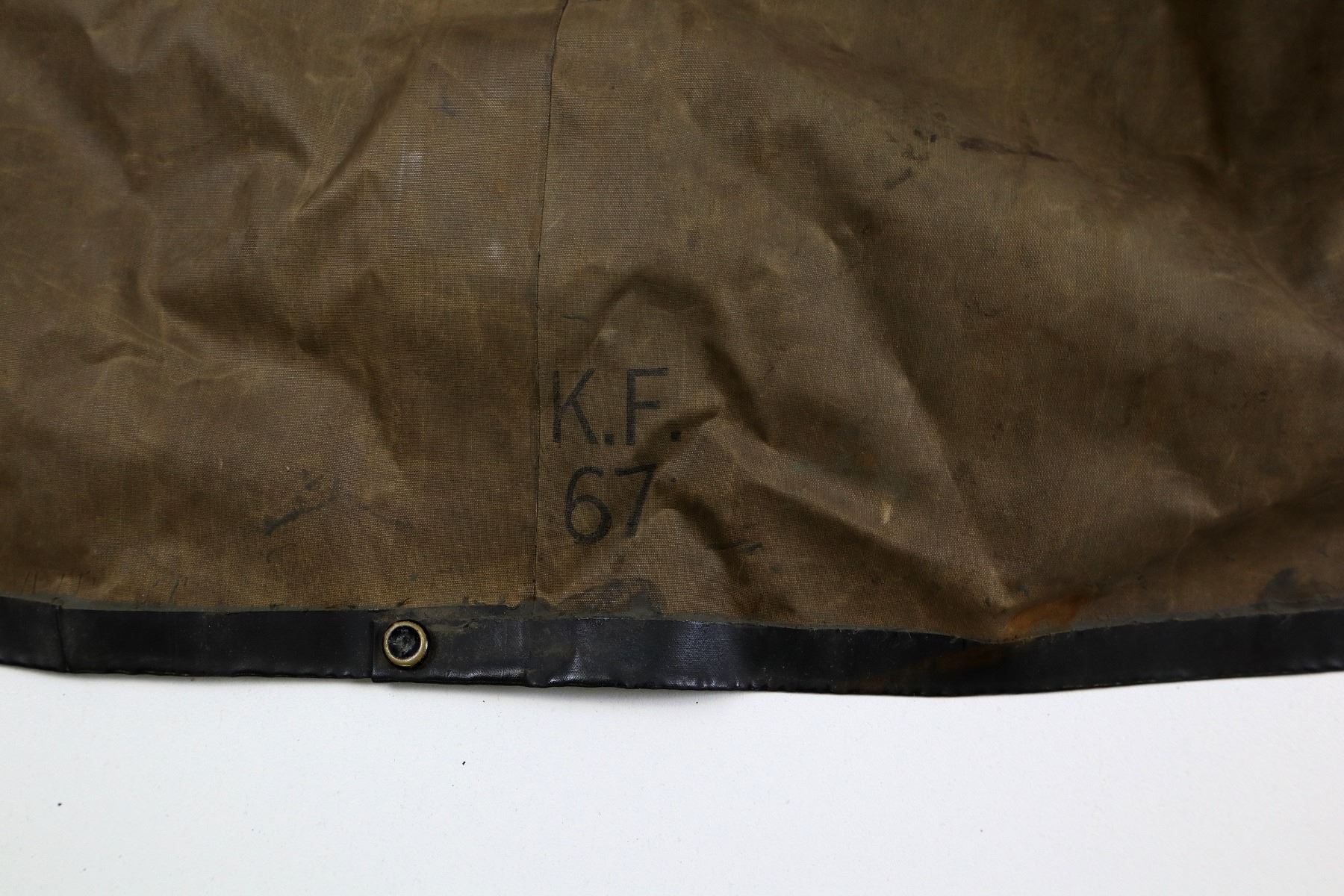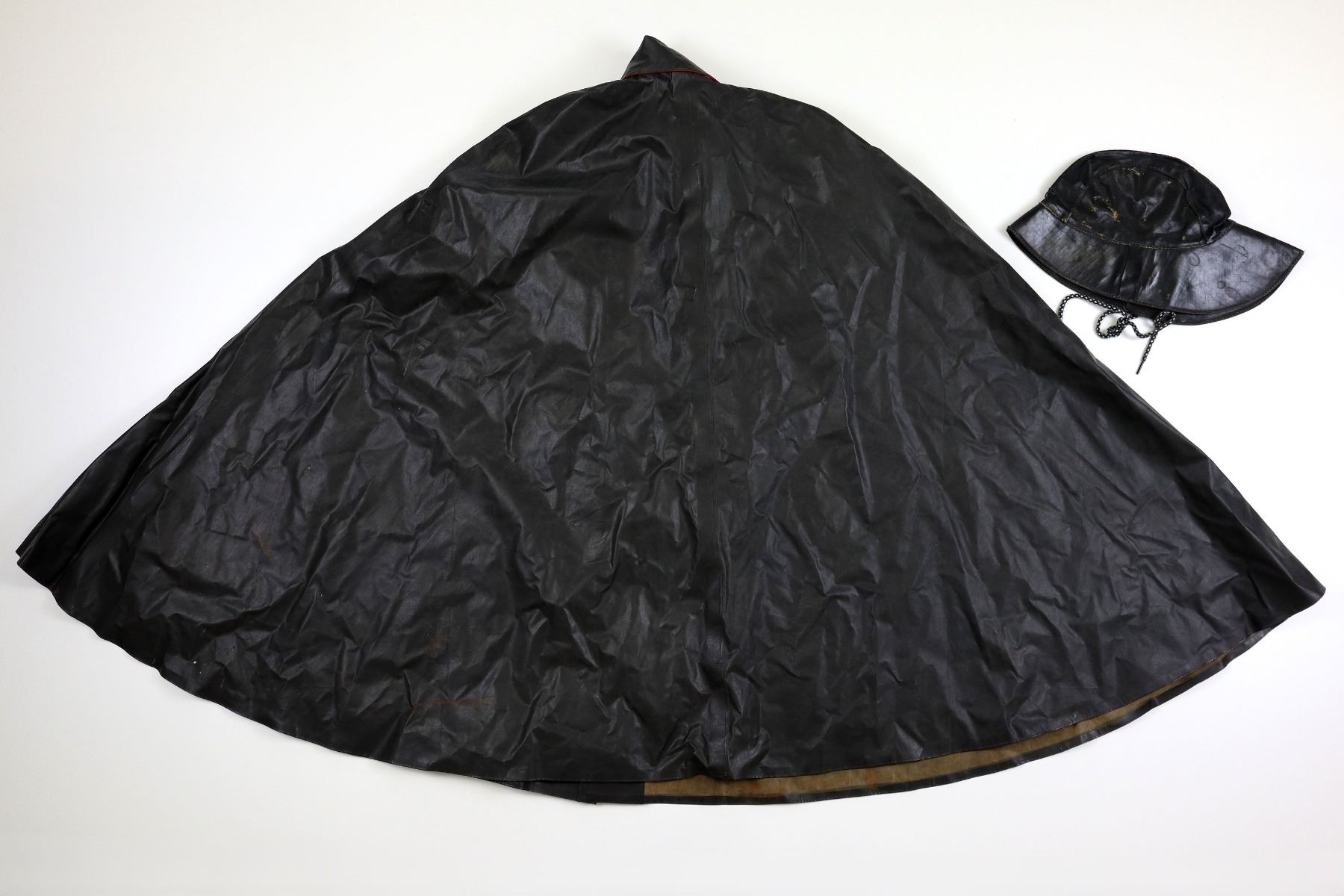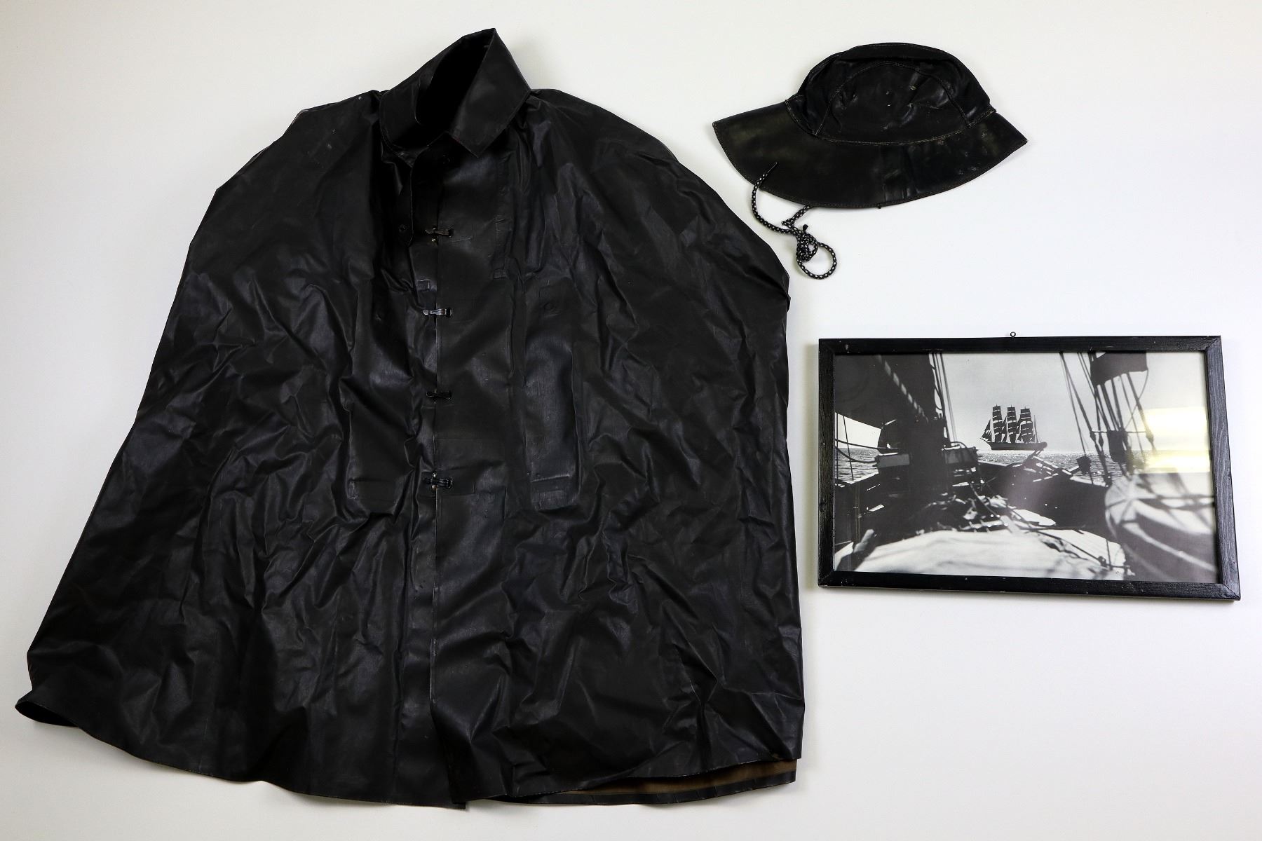 LOT INCLUDES; (1) BLACK RUBBERIZED OIL SLICKER COAT, INSIDE COAT NEAR BOTTOM MARKED: "K.F. 67", FRONT HOOK CLOSURE, CLOSED COLLAR, FRONT HOOKS MARKED WITH ANCHORS, SHOWS SOME WEAR, APPROX. 37.5" L X 69" W, (1) BLACK RUBBERIZED CAP, WOOL LINING, NO VISIBLE MARKINGS / LABEL WORN OUT, ROPE CHIN STRAP, SHOWS AGE / WEAR & (1) FRAMED BLACK / WHITE PICTURE OF A VINTAGE WINDJAMMER, BLACK PAINTED WOODEN FRAME, UNDER GLASS, APPROX. 18 3/8" X 12 1/8". SEE PHOTOS. *NO GUARANTEE ON GLASS FOR SHIPPING*