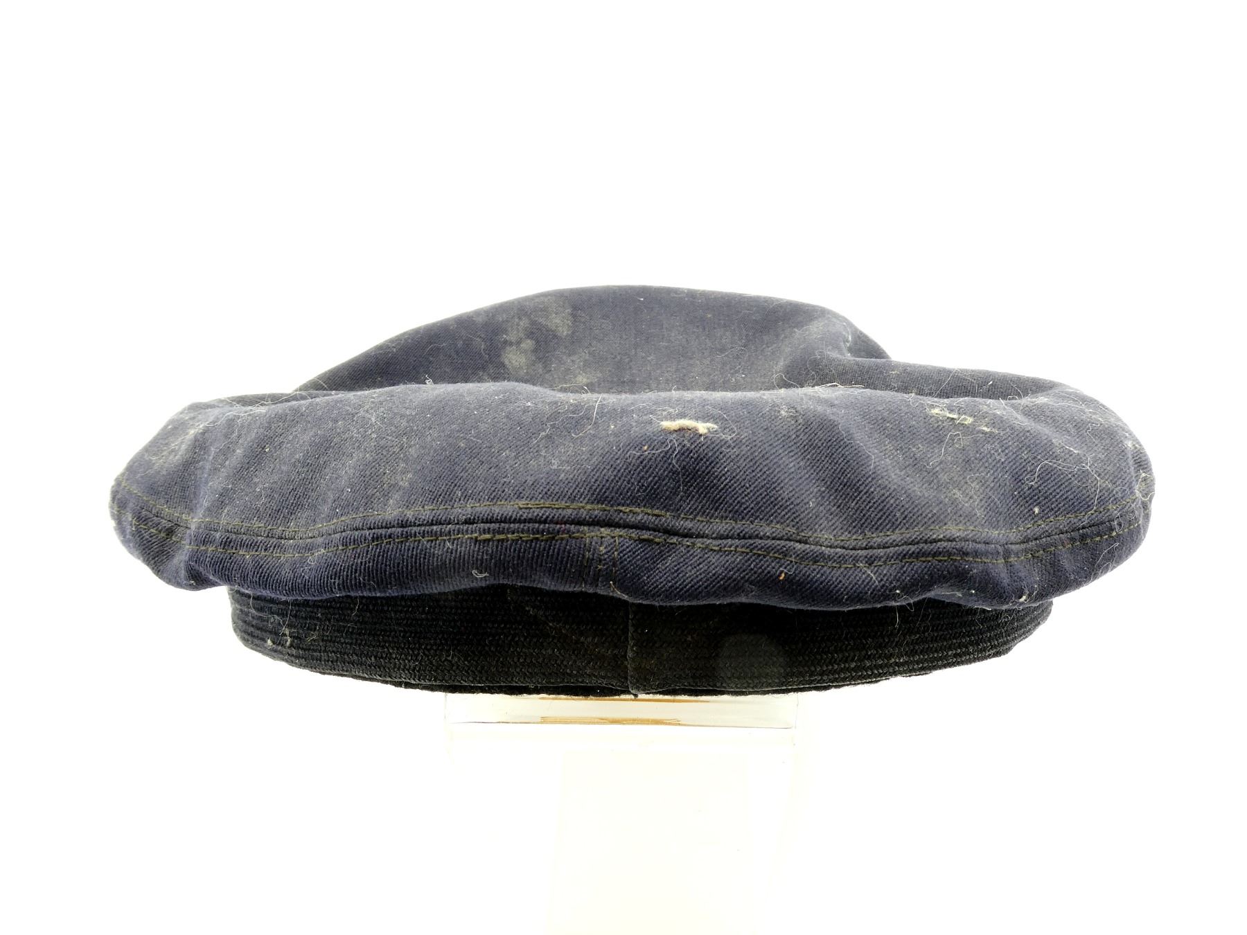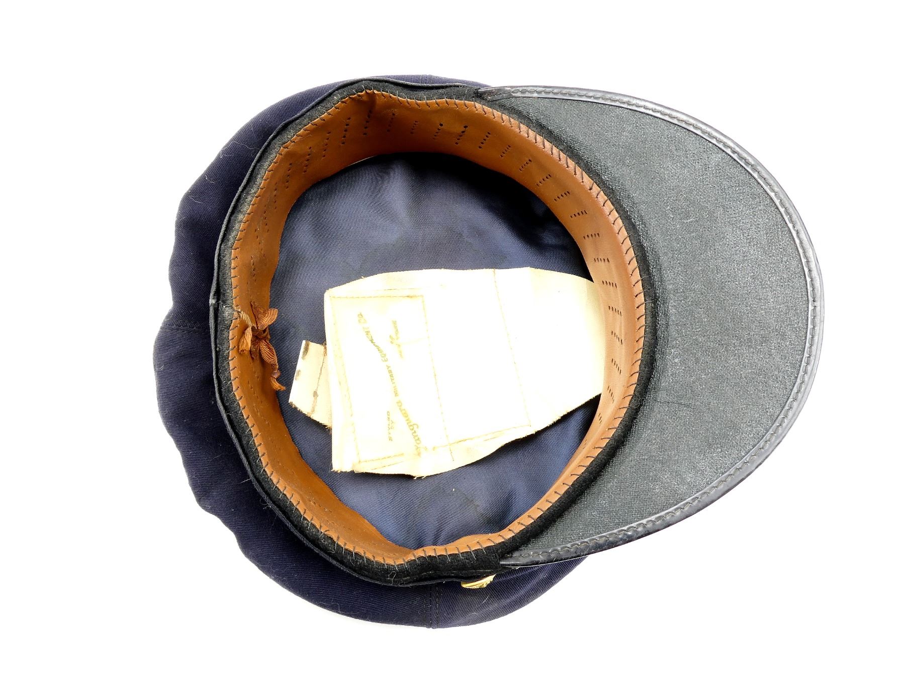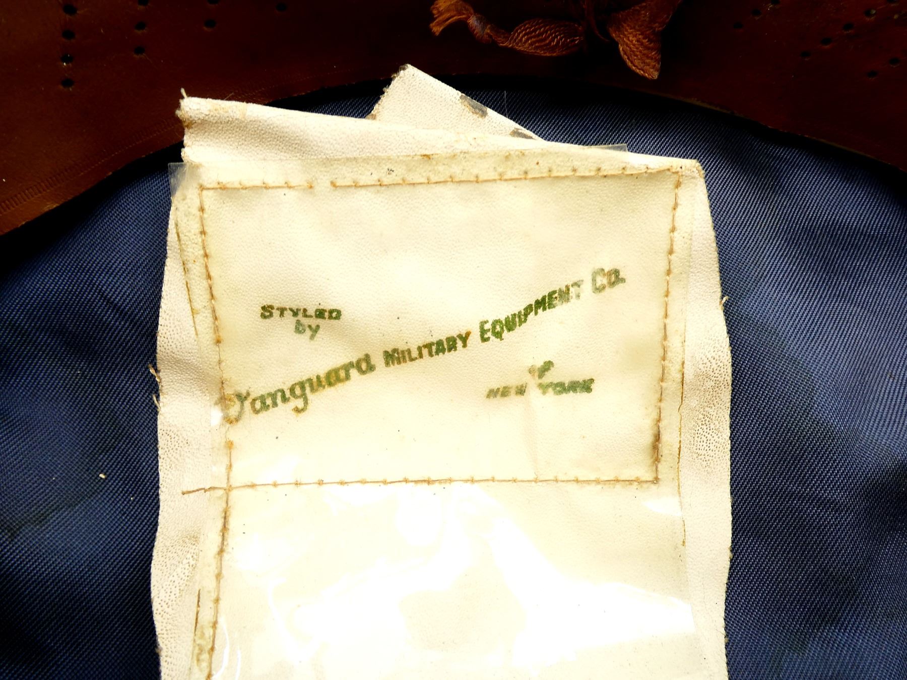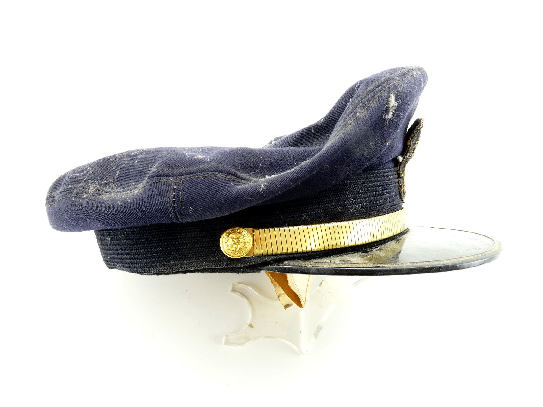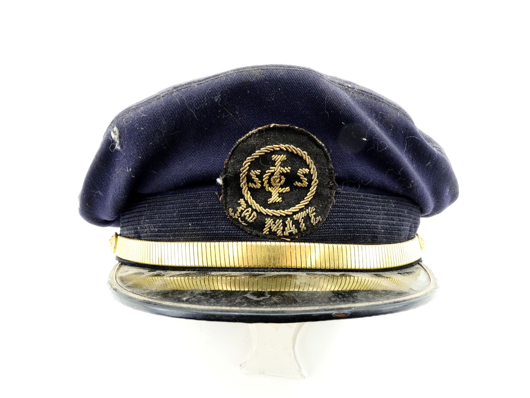 (1) NAVY BLUE PEAKED CAP, MARKED: "STYLED BY VANGUARD MILITARY EQUIPMENT CO. OF NEW YORK", BRASS WIRE EMBROIDERED CAP BADGE MARKED: "SCIS, 3RD MATE", BRASS CHIN STRAP, BRASS BUTTONS WITH EAGLE / STARS, LEATHER HEAD BAND, SIZE 7, SHOWS WEAR. SEE PHOTOS.