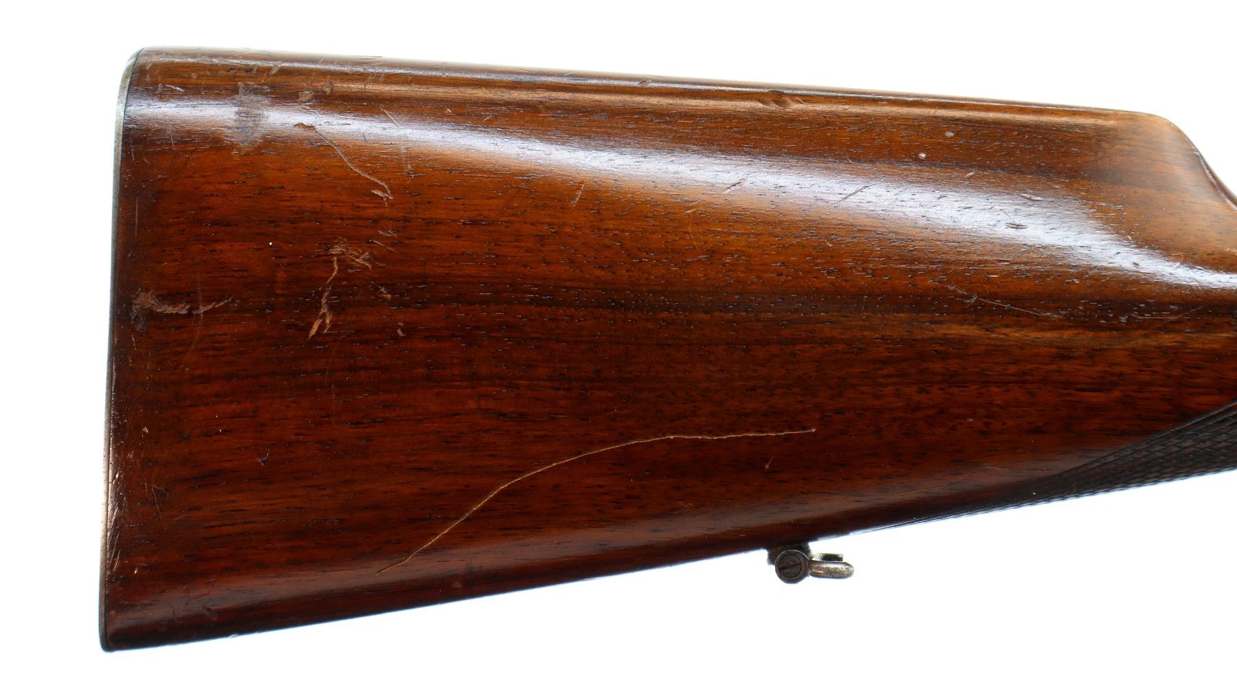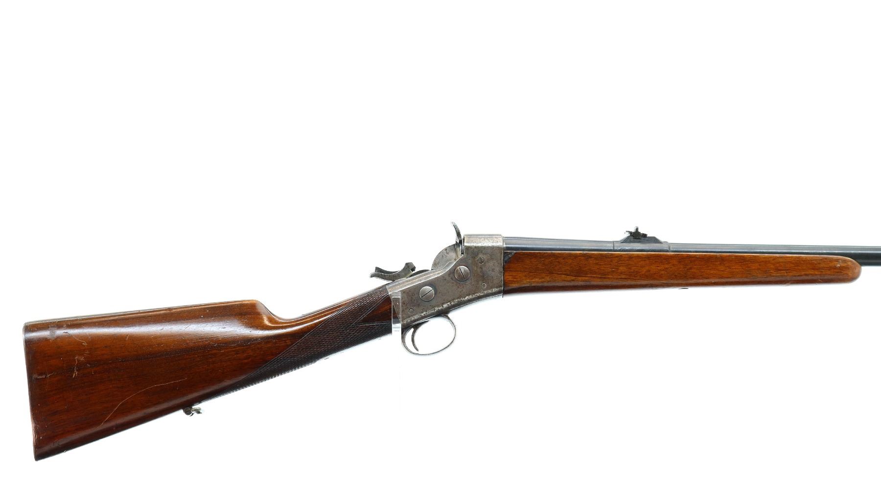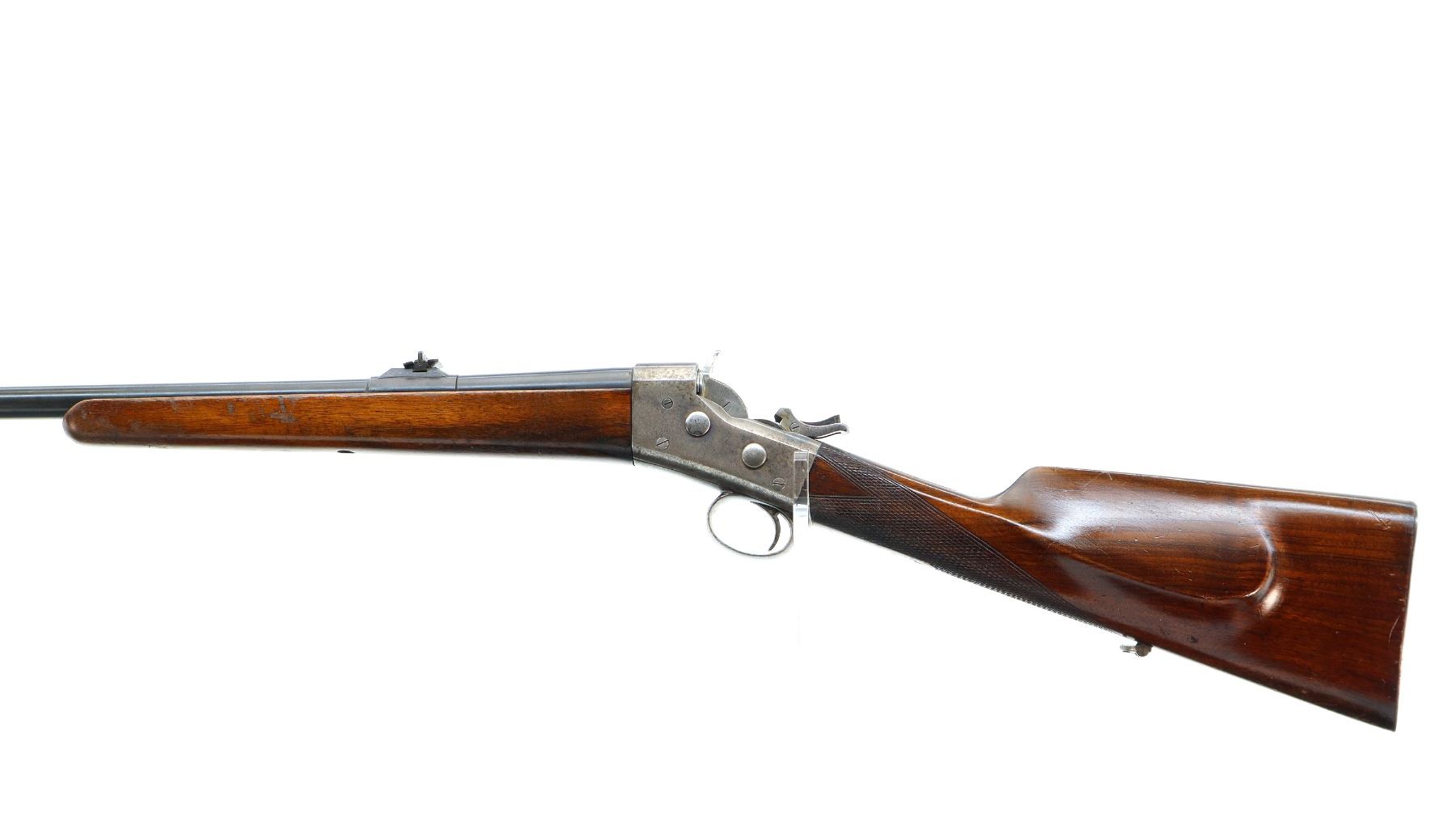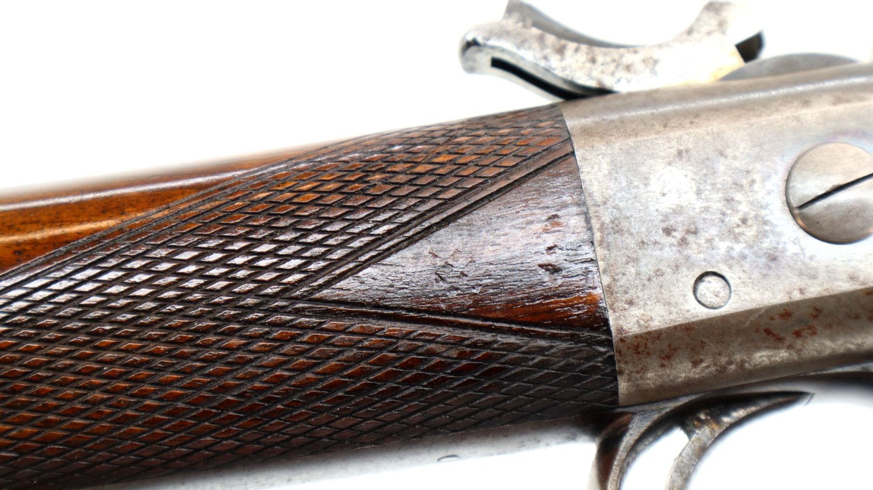 Main Description: Blade front sight, u notched rear sight with one fixed and two folding leaf's, blued tapered round barrel, colour case hardened receiver with checkered spur hammer and opening lever, extractors are present. Two piece wood stocks, checkered straight grip, cheek rest, smooth steel butt plate and rear sling swivel only.