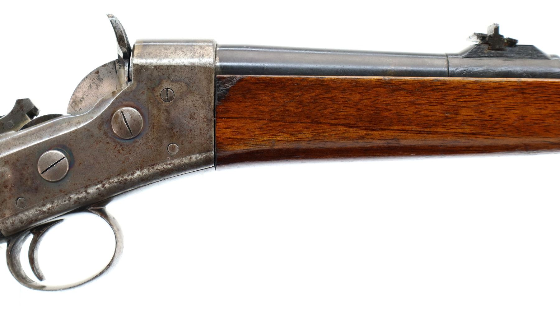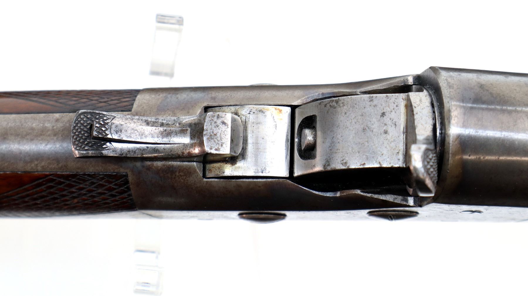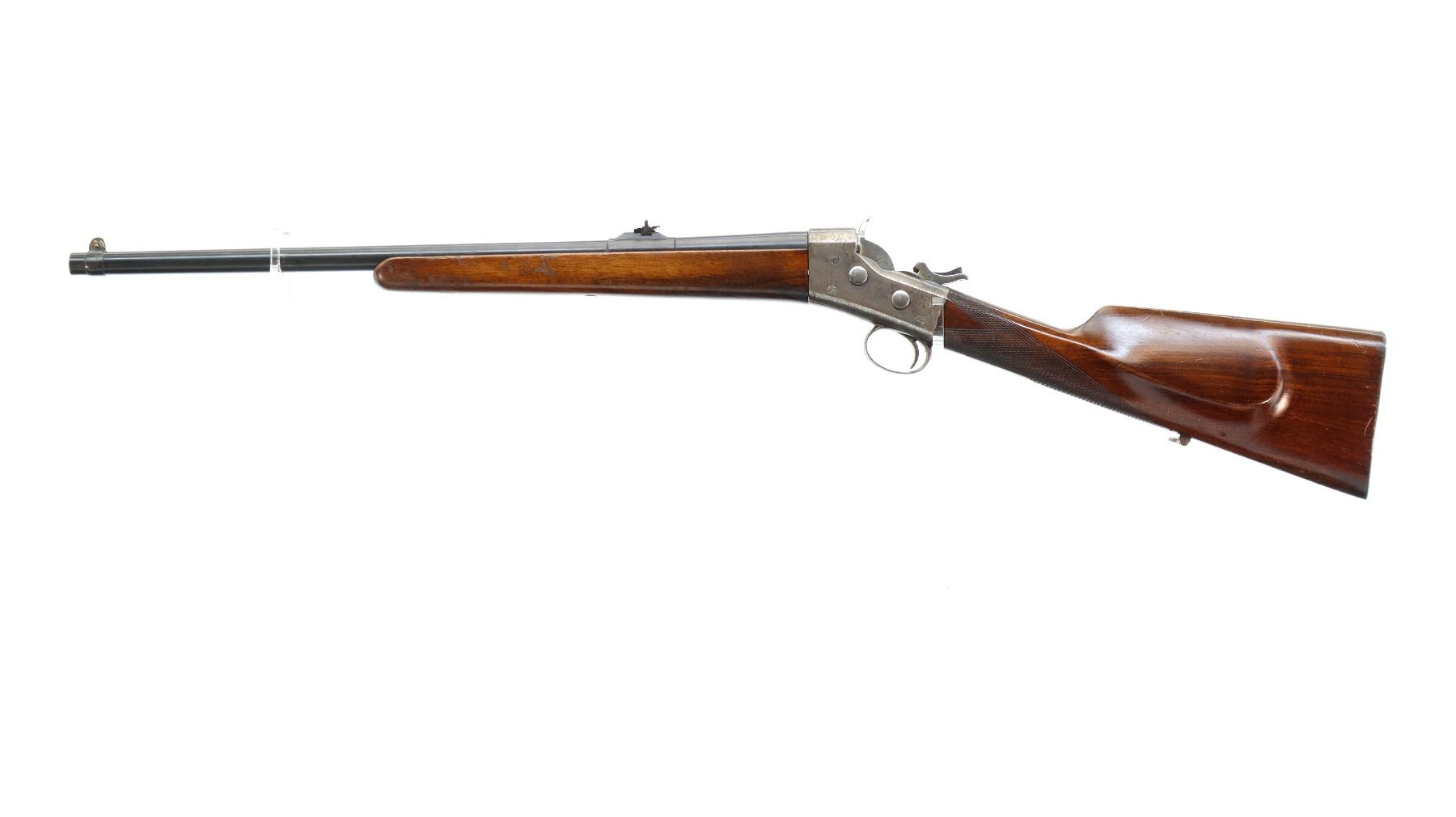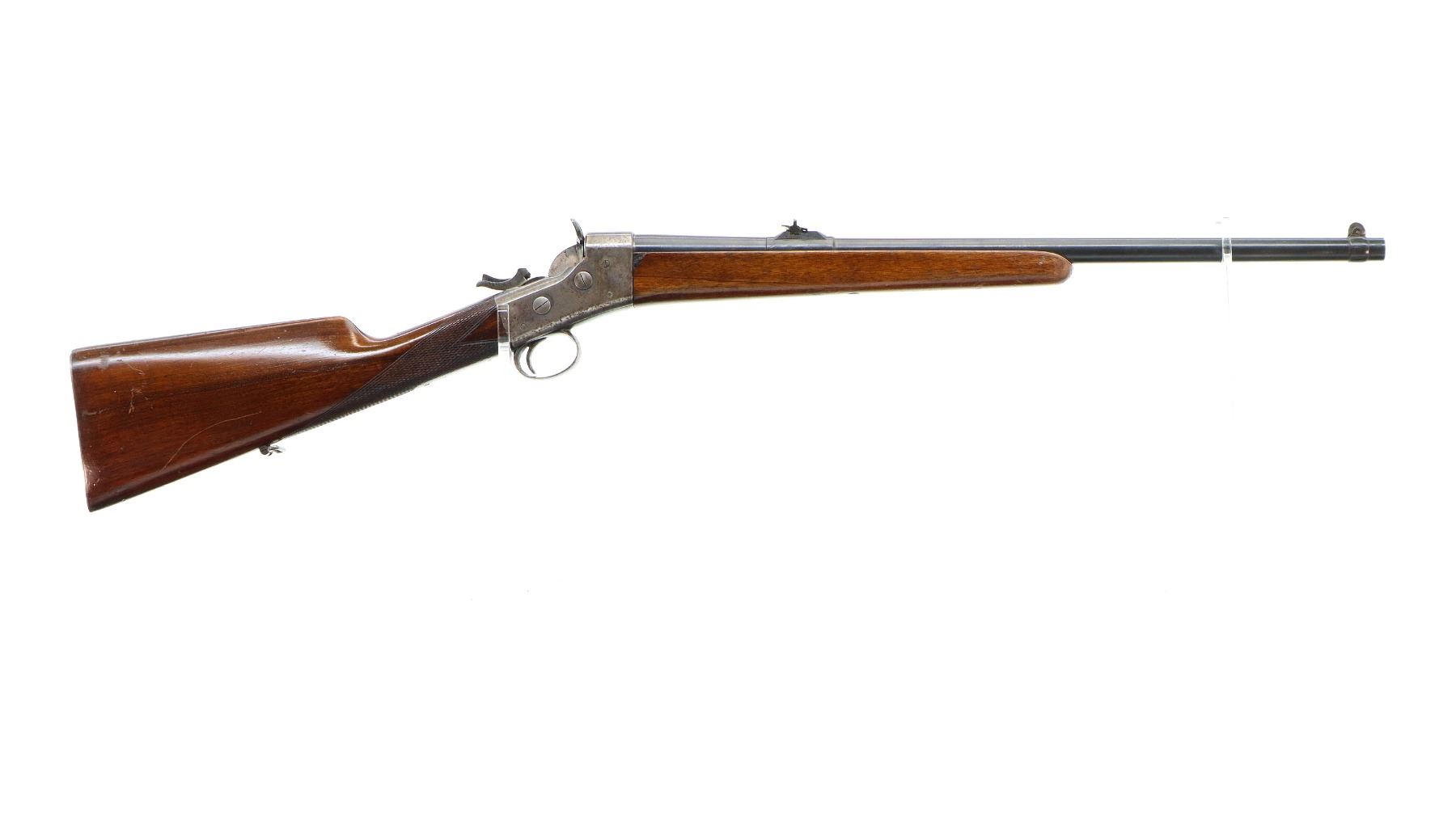 Main Description: Blade front sight, u notched rear sight with one fixed and two folding leaf's, blued tapered round barrel, colour case hardened receiver with checkered spur hammer and opening lever, extractors are present. Two piece wood stocks, checkered straight grip, cheek rest, smooth steel butt plate and rear sling swivel only.