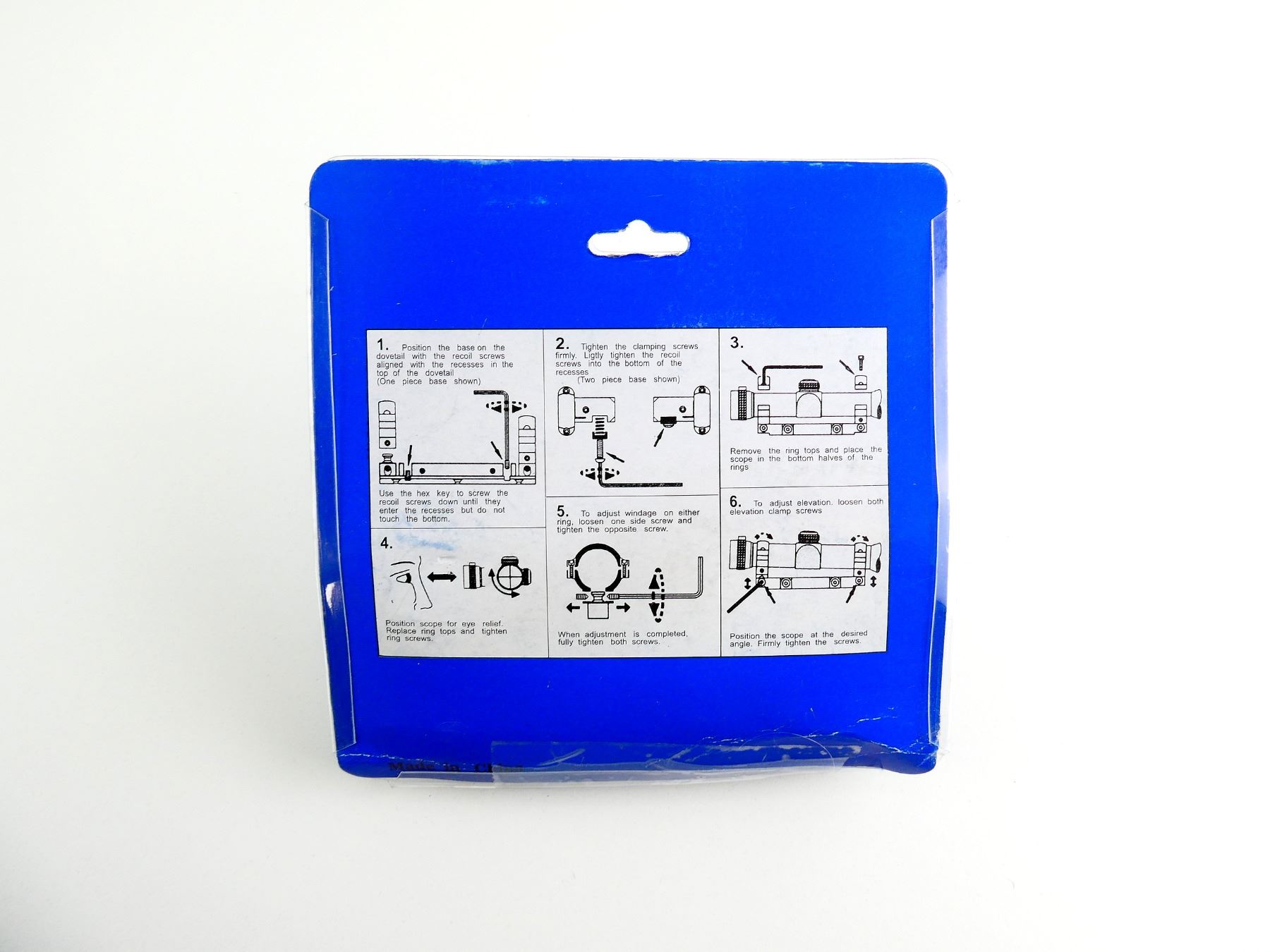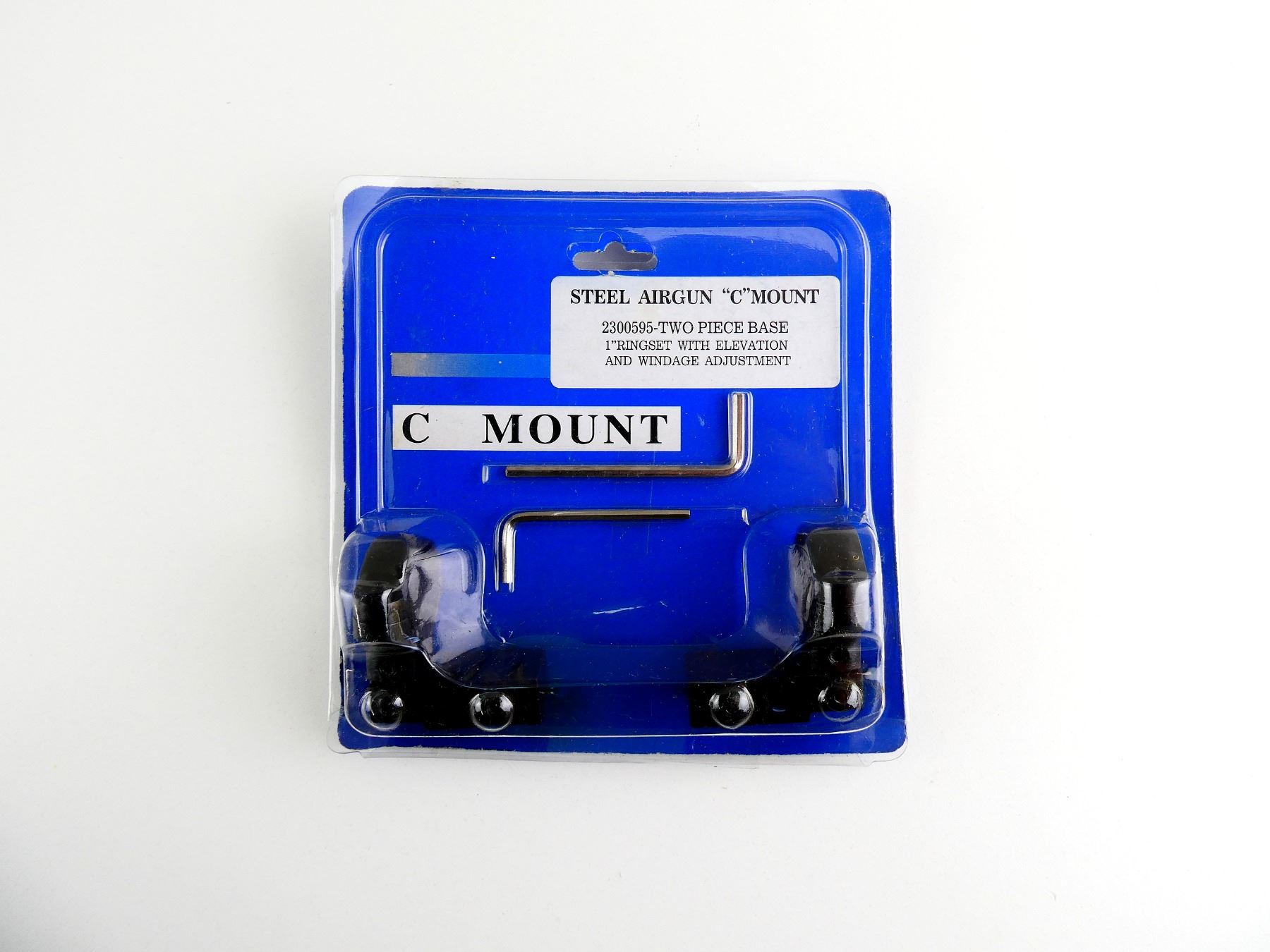 (1) 2-PIECE AIRGUN MOUNT BASE, BLACK ALUMINIUM, MARKED: "C" MOUNT, PART #: 2300595, 1" RING SET WITH ELEVATION & WINDAGE, WITH ORIGINAL PACKAGING. MAY REQUIRE FITTING. SEE PHOTOS.