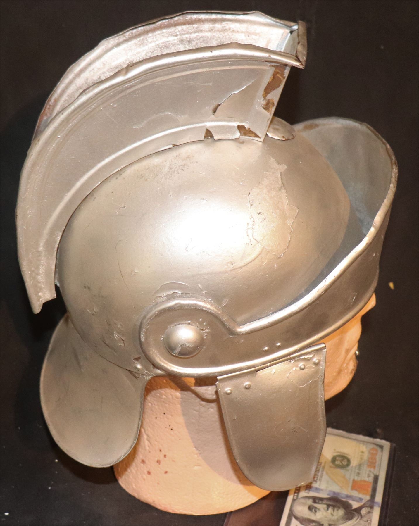 This is old, like older than BEN-HUR!! All metal and leather. There is a lining with leather flaps but this looks to have been painted for some other film. I assume this had a razor fringe at some tome but it is gone and the crest has a loose piece. HIGH BID GETS IT!