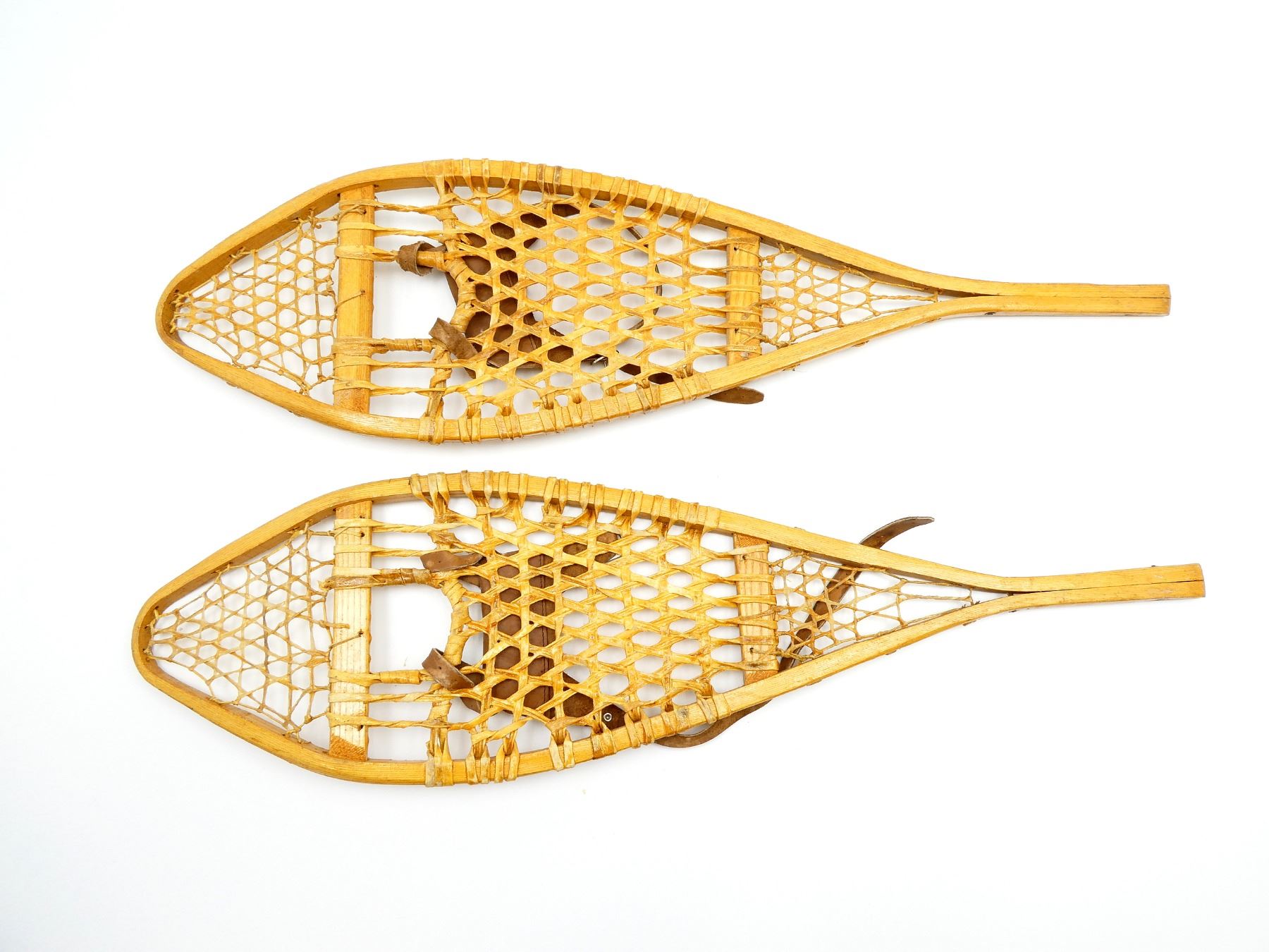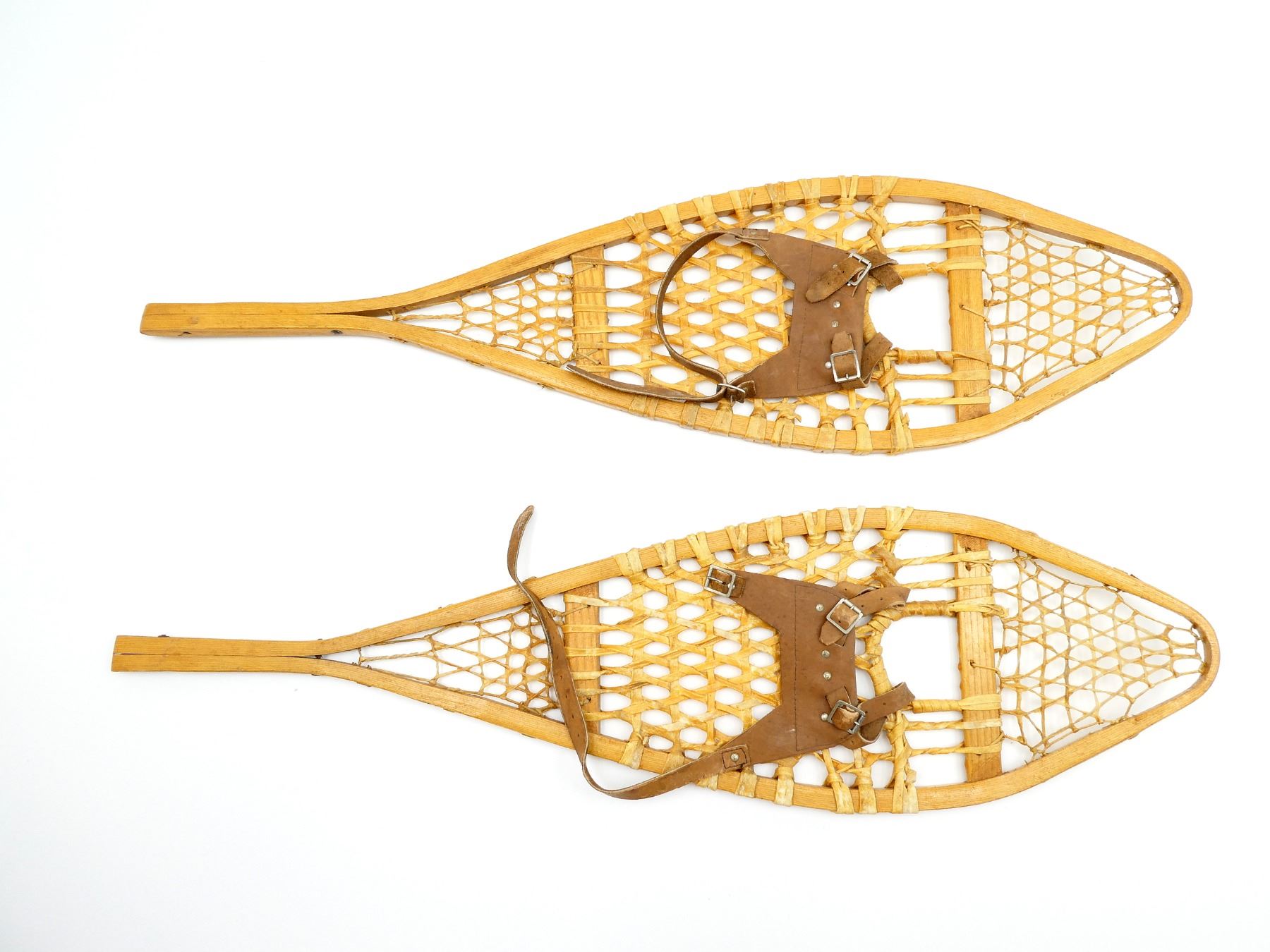 (1) SET OF WOODEN / RAWHIDE SNOWSHOES, WITH BROWN LEATHER & METAL HARNESSES, APPROX. 12" WIDE & OAL APPROX. 41". SEE PHOTOS.