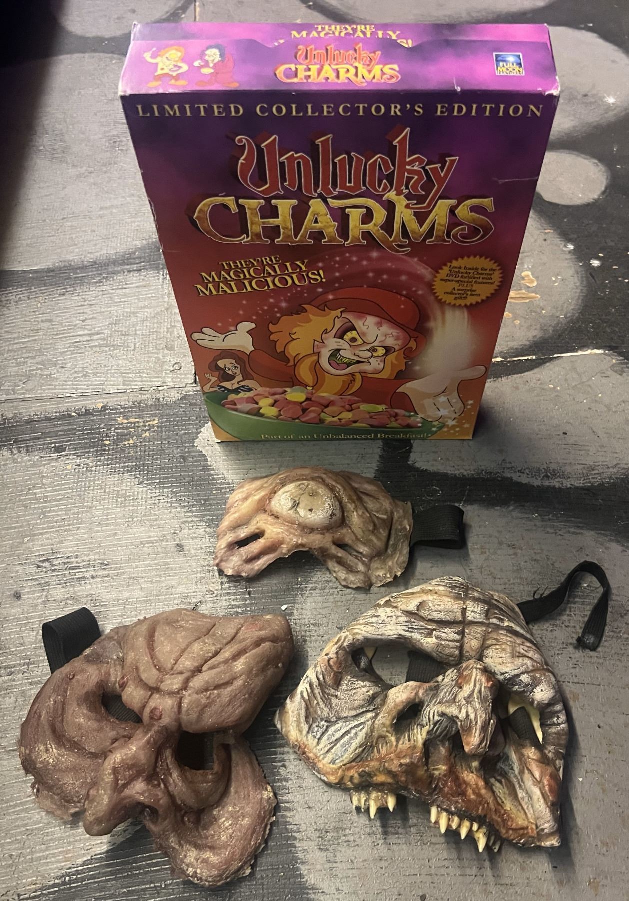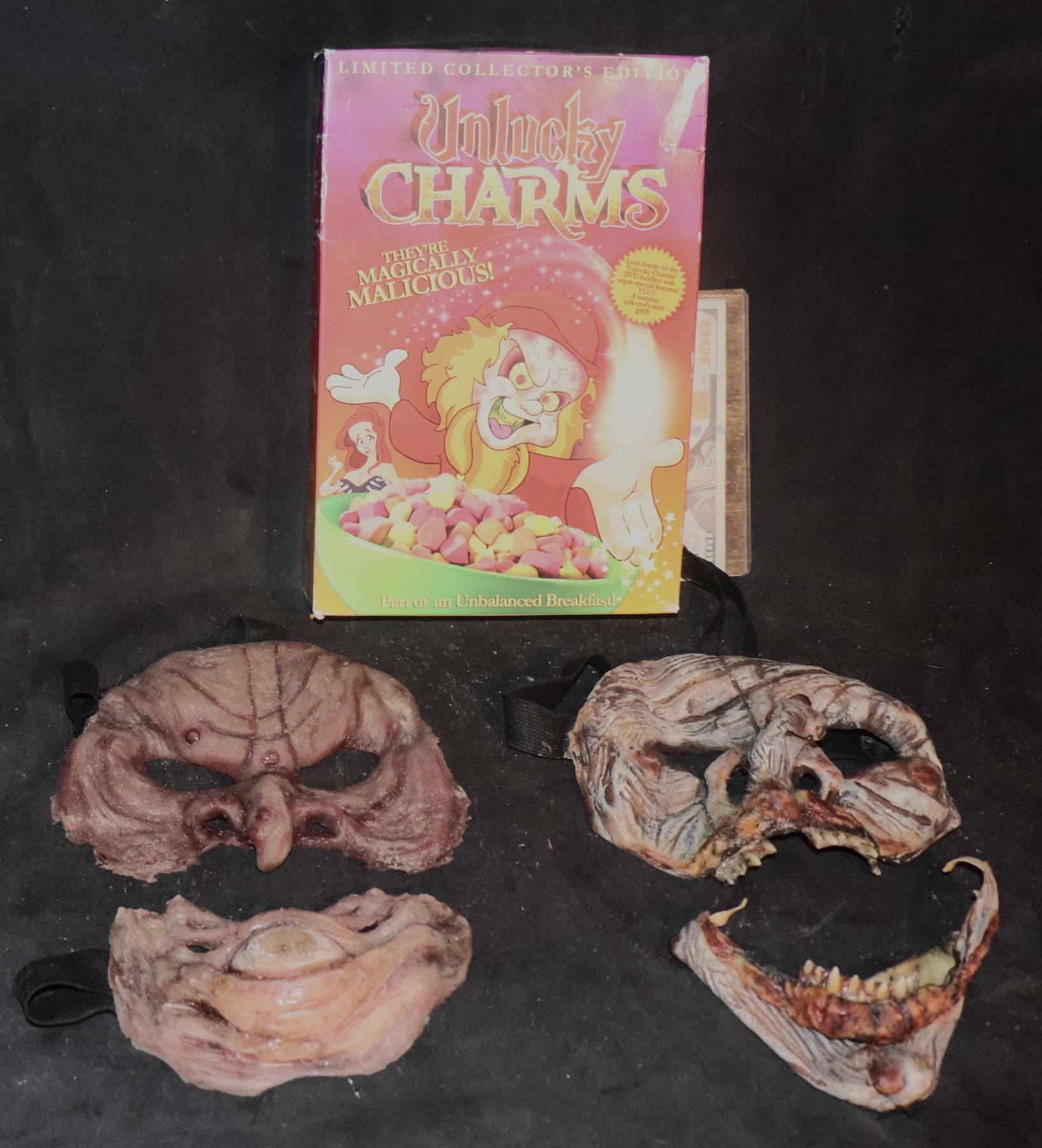 UNLUCKY CHARMS SILICONE AND LATEX LEPRECHAUN MASKS CHEST AND CEREAL BOX USED IN PROMOS!