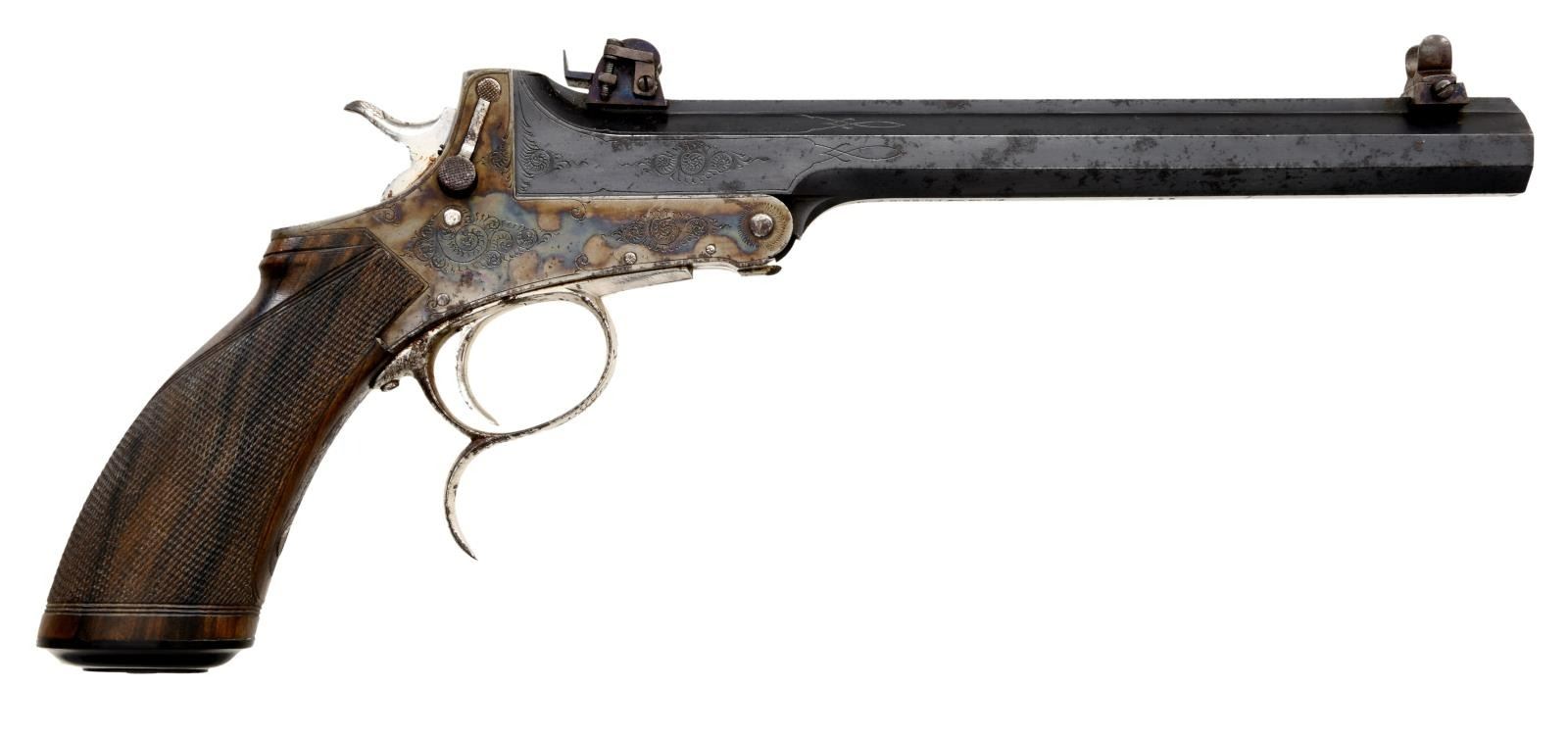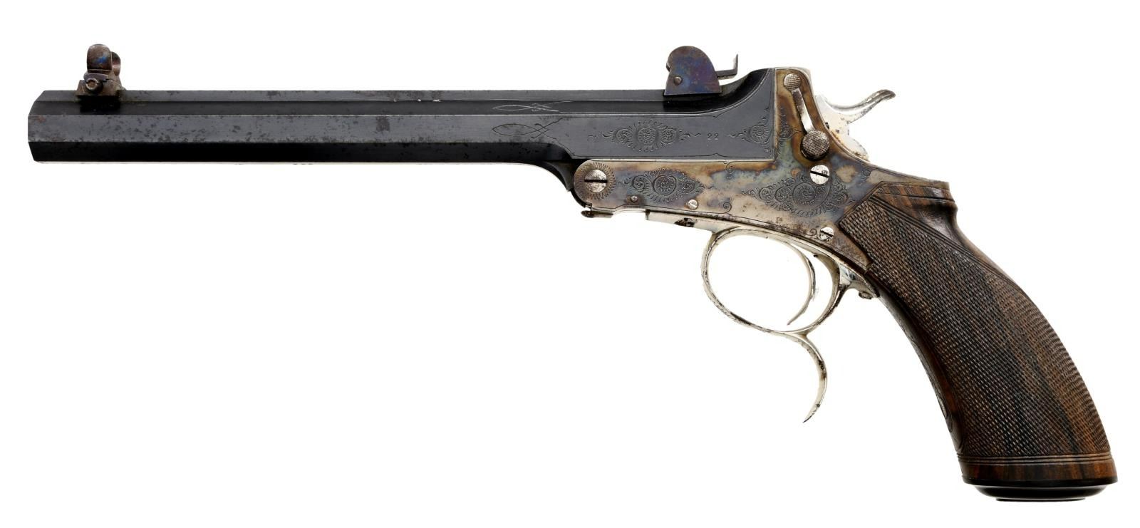 Cal. 22 Short. S# 384. Bbl 8 1/2" oct. Bead front sight w/ protective hood. Adjustable target rear sight. Underside of bbl. has circled Liege proof, a crown "R" proof, a Perron proof & "FL.22.C." marking. Blued bbl. Case colored frame. Silver plated trigger guard. Floral engraving on various metal parts. Checkered walnut grips. CONDITION: grips show some dings & handling marks. Trigger guard retains most of its silver plate w/ some flaking & oxidation. Frame retains most of its case colors w/ some scattered oxidation. Bbl. retains 85% blue w/ some scattered oxidation & light fading. Very good bore w/ some light frosting. PROVENANCE: From the Harold Prucha Collection. (23-5003/MJC). CURIO. $1,500-1,800.