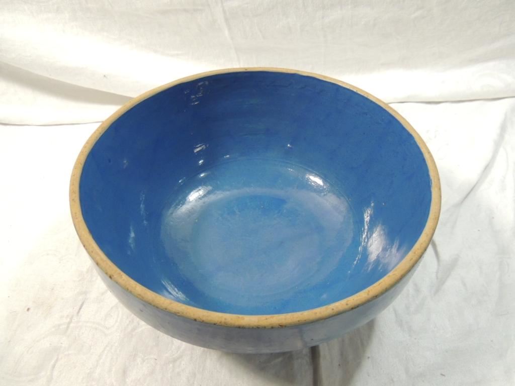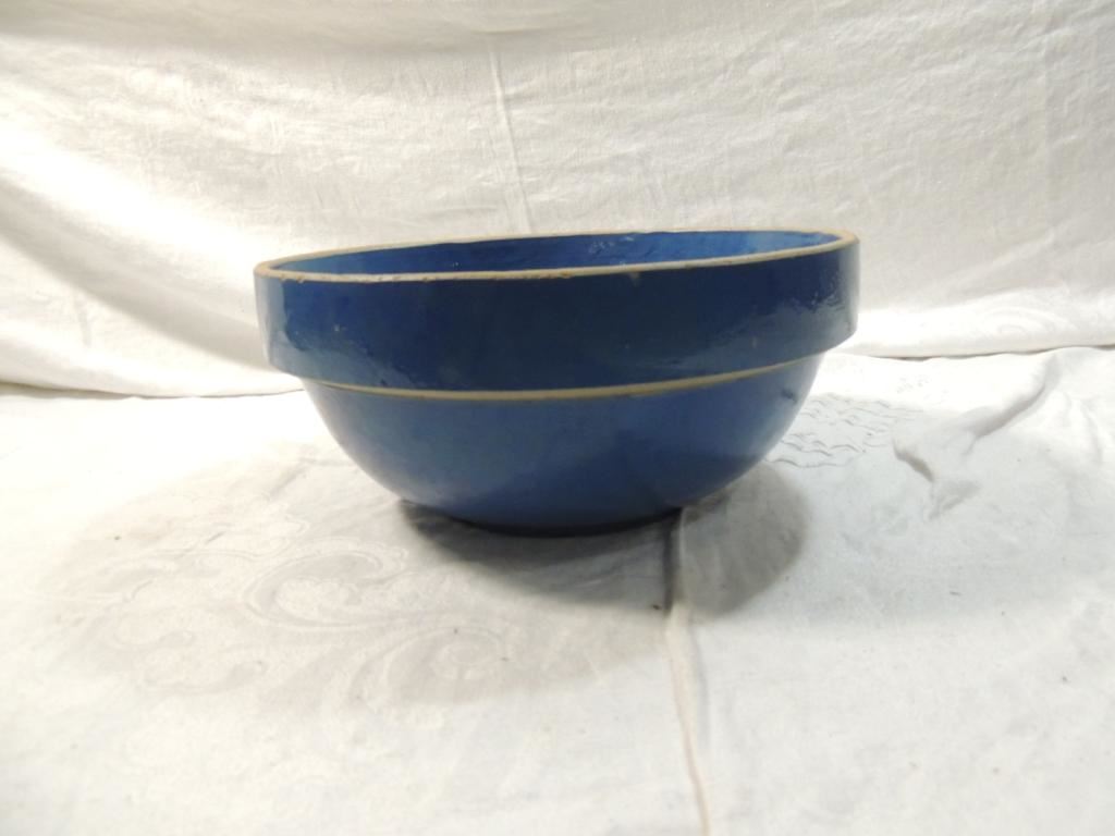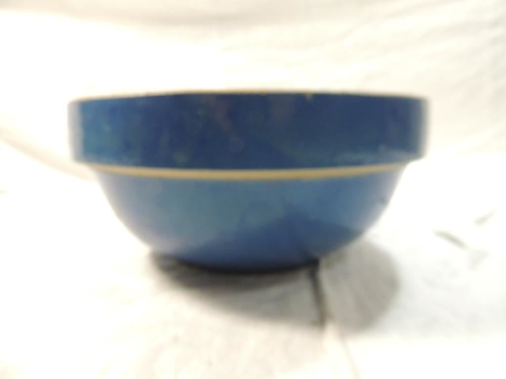 STONEWARE POTTERY BOWL UNMARKED BOWL POTTERY BOWL BLUE GLAZE MIXING BOWL AS SHOWN SEE PHOTO FOR MORE DETAILS.