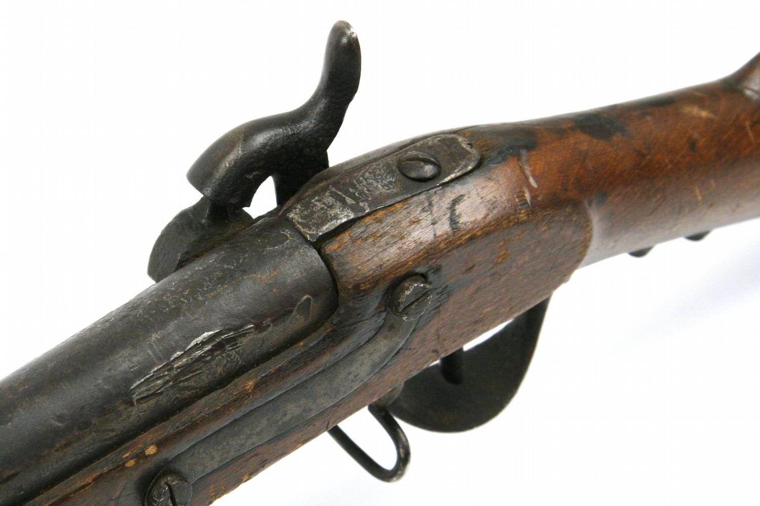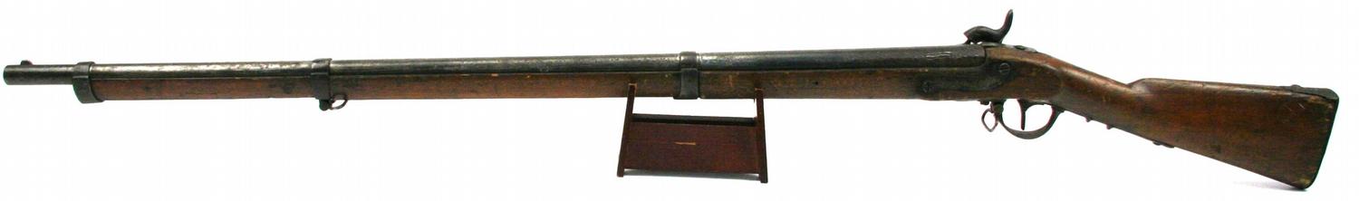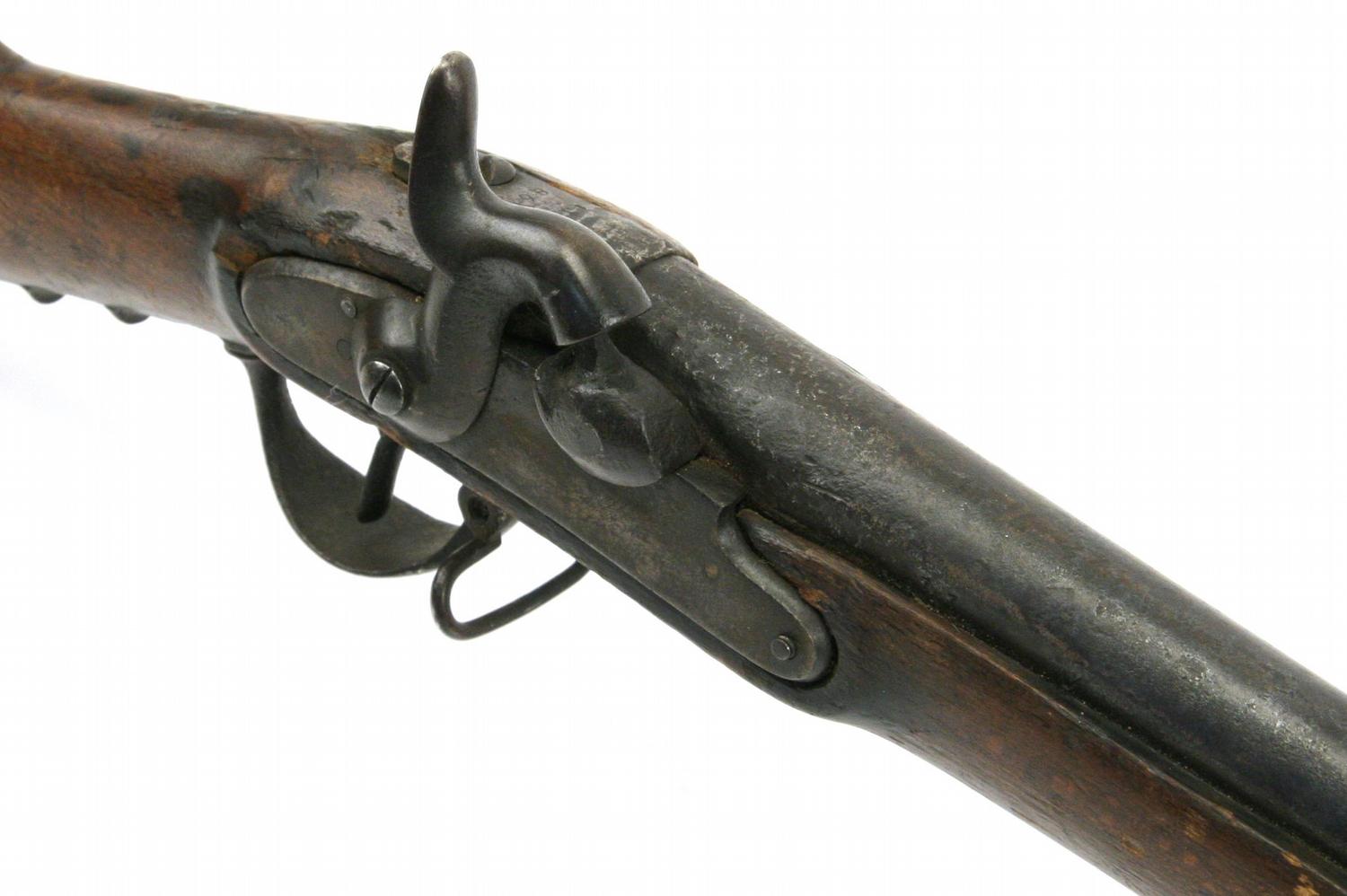 Civil War era percussion musket, about .70 caliber. Appears to be of British or French manufacture. Makers, import, or arsenal markings appear removed early on, characteristic of many muskets smuggled into the CSA from Britain, during the Civil War. Gun was reputedly from Buford SC. Gun shows many service marks, and some later handling marks, but stock is free of significant damage. Still retains metal ramrod in stock. Lock and trigger mechanisms are still functional.