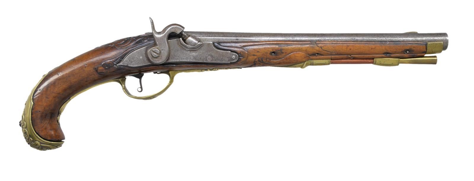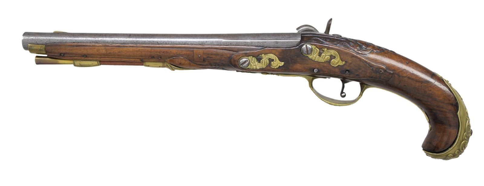 Cal. about 62. NSN. Bbl. 10 3/4" w/ smooth bore & brass blade sight. French style side lug percussion conversion. Unmarked lock. Pin fastened walnut stock. Brass fittings include grotesque mask buttcap, fancy finial trigger guard, ornate side plate escutcheons, nose cap, thimble & single faceted pipe. Stock has molded edges along bbl. channel as well as around lock & side plate areas w/ relief carved wolf's head behind lock & left ear. Additional relief carving including grotesque mask behind top tang w/ floral pattern around finial. CONDITION: metal has cleaned gray appearance w/ general light pitting. Refinished stock shows wear & handling marks w/ chips & cracks in lock, side plate & forend areas. Butt cap has replaced screw w/ loose screw at foot. Dark pitted bore. (01-18446/DS). ANTIQUE. $300-500.