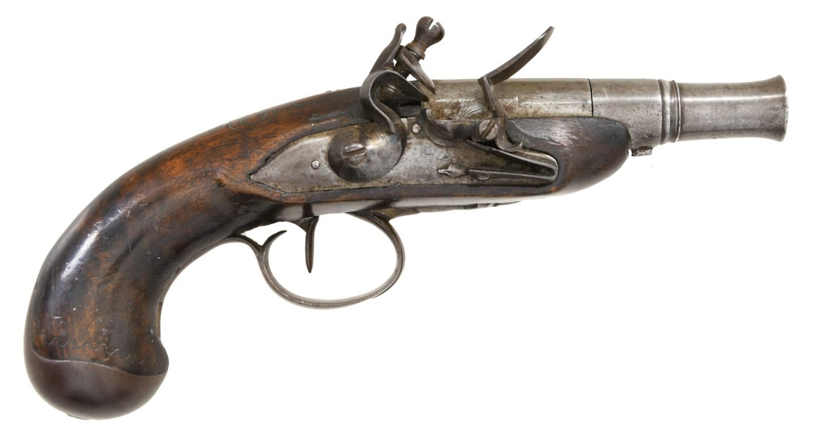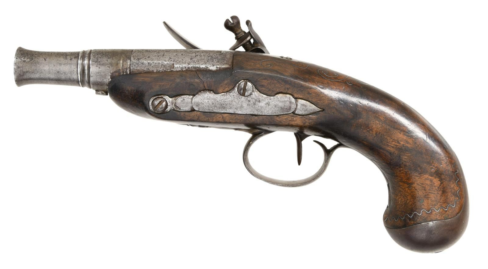 PISTOL. Cal. 36. S# NSN. The 3 3/4" barrel has long octagon to 16 sided breech section which takes a relatively large powder charge. Removable 2" section is round, deeply swamped and has pronounced flare at muzzle. Very small lock with arched and rounded plate is fitted with serpentine cock, inset rounded pan, bridled friction frizzen and feather spring with bulbous finial. Walnut stock with birds head grip is iron mounted and has silver wire inlay around barrel tang and edges of grip cap. Trigger guard has fleur-de-lis finial. CONDITION: good. All metal parts show cleaning to brown with silver highlights with more cleaning evident on left side of barrel leaving many deep pits. Wood shows considerable wear and loss of silver inlay on right side of grip. Bore is pitted. Lock is good. (01-23473/MGM). ANTIQUE. $1,500-2,500.
