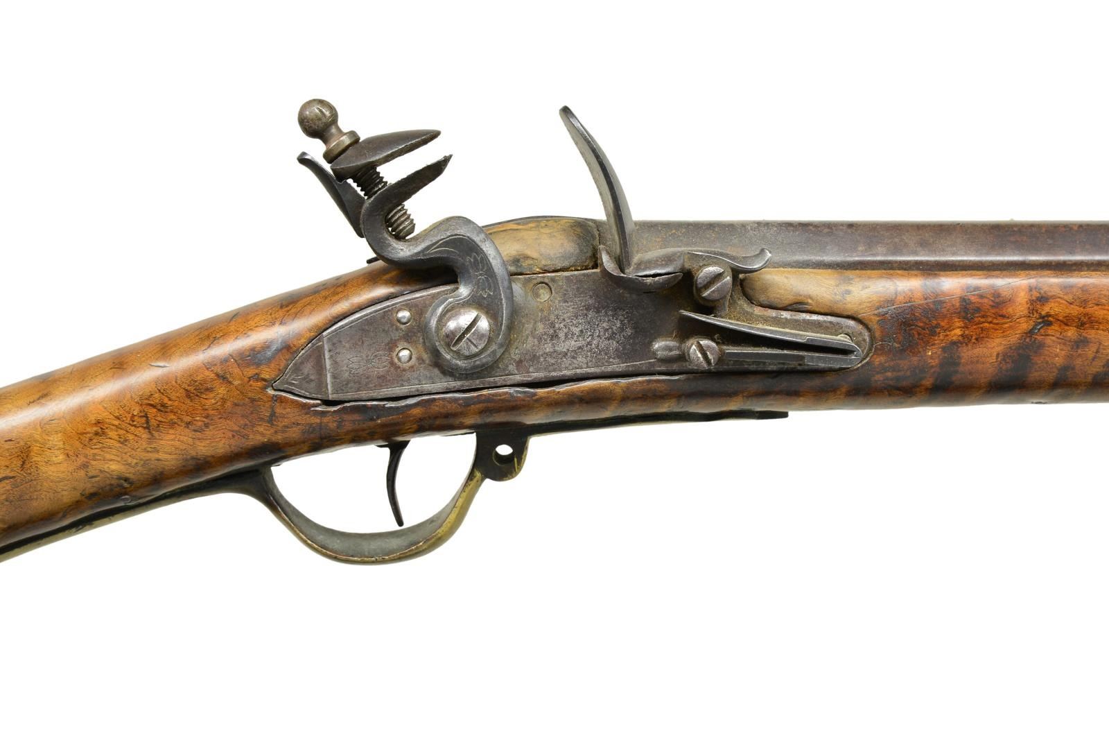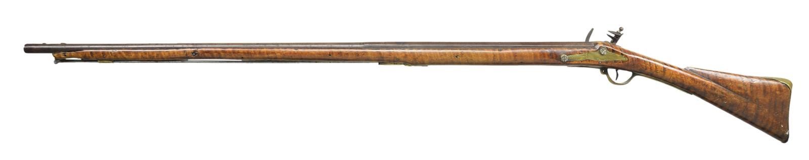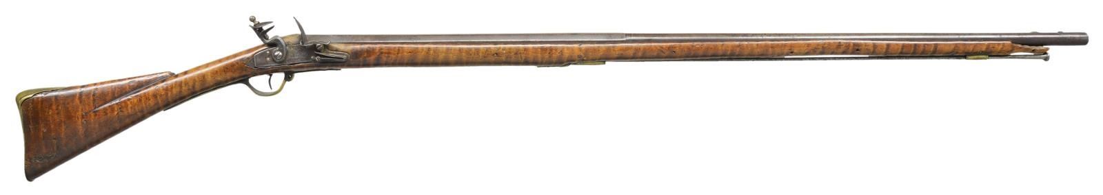 Cal. 69. NSN. Oct. to rnd. 41 1/2" w/ stud, brass blade front sight; filled in dovetail for rear sight. Lock marked "LONDON / WARRANTED". Pinned full length stock appearing maple. Brass furniture includes ramrod pipe, thimble, trigger guard, sideplate w/ light scroll engraving & buttplate. Tulip tip iron ramrod. CONDITION: fair worn bbl. finish w/ heavy pitting around touch hole. Fair lock w/ hole in pan. Fair worn wood finish w/ large cracks, large gouges, chips to edges, & dents. Brass shows cleaned appearance starting to acquire patina w/ pipe chipped. Missing nose cap & 1 buttplate screw. Screws show distortion. Dark pitted bore. Lock appears to function when cycled by hand. PROVENANCE STATEMENT: Estate collection of Thomas F. Wolfinger. (01-22199/MD). ANTIQUE. $300-500.