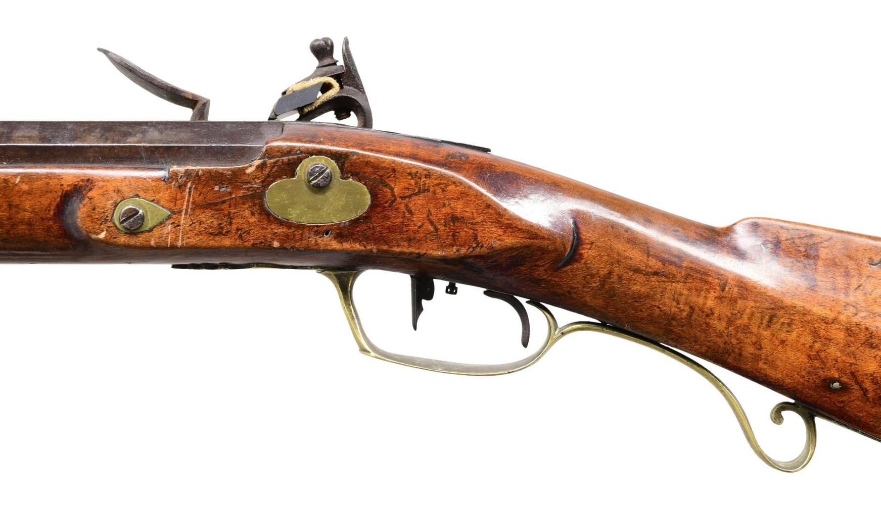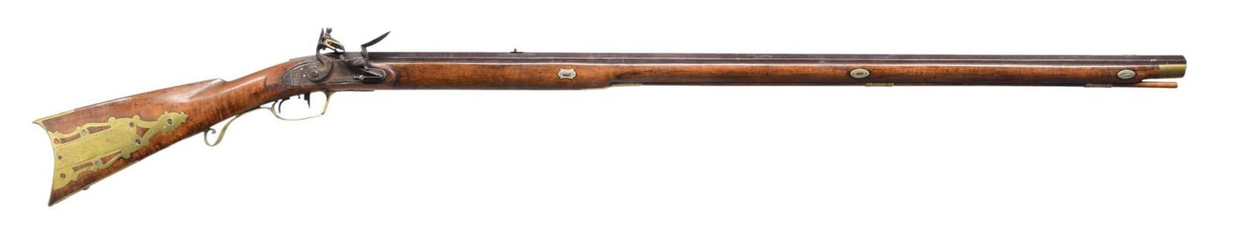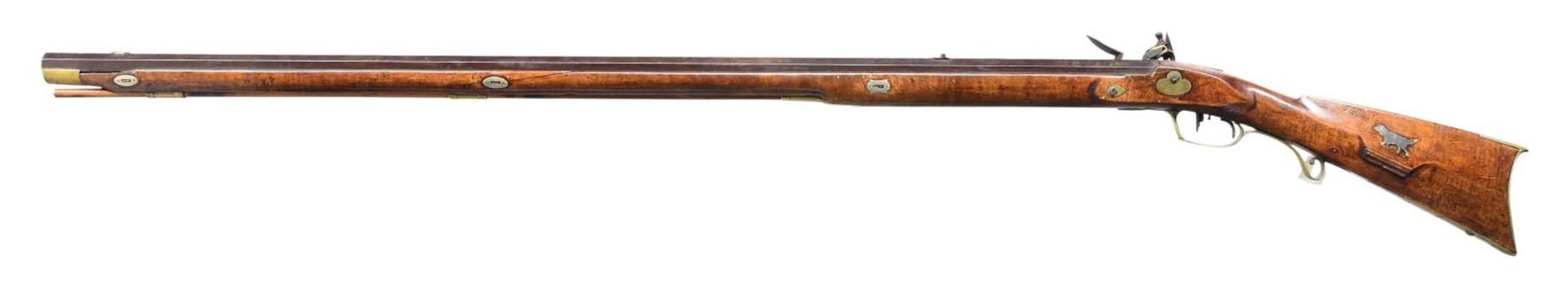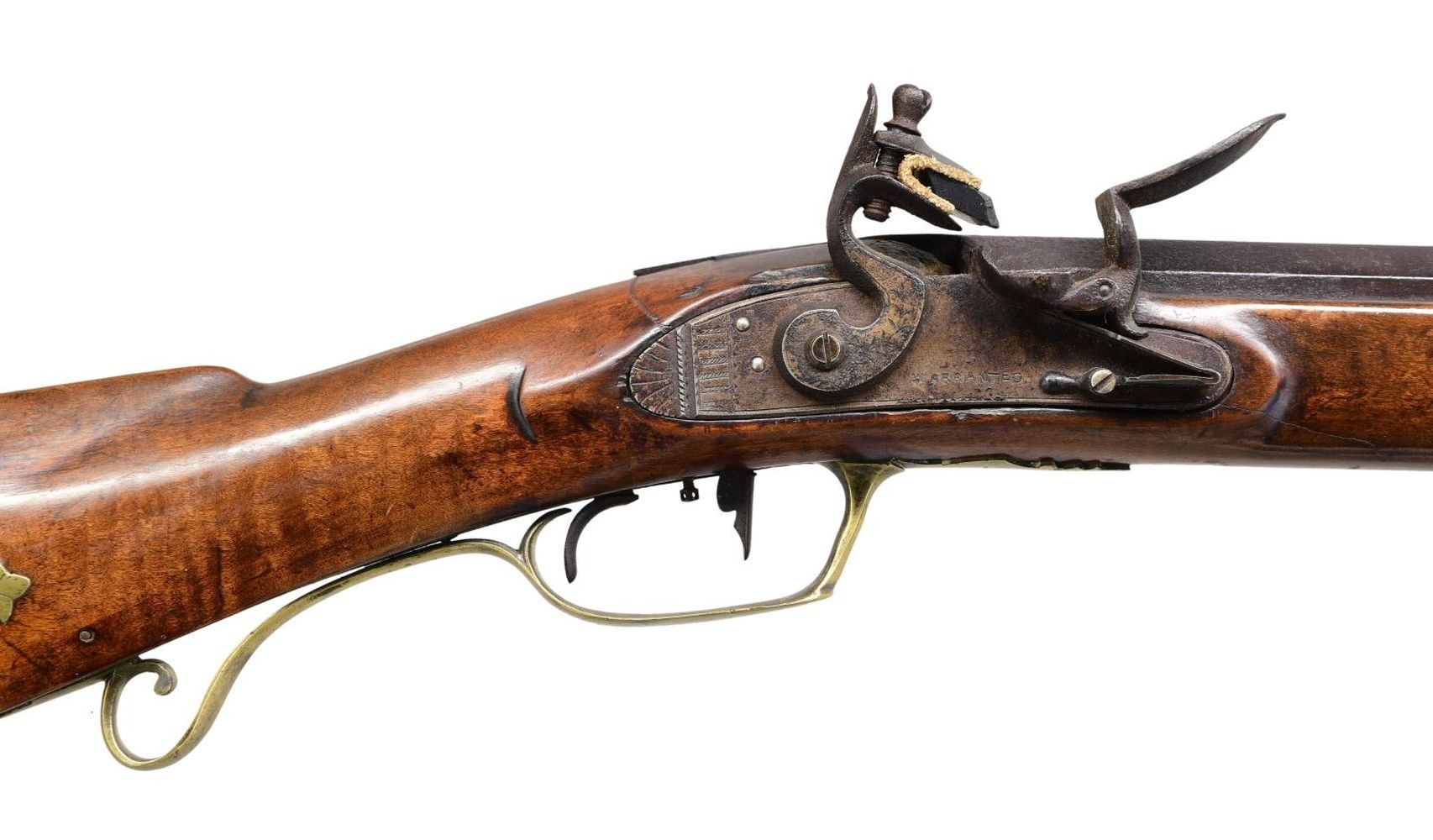Cal. 57. NSN. Bbl. 40 1/4". Unknown flintlock Kentucky rifle, with hand stamped lockplate simply marked "WARRANTED". Octagonal bbl. with German silver blade front sight and iron V-notch rear sight. Double set triggers. Full length smooth wood buttstock with small cheek rest on left side of butt has been sanded and revarnished. Brass buttplate, lightly foliate engraved patchbox, dog inlay, trigger guard, sideplates, ramrod ferrules, and nose cap, with German silver bbl. wedge escutcheons. Sides of butt exhibit faint inscribed characters, which are mostly illegible, but appear to be initials and names. CONDITION: iron components exhibit a mottled gray and brown patina, with corrosion present on the right side of the bbl. around the pan and frizzen. Brass components exhibit a mellow patina overall. Patchbox does not lock closed. Set trigger is non-functional. Stock exhibits some scattered marks and impressions overall from handling and storage, with a loss to the wood on the rear right side of the bbl., 2 cracks on the left stemming from the sideplates, 1 crack on the left stemming from the center bbl. wedge escutcheon, as well as a sizeable chip on the left side that stems from the nosecap. (01-25219/MLW). ANTIQUE. $1,000-1,500.