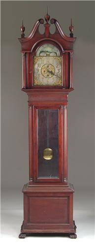 UNMARKED MAHOGANY TALL CASE CLOCK. Fine Colonial style case with beveled glass door and side windows. The waist decorated with reeded quarter columns and paneled base resting on claw feet. The hood with swan neck pediment has side reeded columns and decorative wood finials. The face in silver and brass is unmarked and has calendar dial and minute dial. Also a moon dial with landscape and seascape scenes. Coiled gong, brass works having two brass weights, pendulum, winding key and case key. SIZE: 98-1/2in. h to top of finial x 25in. at widest x 15-1/2in. at deepest. CONDITION: Hood door has corner crack in glass, otherwise very good. 9-26129