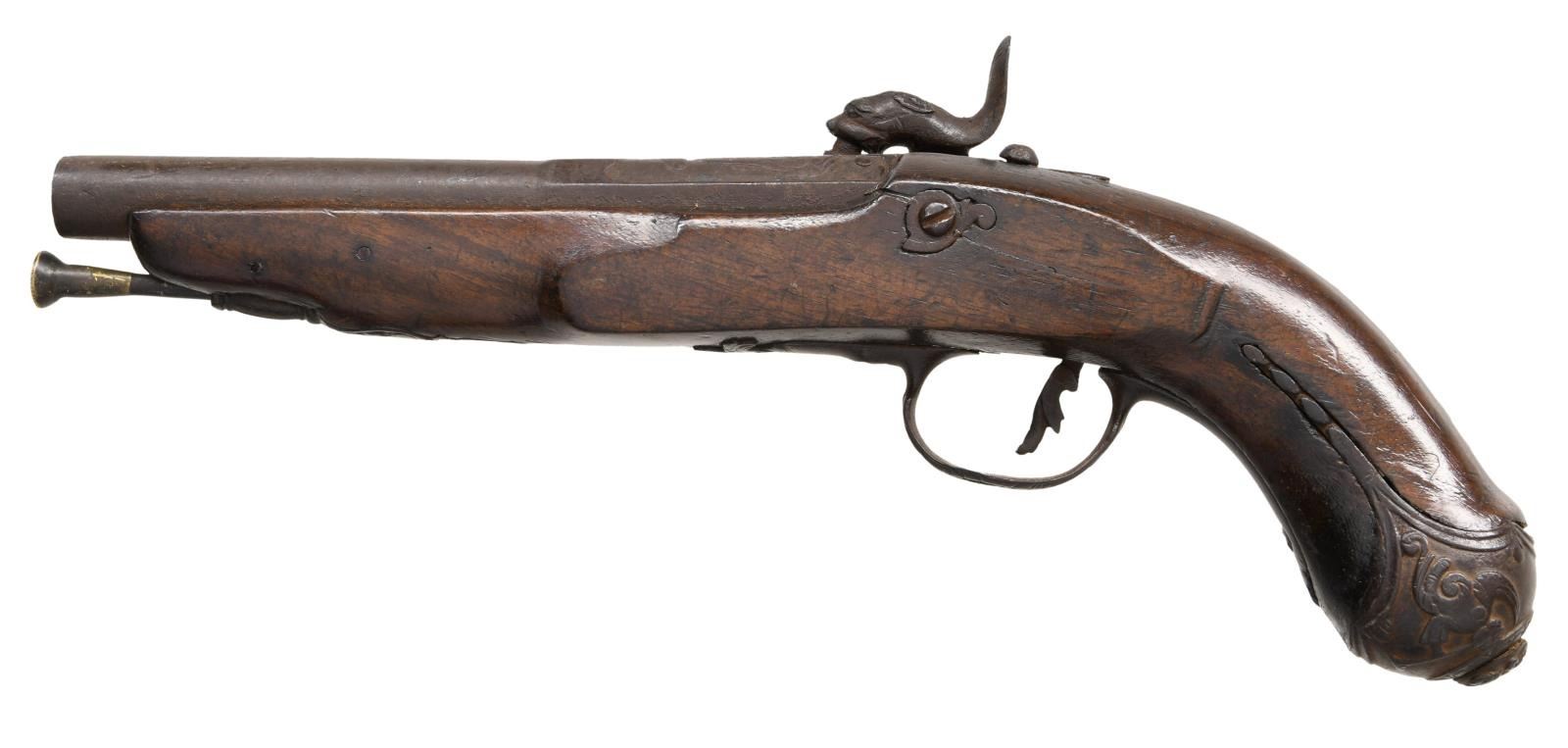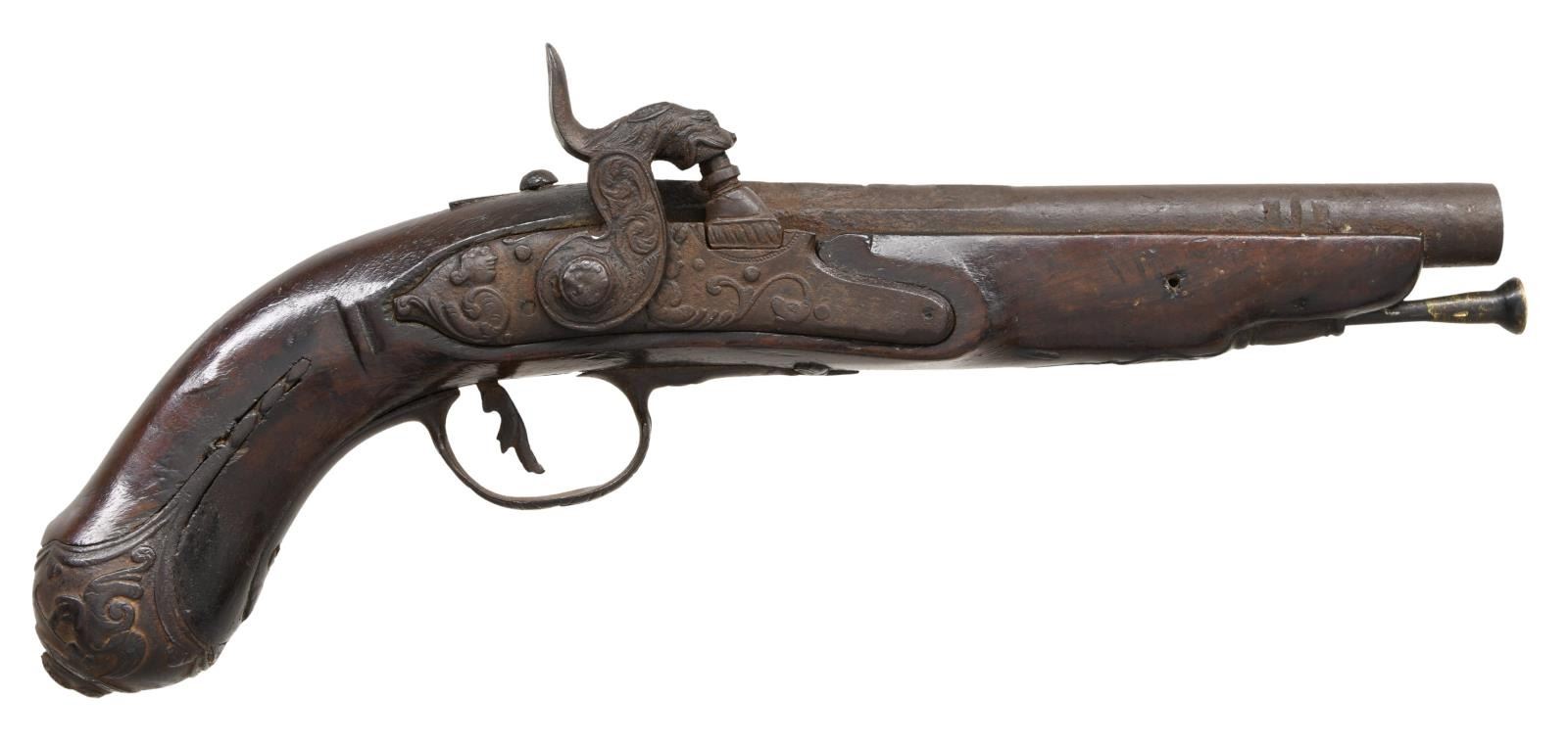 Cal. .54. S# NSN. Bbl 6 5/8". Relief decorated metal components featuring crude side view portraits of a man on the lock, bbl, trigger guard, and pommel. Dog head cock. Smooth wood stock. Later ramrod w/ brass end. CONDITION: metal components retain a dark brown patina w/ areas of old oxidation overall. Stock shows scattered marks from handling and storage w/ a repaired crack on the left side. (01-23611/MLW). ANTIQUE. $200-400.