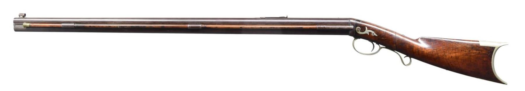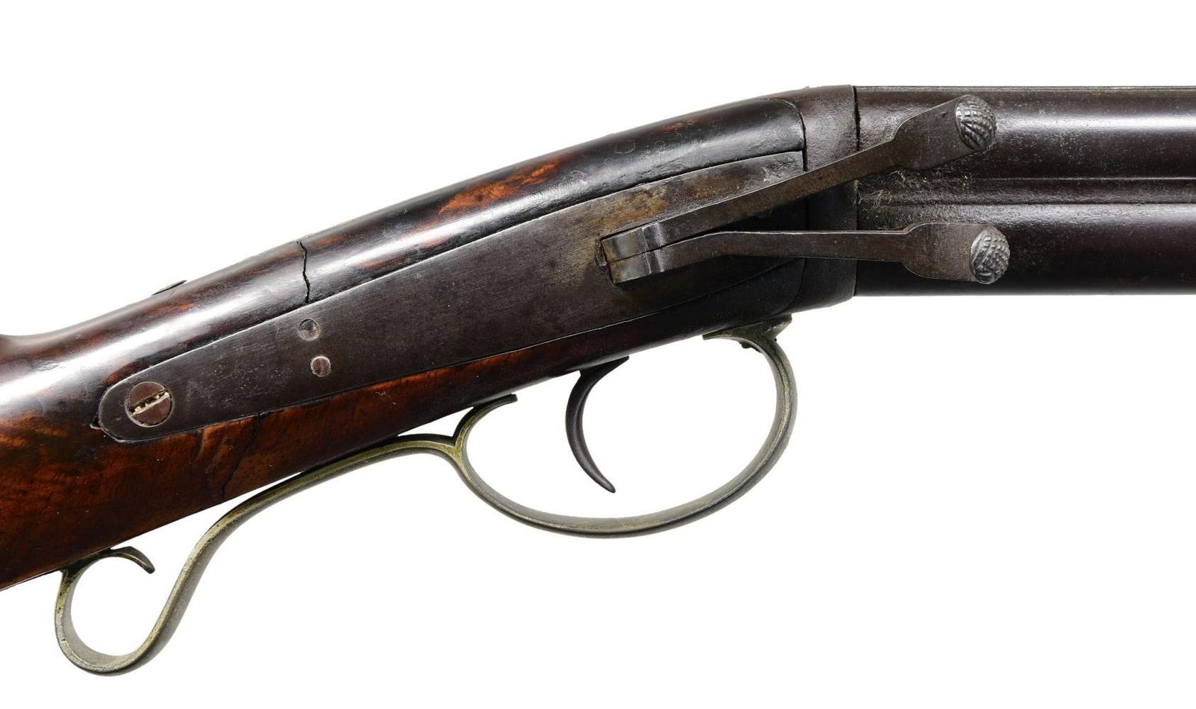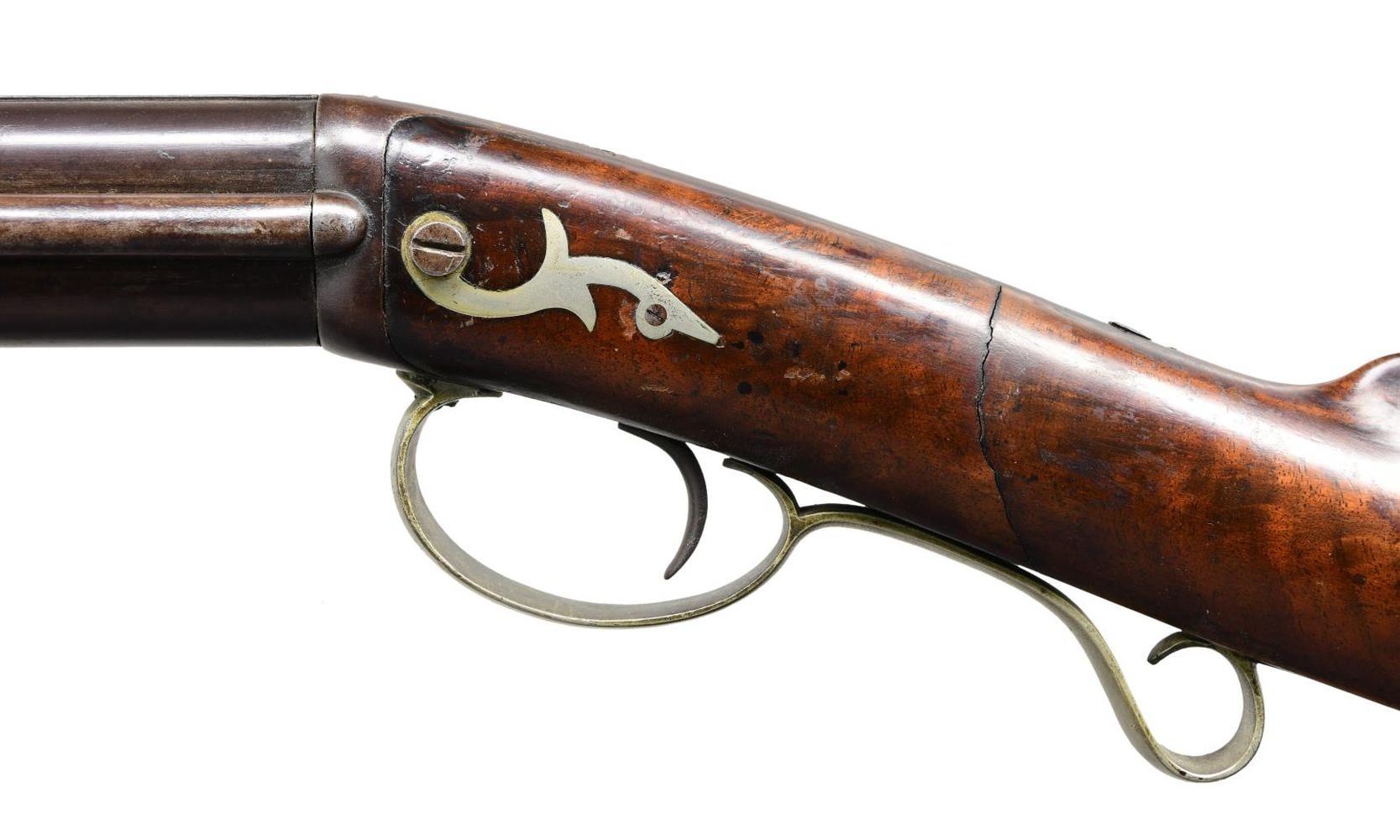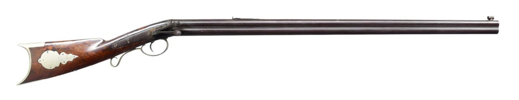 GUN. Cal. 40/60. NSN. Bbl. 32 1/4". Percussion side hammer O/U combination gun produced by an unknown mfg. Iron construction with single unmarked lockplate. Wood buttstock features a German silver buttplate, patchbox, trigger guard, and sideplate. Top bbl. tang exhibits a threaded hole, likely for an additional rear sight, which is absent. Hooded blade front sight with V-ntoch rear sight. CONDITION: iron components exhibit a dark gray patina, with areas of brown patina present when viewed beneath light. Bbls. exhibit corrosion around the percussion nipples. Action functions appropriately with a single or both hammers cocked. Stock exhibits scattered marks from handling and storage, with a repaired break that is present around the entire circumference of the wrist and receiver tangs. (01-25110/MLW). ANTIQUE. $1,500-2,000.