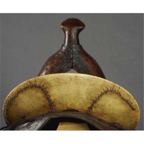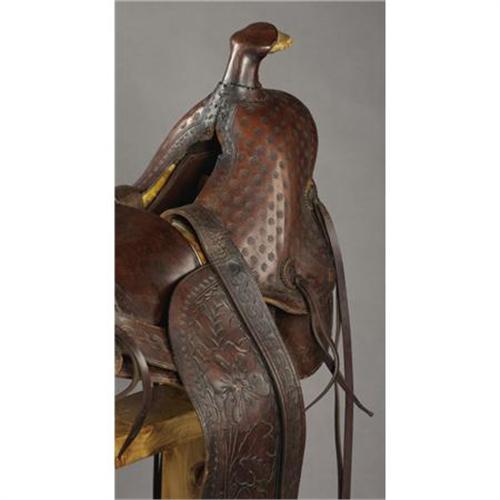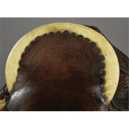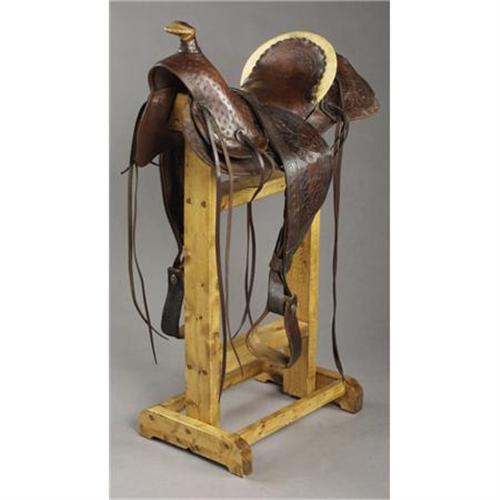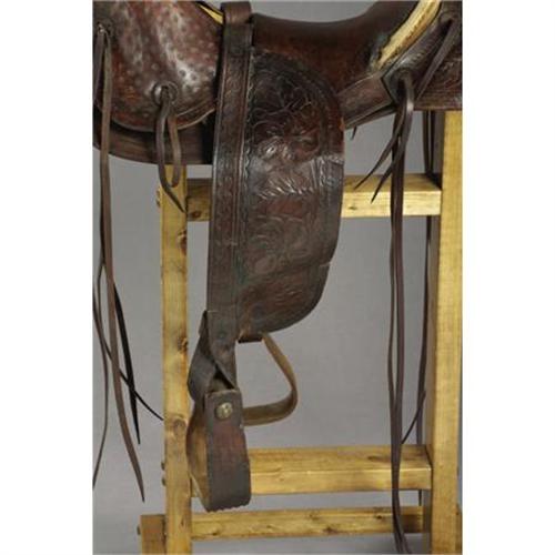 <B>UNMARKED ½ SEAT SADDLE CIRCA 1870's - 1880's</B></I> - Original wood stirrups, fenders and single rear jockey; stamped with large exposed cantle and horn with floral detail.<BR><BR><B>Condition:</B></I> Very good with slight age cracks but good color.<BR><BR><b>Shipping:</b> Other (oversized items, group lo (<a target="_blank" href="http://www.heritageauctions.com/common/shipping.php">view shipping information</a>)