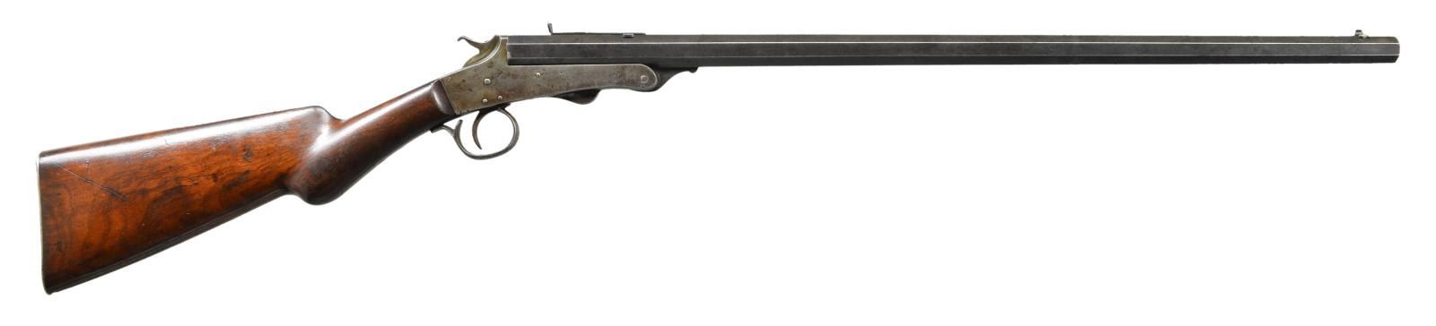Cal. 32 RF. S# 34. Bbl. 26 1/4" oct. w/ bead front sight & elevator rear sight, missing elevator. Tip up action w/ push lever opening on bottom. Rnd. knob pistol grip stock w/ checkered metal buttplate. CONDITION: fair blue fading to brown w/ edge wear, peppery oxidation & marks. Fair brown patina receiver w/ peppery oxidation. Good wood varnish w/ marks & sm. crack. Fair worn pitted bore. (22-2768/MD). CURIO. $250-350.